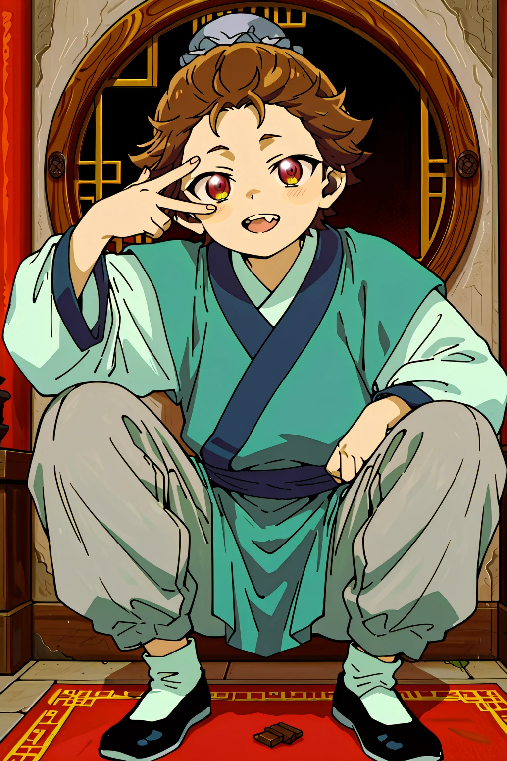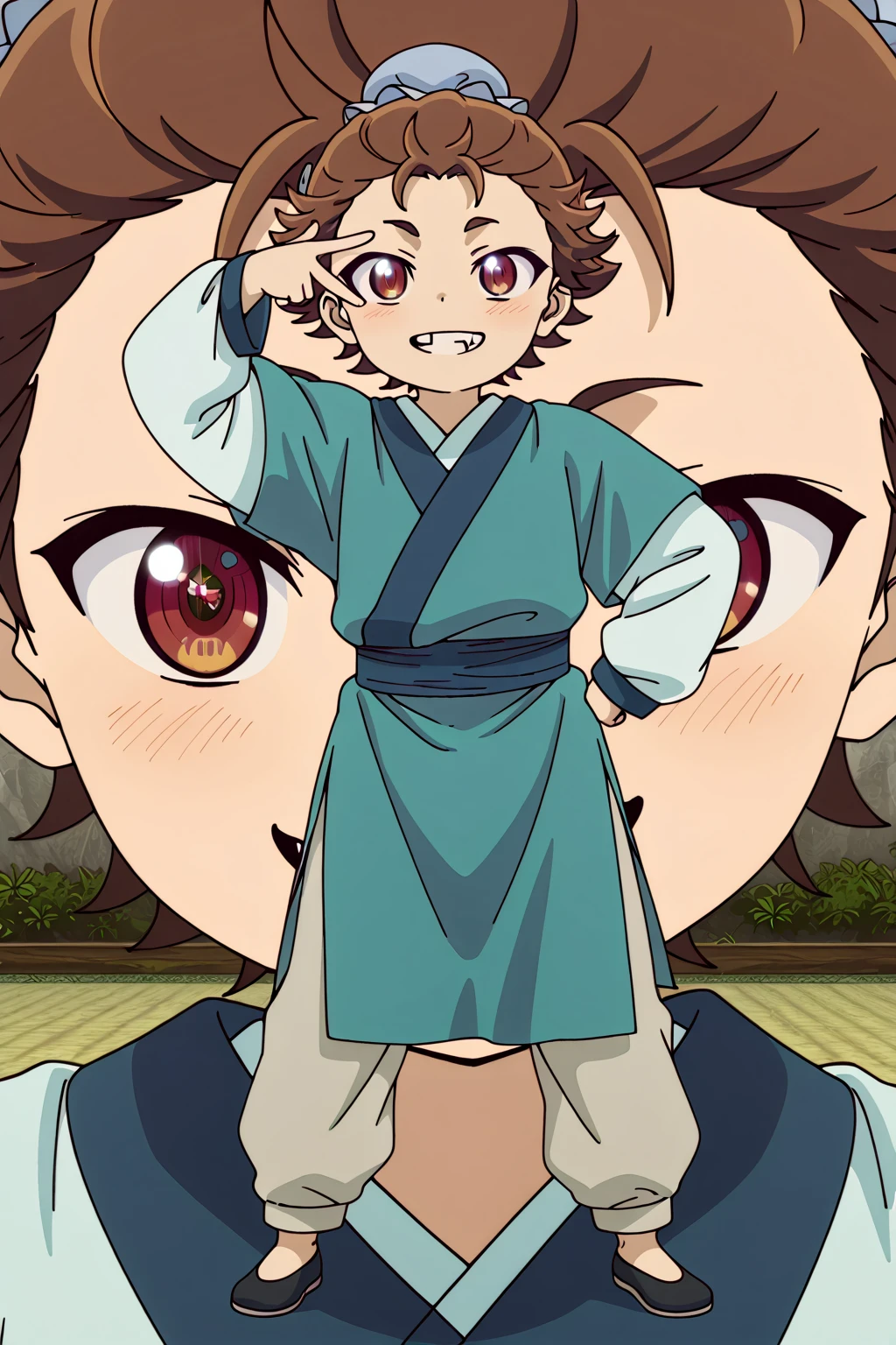 - Hair: short hair, brown hair, messy hair, spiky hair, topknot, small bun, hair bun, cloth-wrapped bun