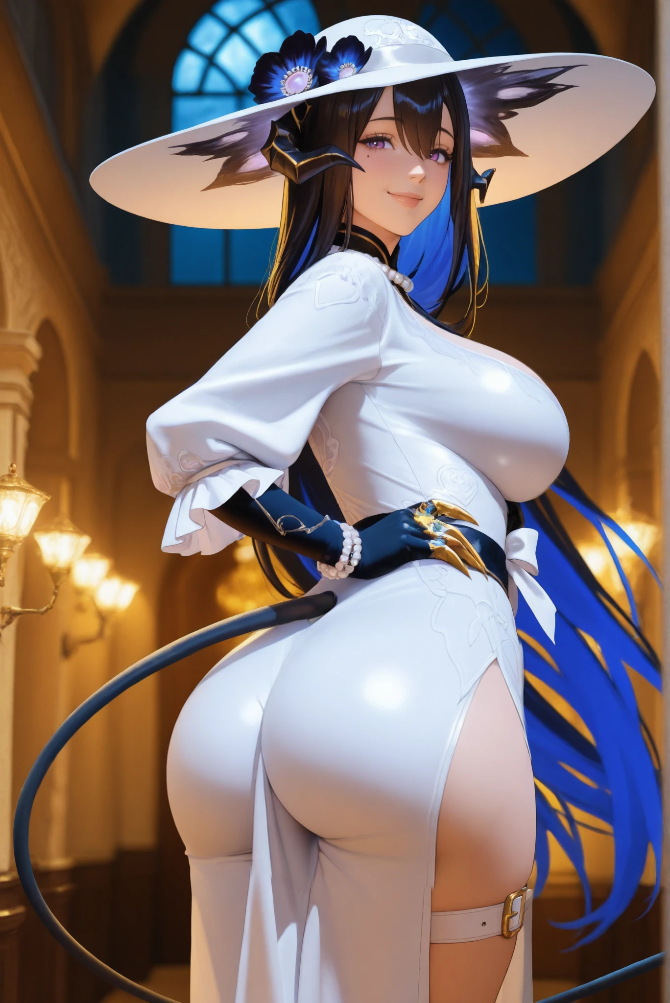 Main Prompt: mature female, curvy, purple eyes, very long hair, multicolored hair, black hair, blue hair, hair between eyes, black demon horns, low horns, mole under eye, demon tail, colored inner tail, large breasts, slim waist, wide hips,