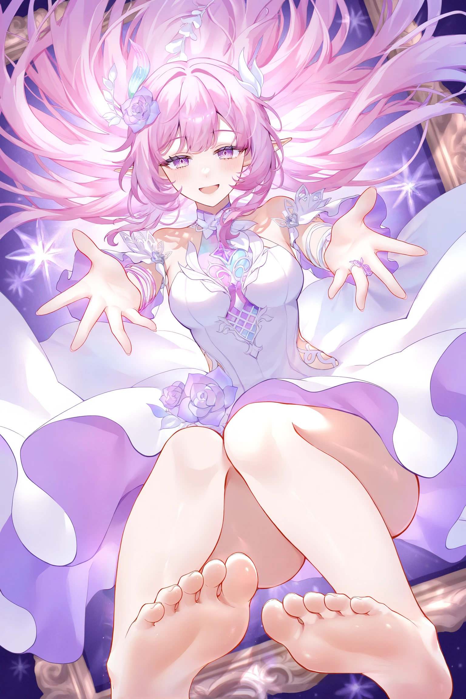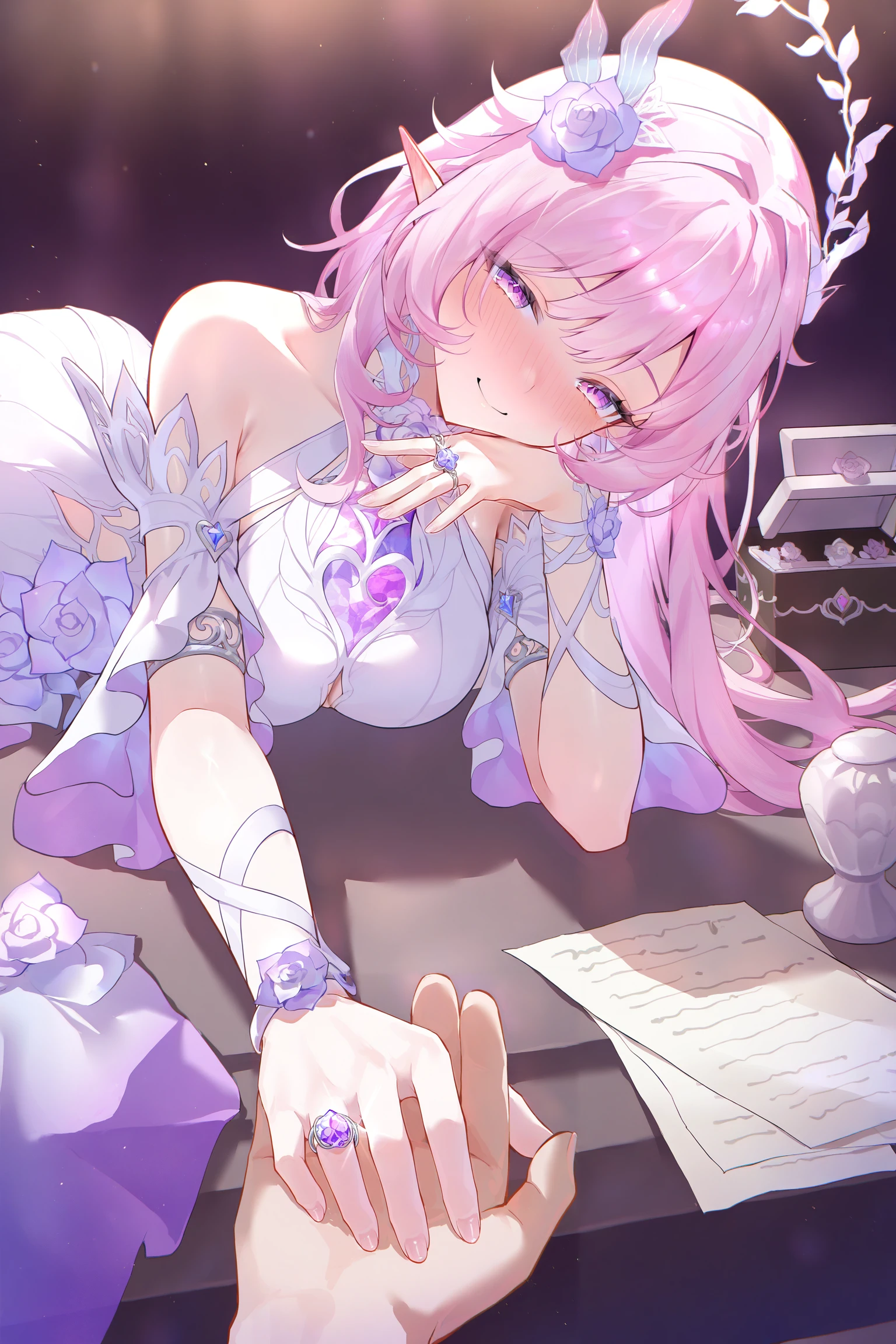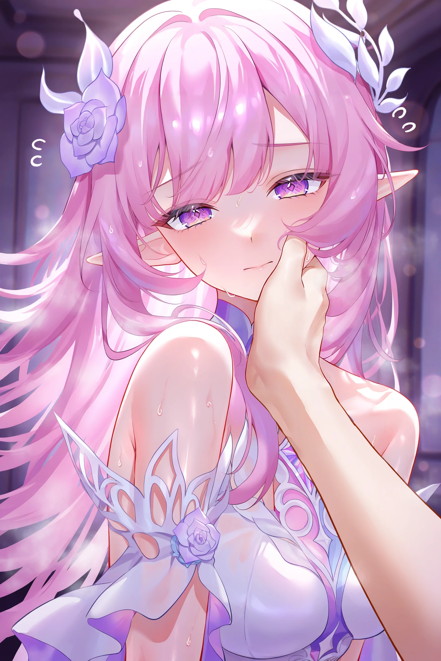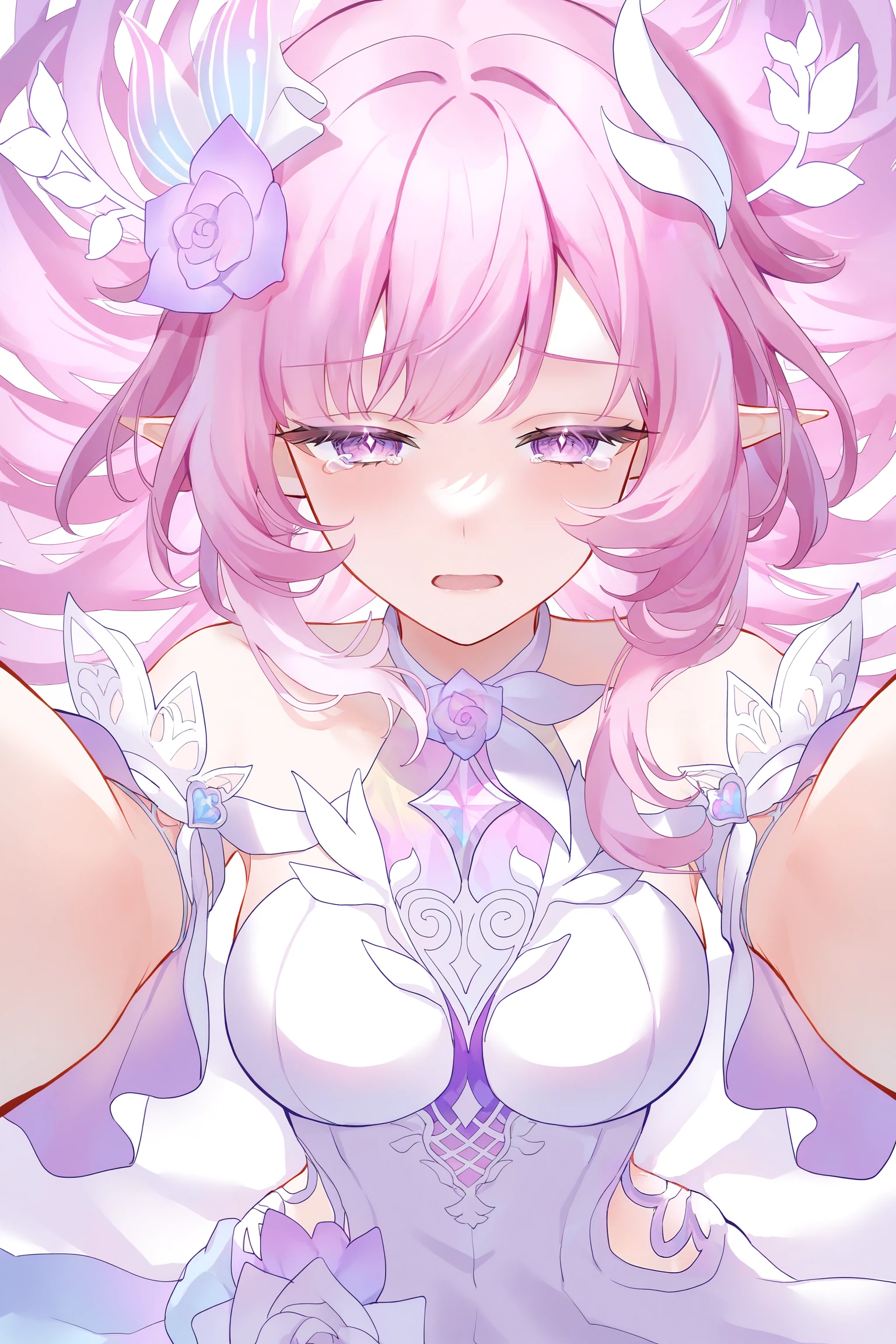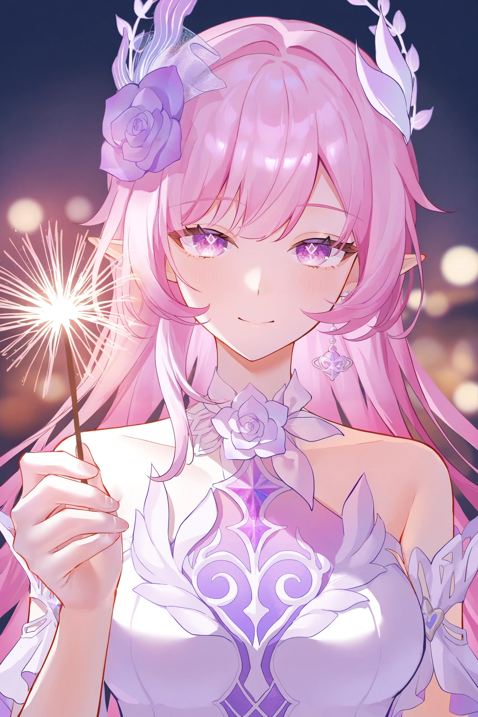 Trigger Word: xiliajn,1girl,solo,flower,long hair,pink hair,hair ornament,bare shoulders,pointy ears,dress,white dress,pink eyes,purple eyes,elf,hair flower,rose,jewelry,purple flower,white flower,diamond-shaped pupils,