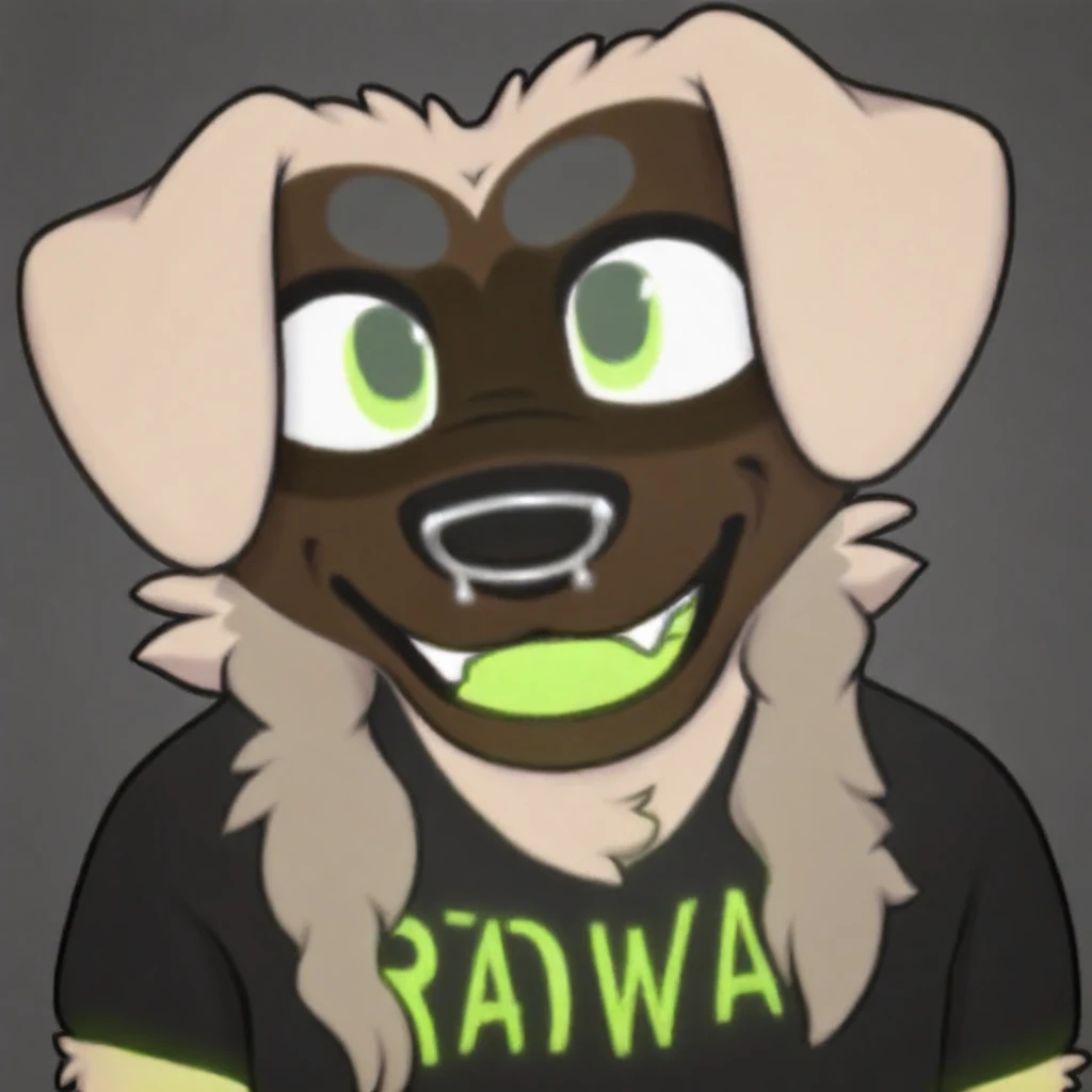 Brown_face, tan fur, dog, furry, anthro, male, green eyes, ear piercing, nose piercing