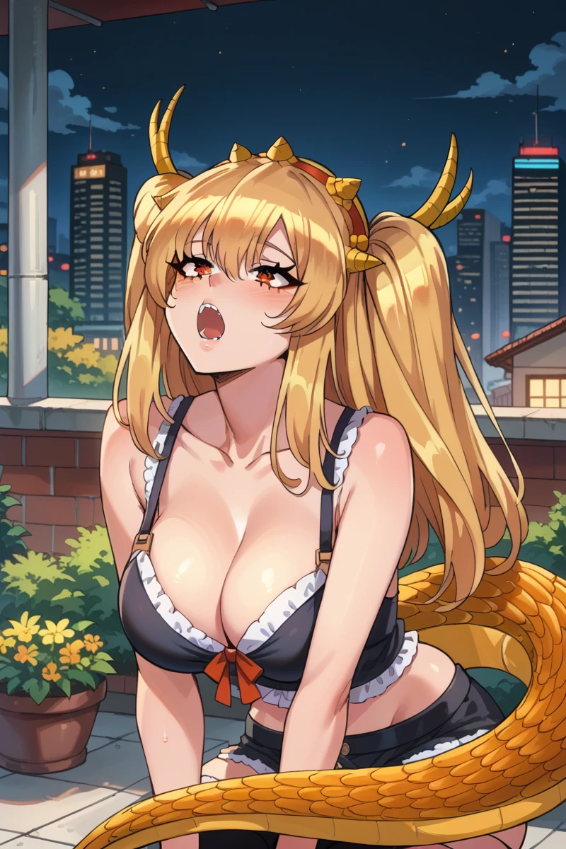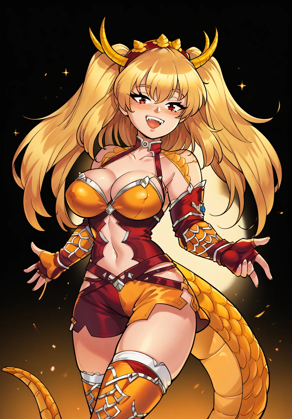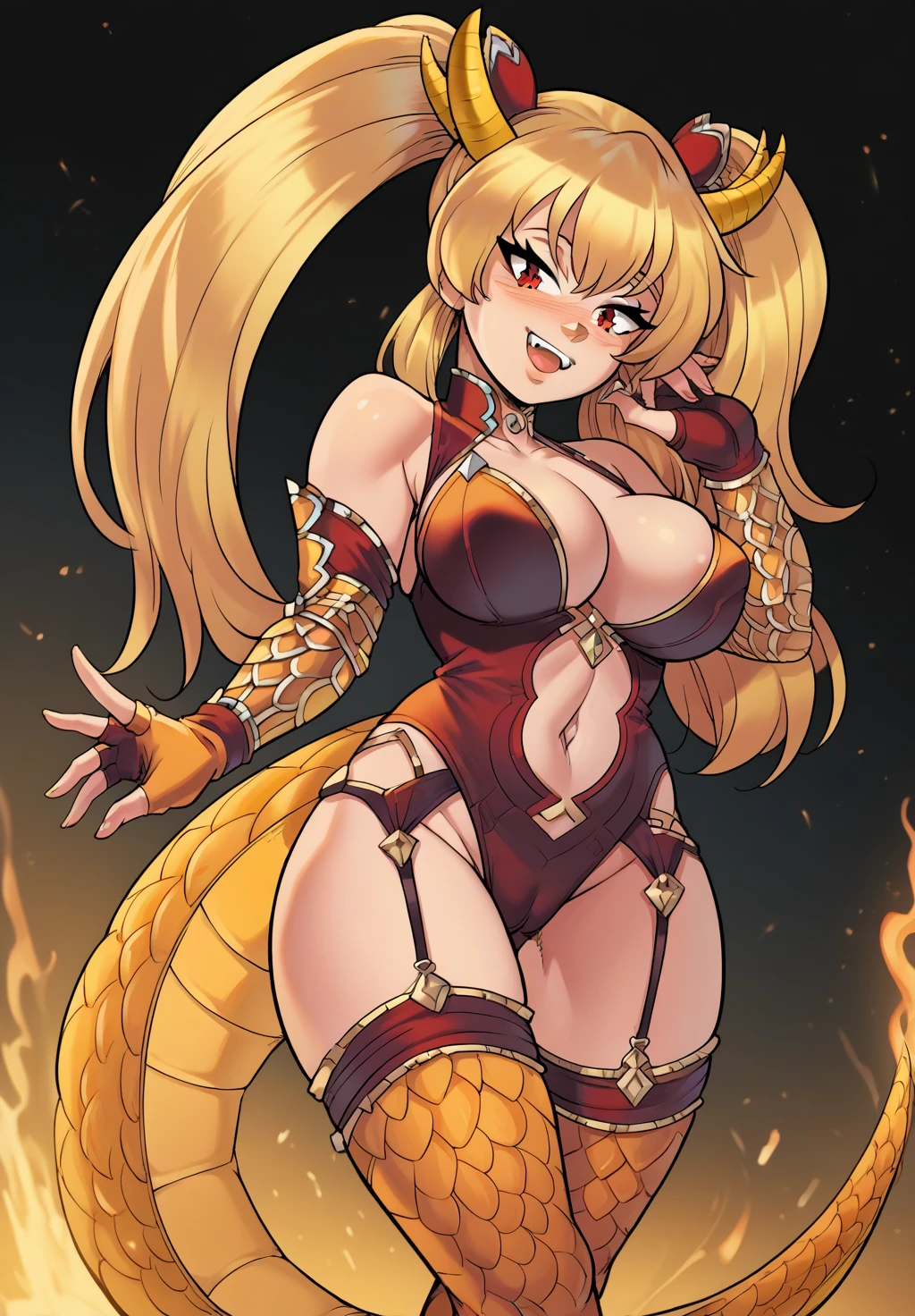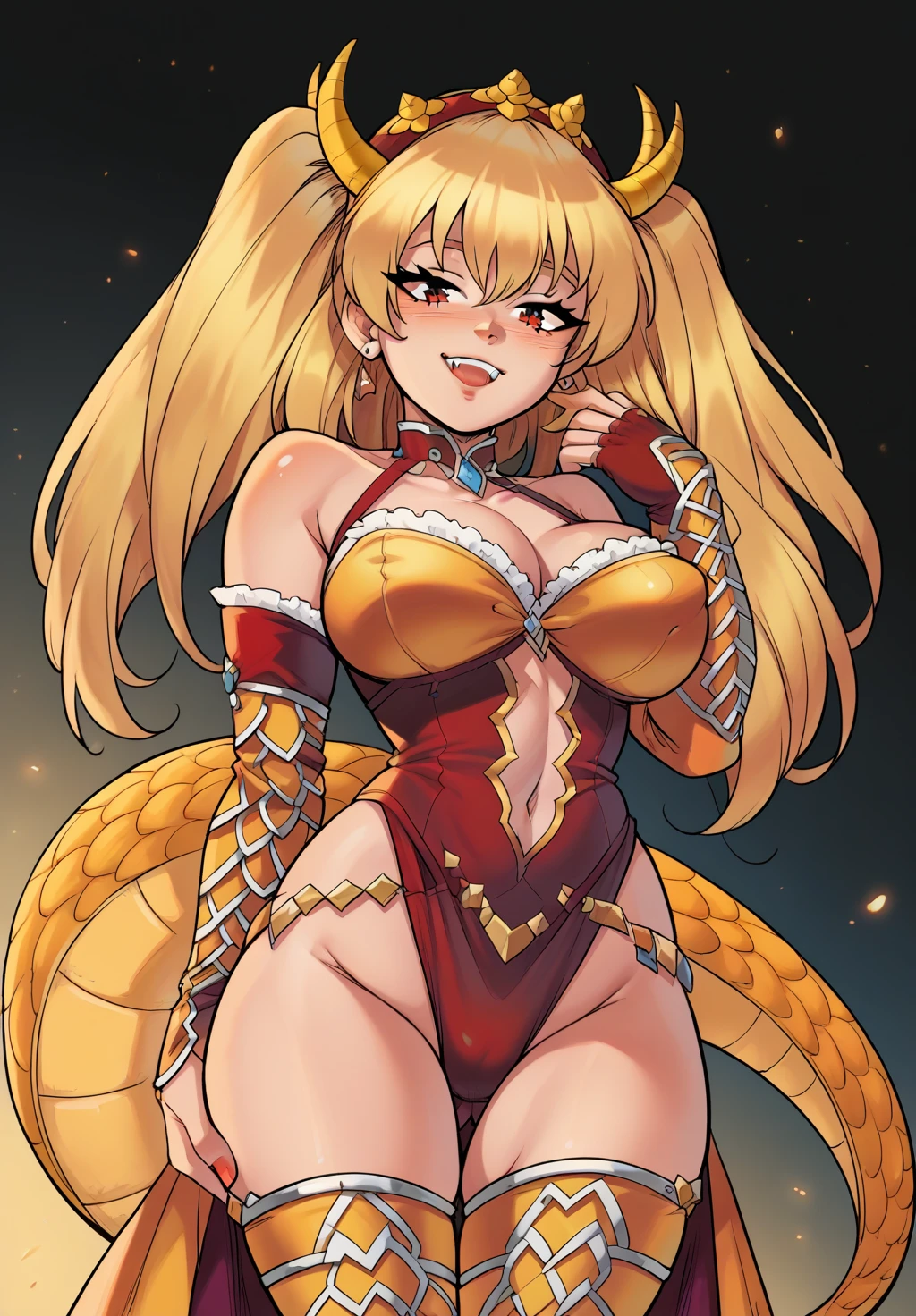 stacy, dragon girl, golden dragon tail, golden horns, blonde hair, red eyes, large breasts,