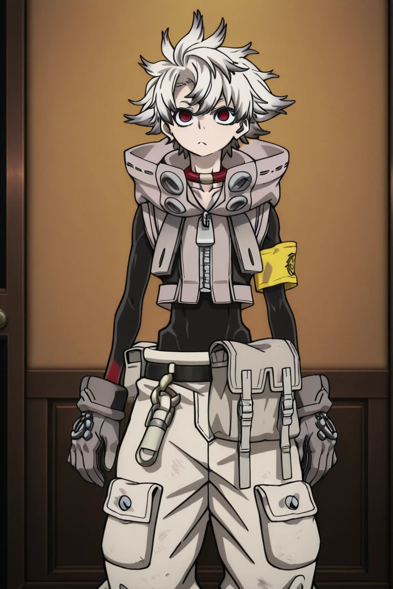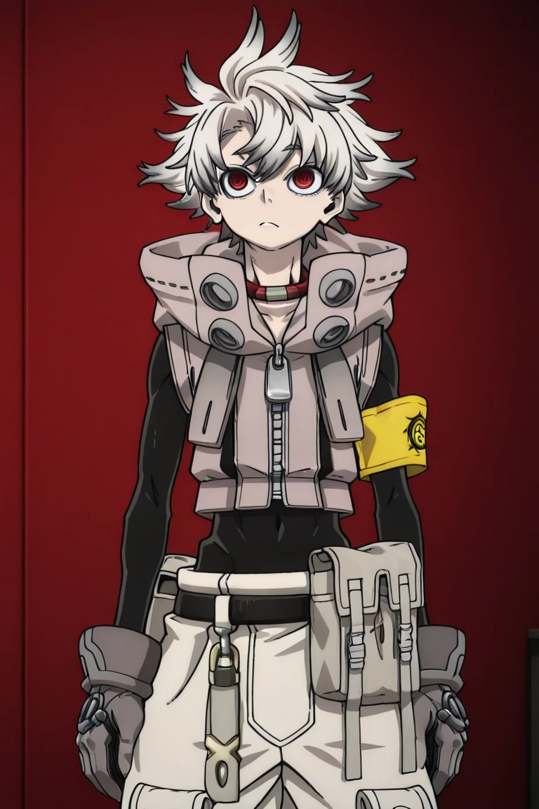 rudo_surebrec, grey hair, white hair, multicolored hair, two-tone hair, spiked hair, red eyes, ringed eyes, baggy pants, belt pouch, belt, grey gloves, hooded vest, yellow armband, zipper, 1boy,