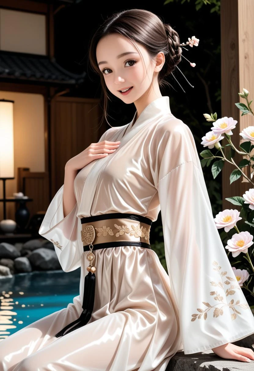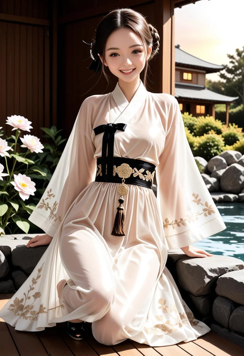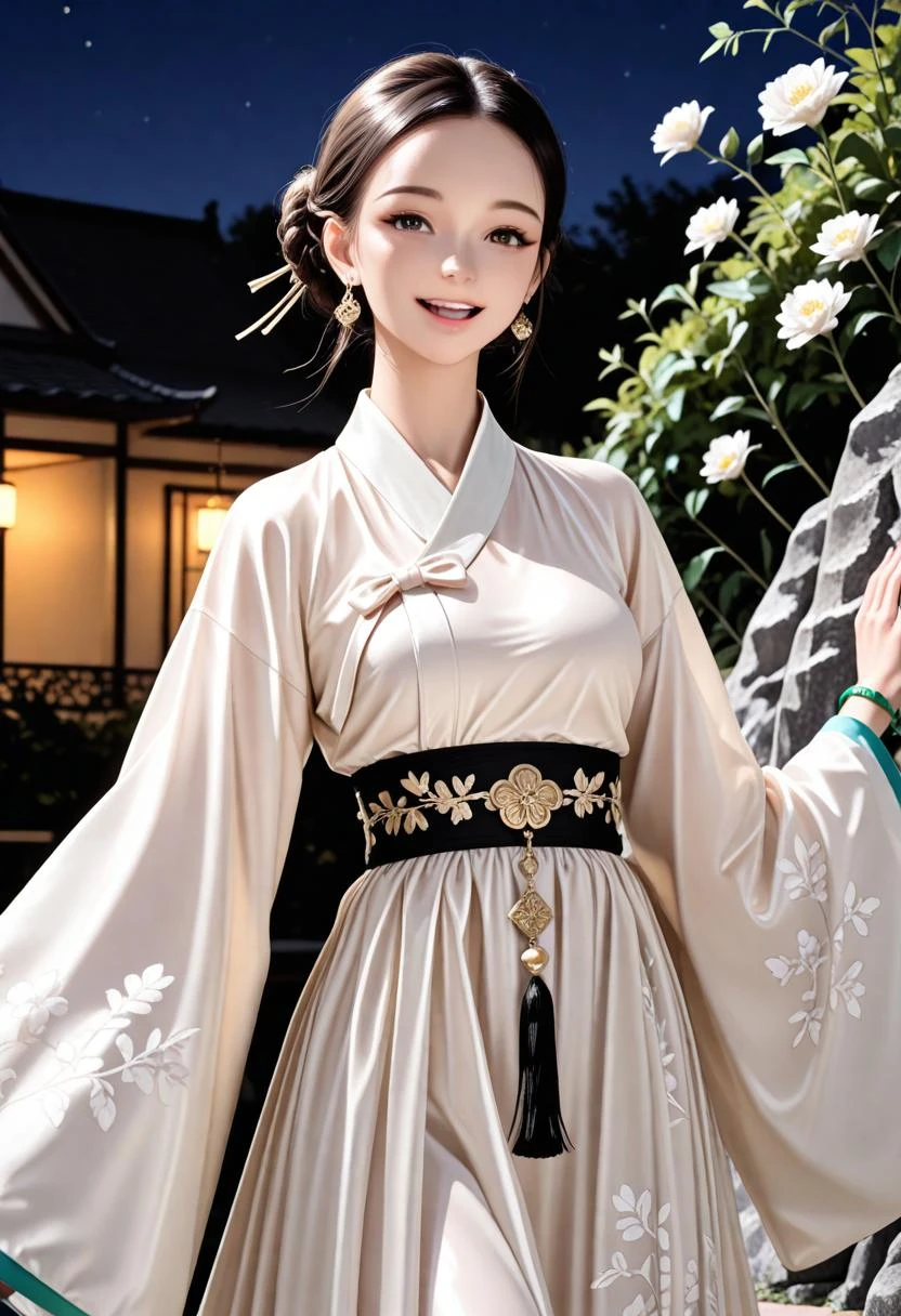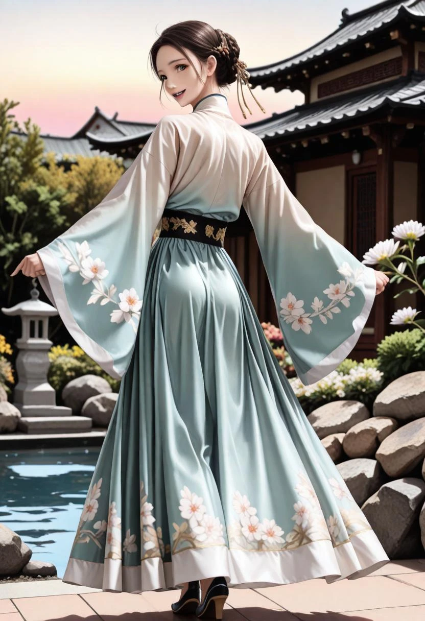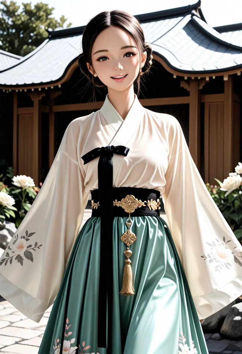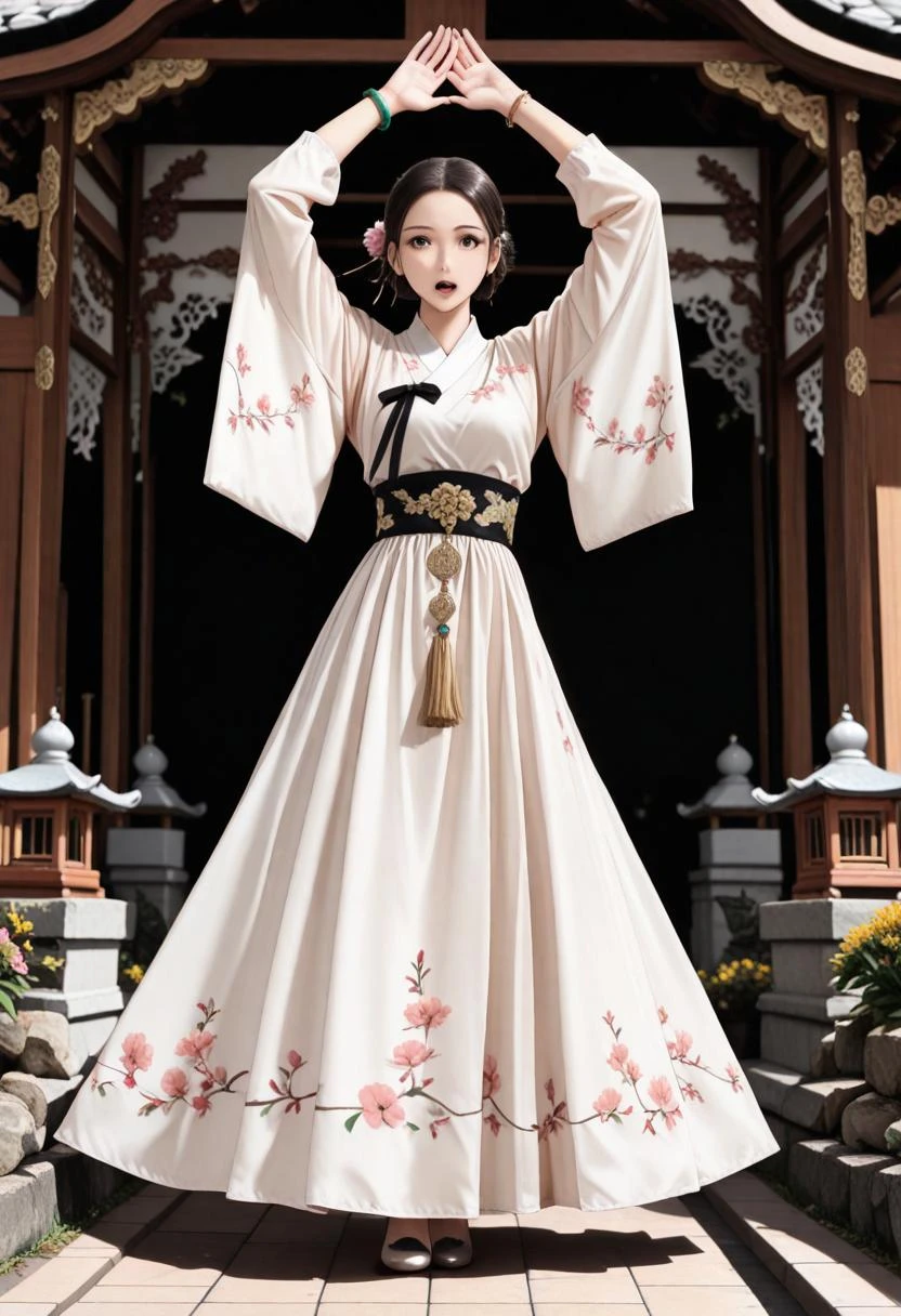 d063, sheer tang hanfu dress, shinny satin dress, white floral wrap_jacket, blue cuffs, long blue floral skirt, gold lace waist_belt, (perfect hands:1.3),