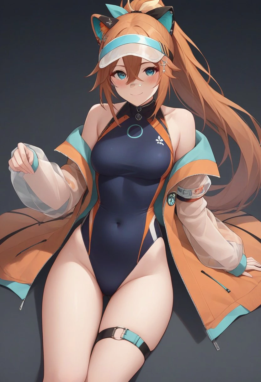 new outfit: shiki2nd, ponytail, long hair, bandaid on nose, jacket, jacket partially removed, visor cap, hair between eyes, see-through, see-through sleeves, swimsuit, one-piece swimsuit, navel, thigh strap, hair ornament, clothing cutout