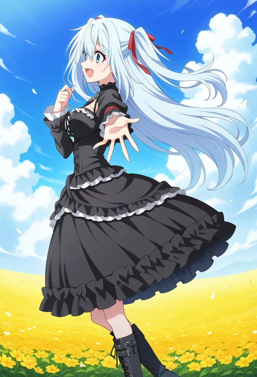 1girl, ashe_(underthemoon), long hair, light blue hair, blue eyes, breasts, hair ribbon, two_side_up, red ribbon, gothic fashion, gothic dress, black dress, black boots,