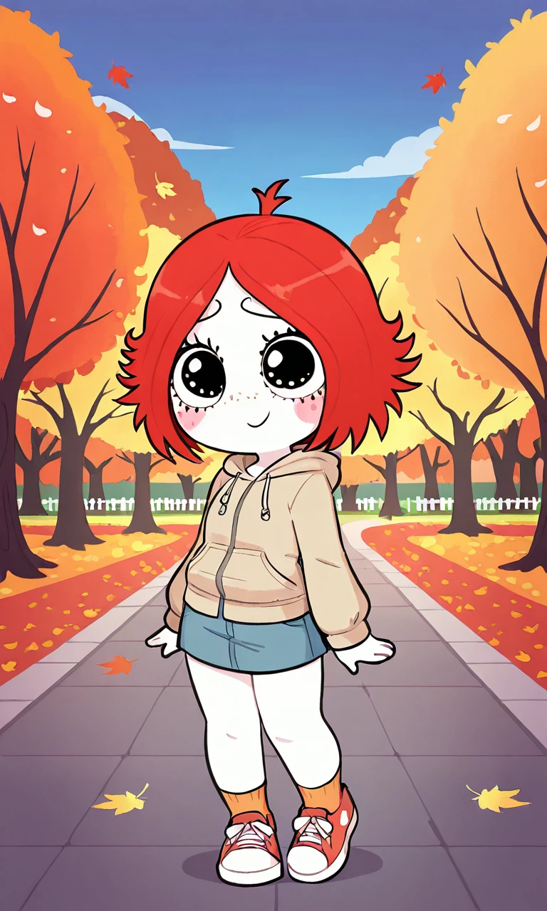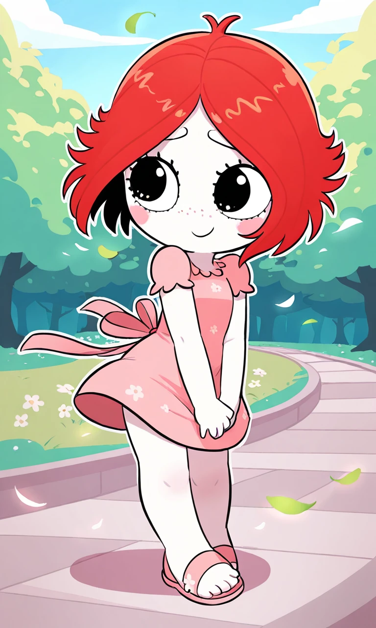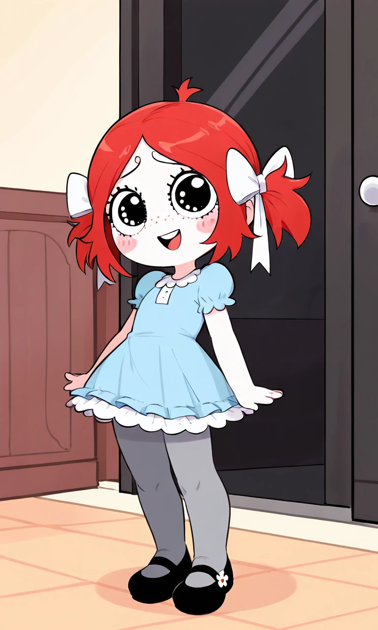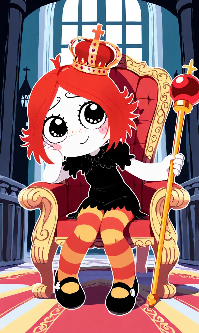 Base prompt: rubygloom_ruby, 1girl, solo, chibi, short hair, red hair, ahoge, eyelashes, black eyes, blush stickers, smile, freckles, white skin