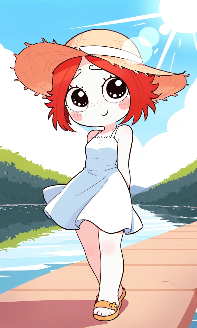 Base promt: 1girl, solo, chibi, short hair, red hair, ahoge, black eyes, blush stickers, smile, freckles, white skin