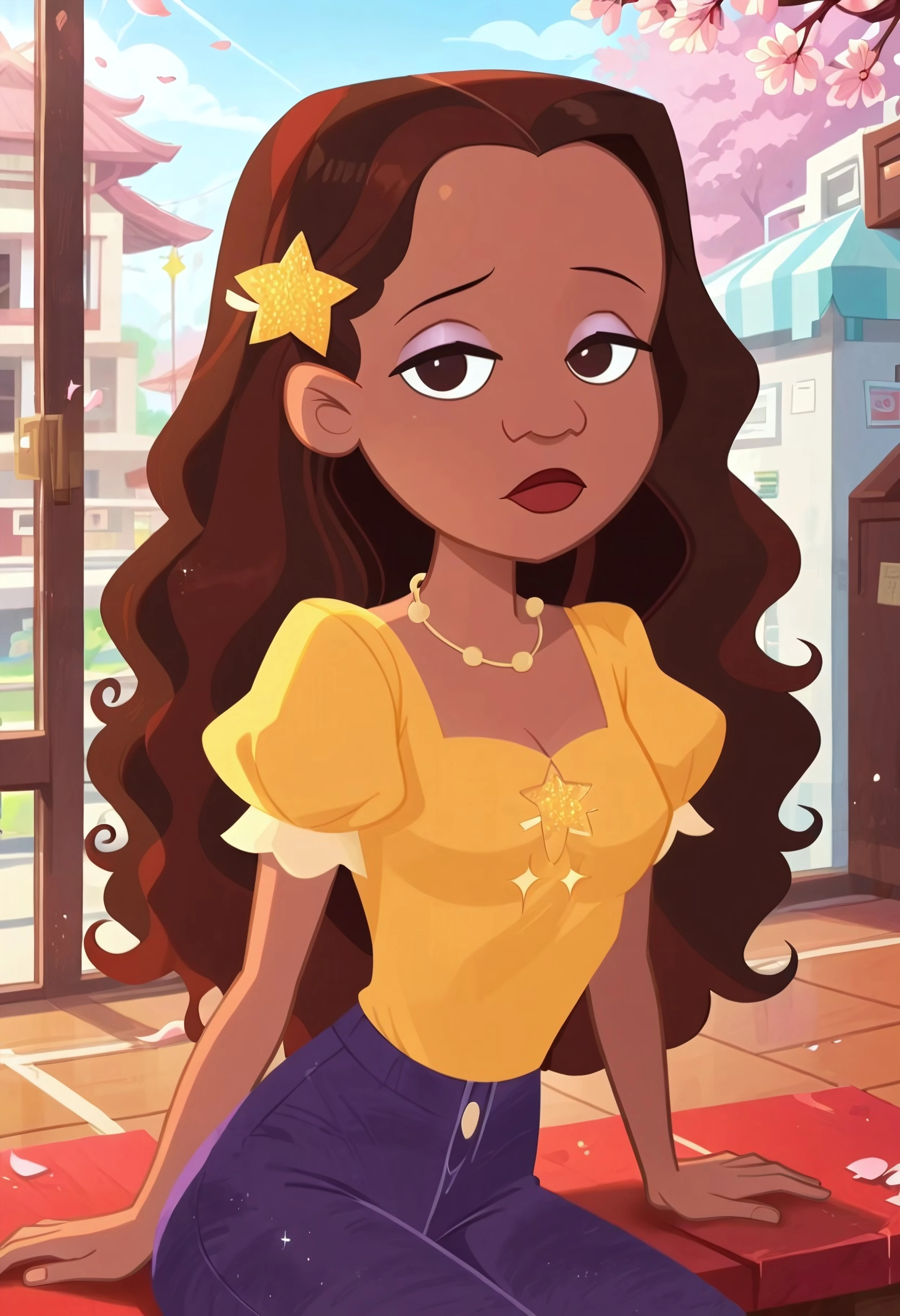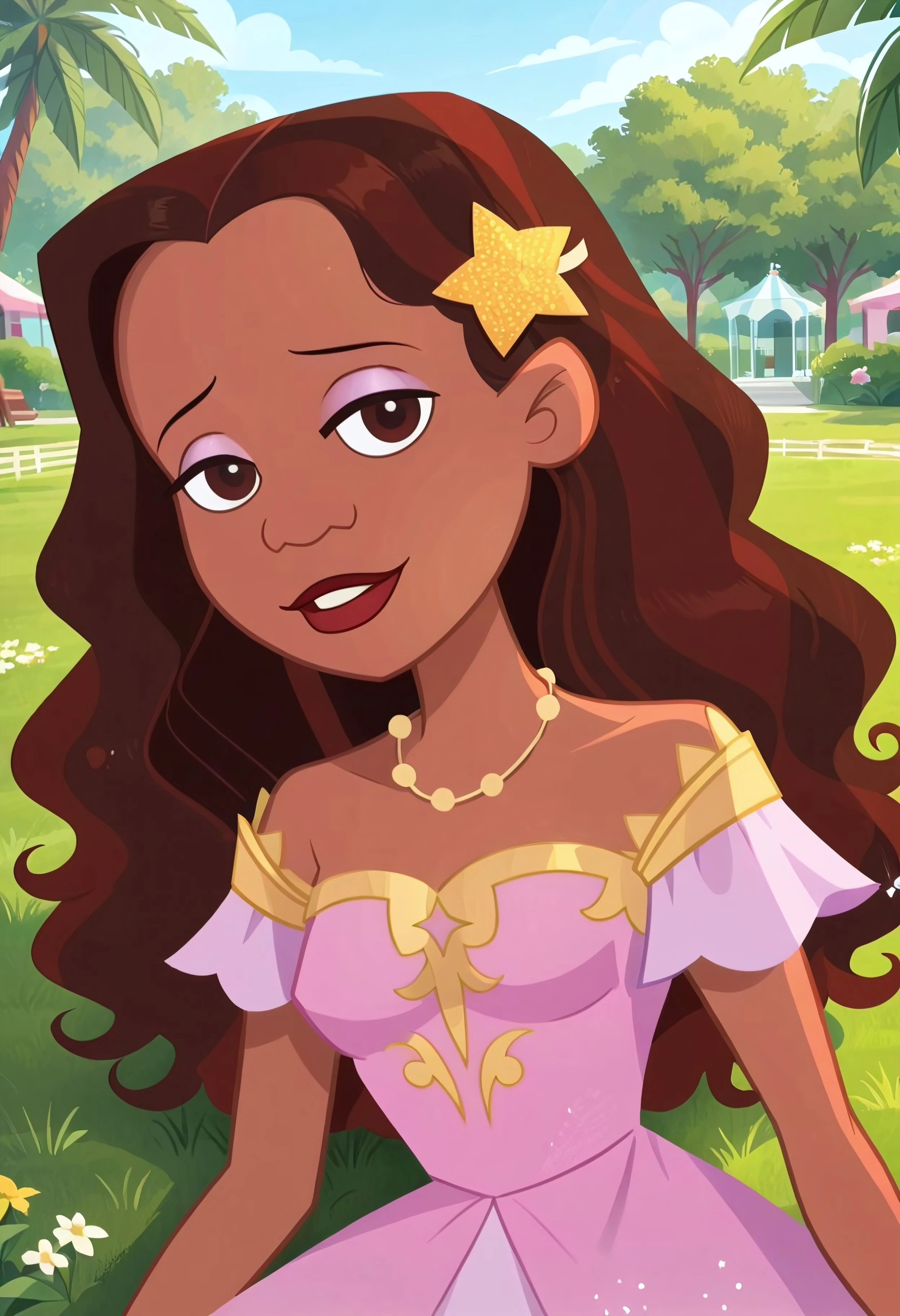 L4Br3Av3, brown hair, long hair, hair ornament, star hair ornament, brown eyes, star (symbol), necklace, jewelry, makeup, dark-skinned female, dark skin