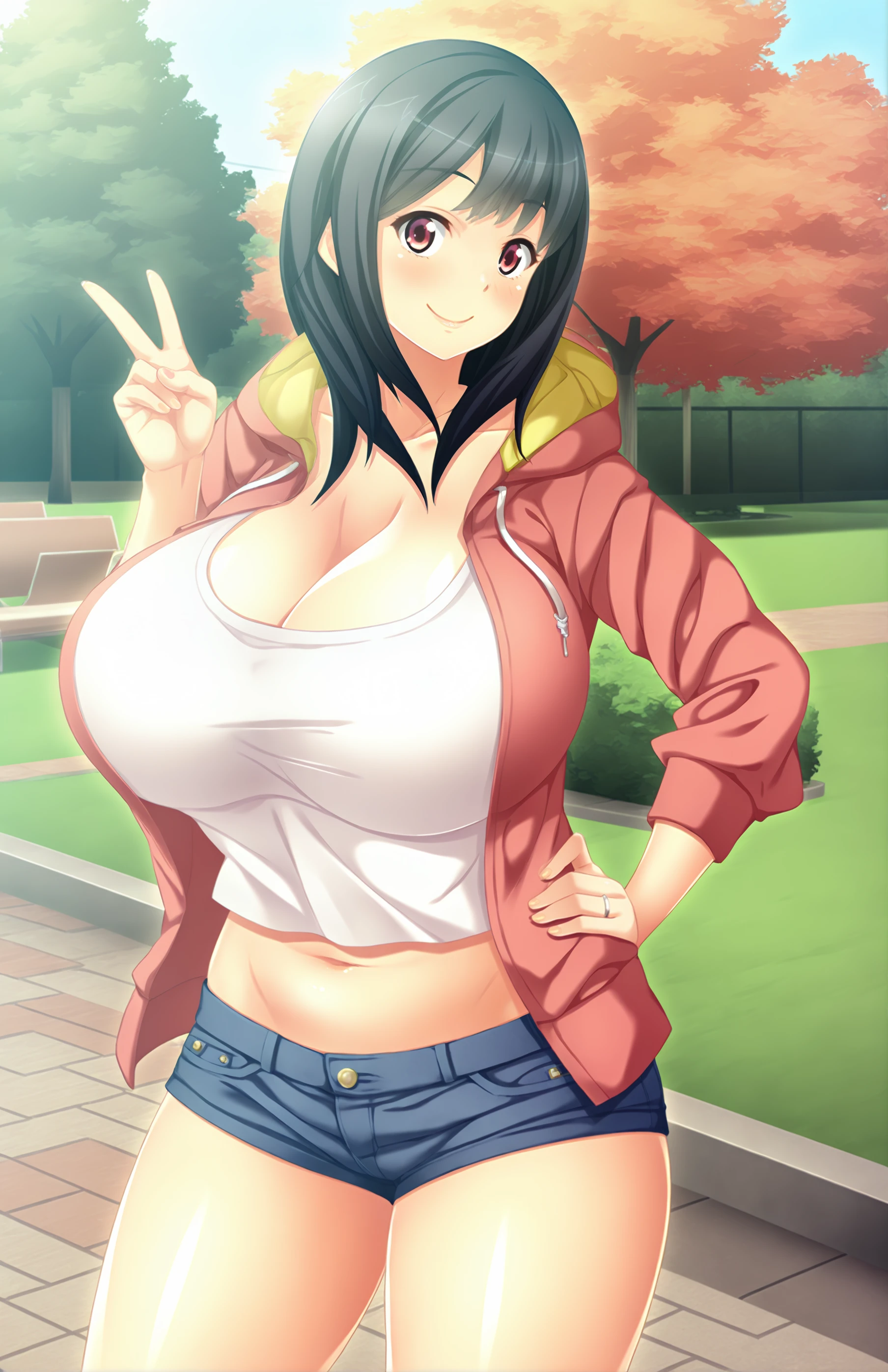 MinaseSuzuka, long hair, breasts, black hair, white shirt, red eyes, navel, cleavage, jacket, hood, huge breasts, denim shorts, short shorts, hoodie