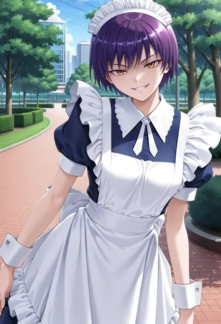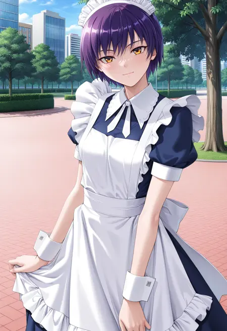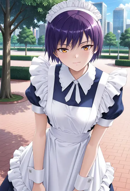 masterpiece, absurdres, newest, 1girl, solo, c-mika, purple hair, short hair, orange eyes, maid headress, blue dress, white apron, short sleeves, detached collar, wrist cuffs, looking at viewer, looking at viewer, day, outdoors, city, tree, park, portrait, upper body,Negative prompt ❌: