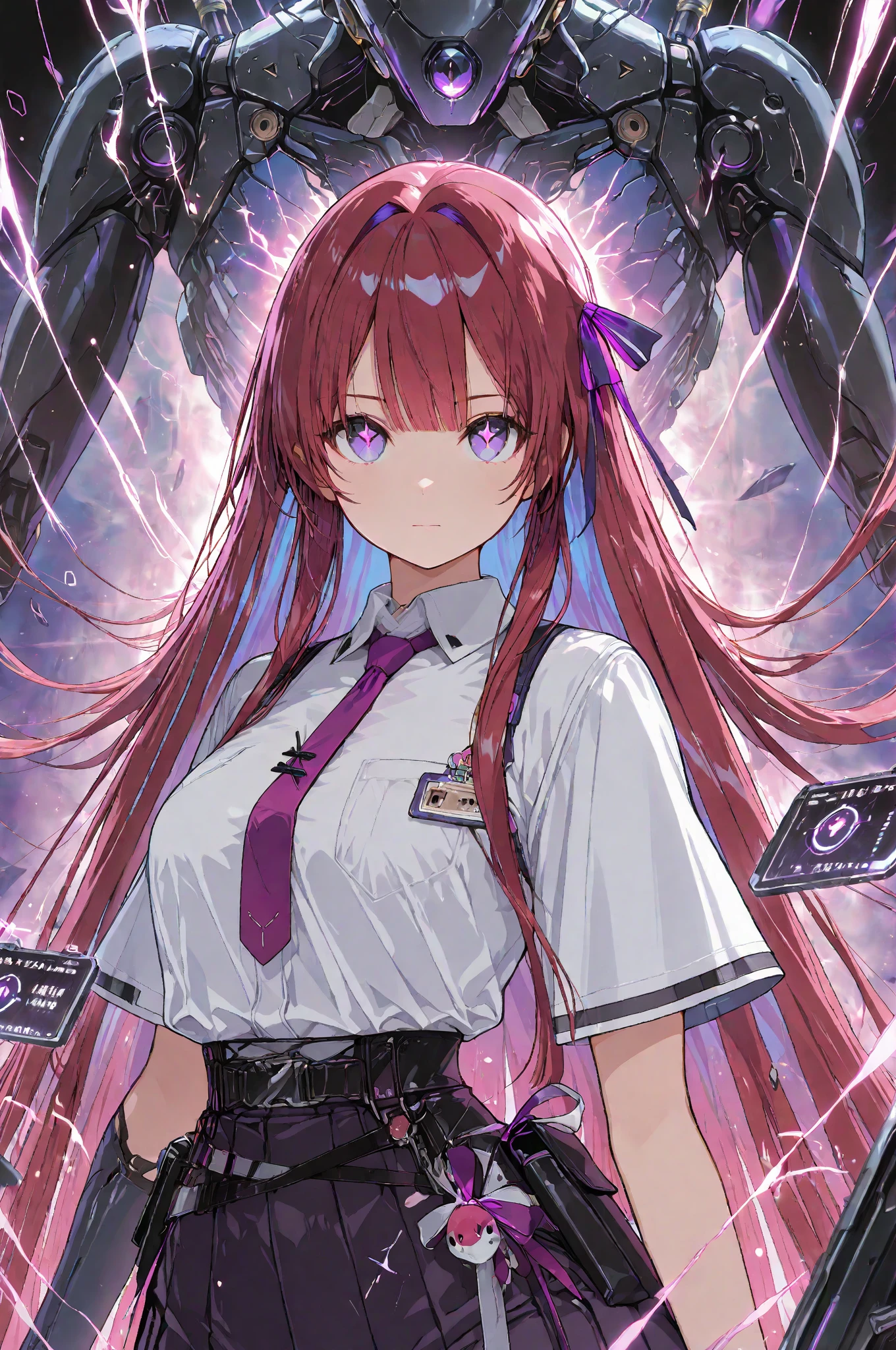 Rei is a character from the Korean webtoon/manhwa series Chaos Zero Nightmare. She is characterized by her long two-toned hair (red and purple), sharp purple eyes with unique pupils, and a highly detailed uniform modified with extensive tactical gear, notably a single mechanical arm.