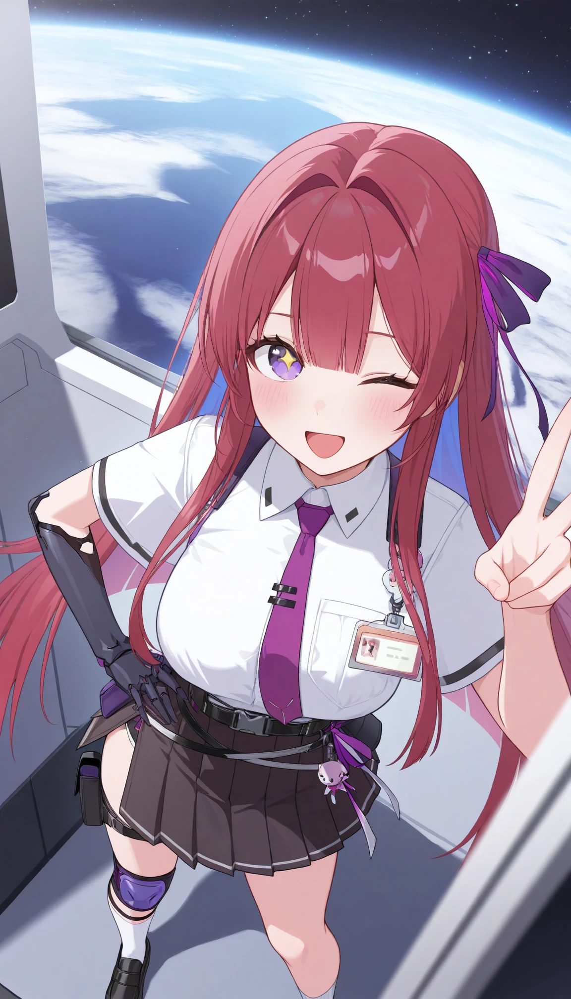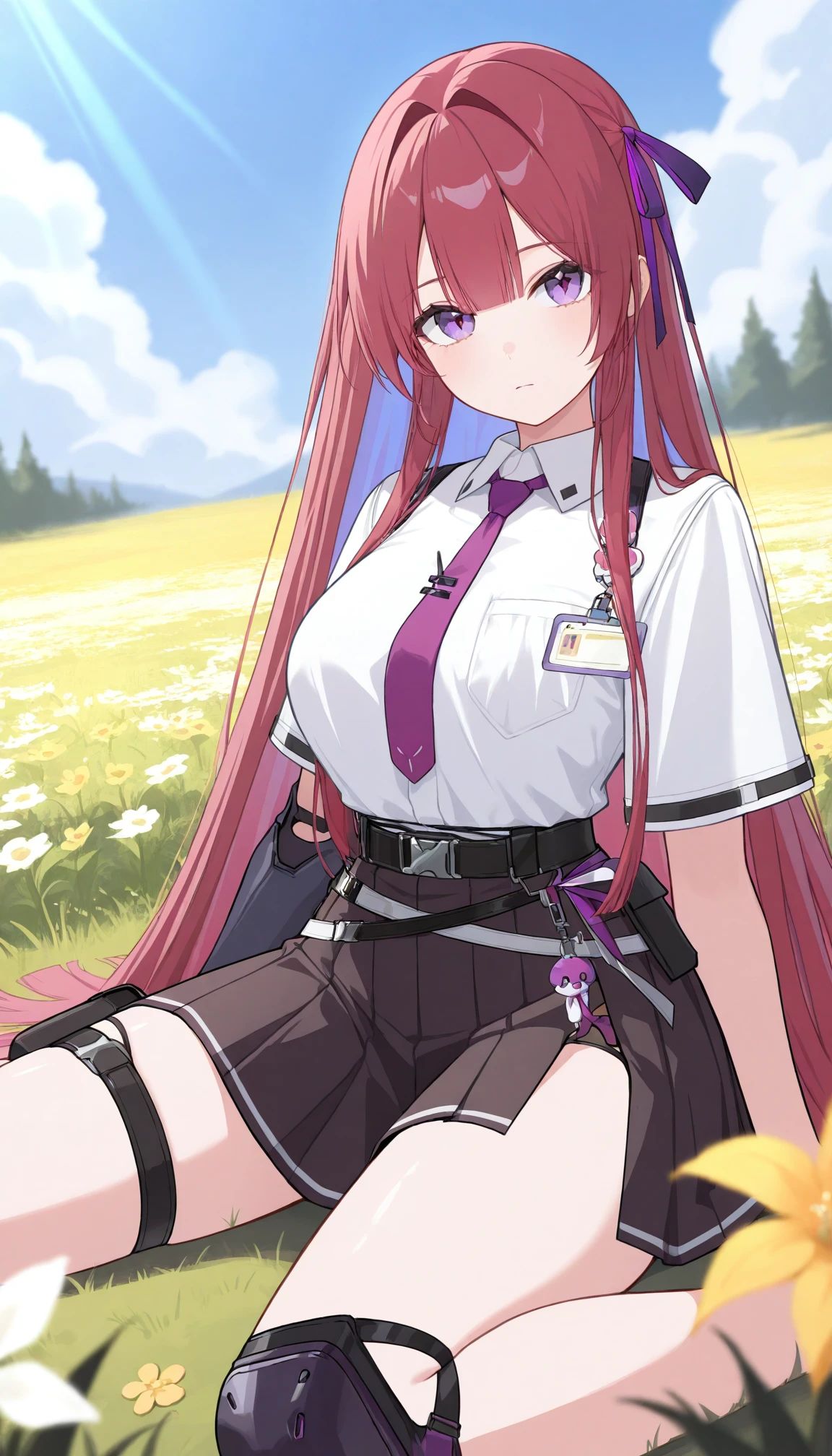 Top/Uniformwhite shirt, collared shirt, short sleeves, breast pocket, purple necktie, tie clip, id cardThe base school uniform elements.