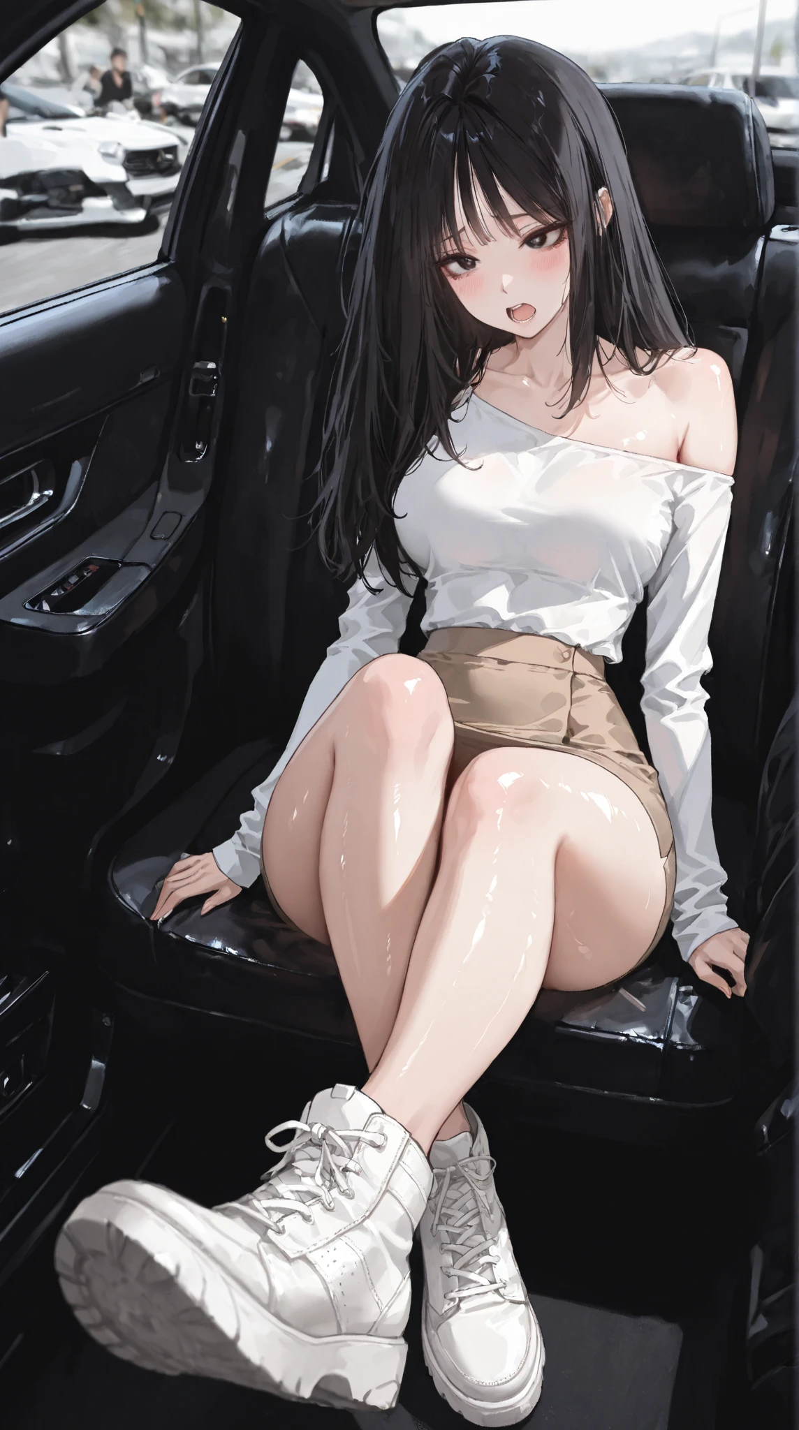 bare_shoulders, collarbone, white_shirt, long_sleeves, thighs, miniskirt, brown_skirt, off_shoulder, white_footwear,