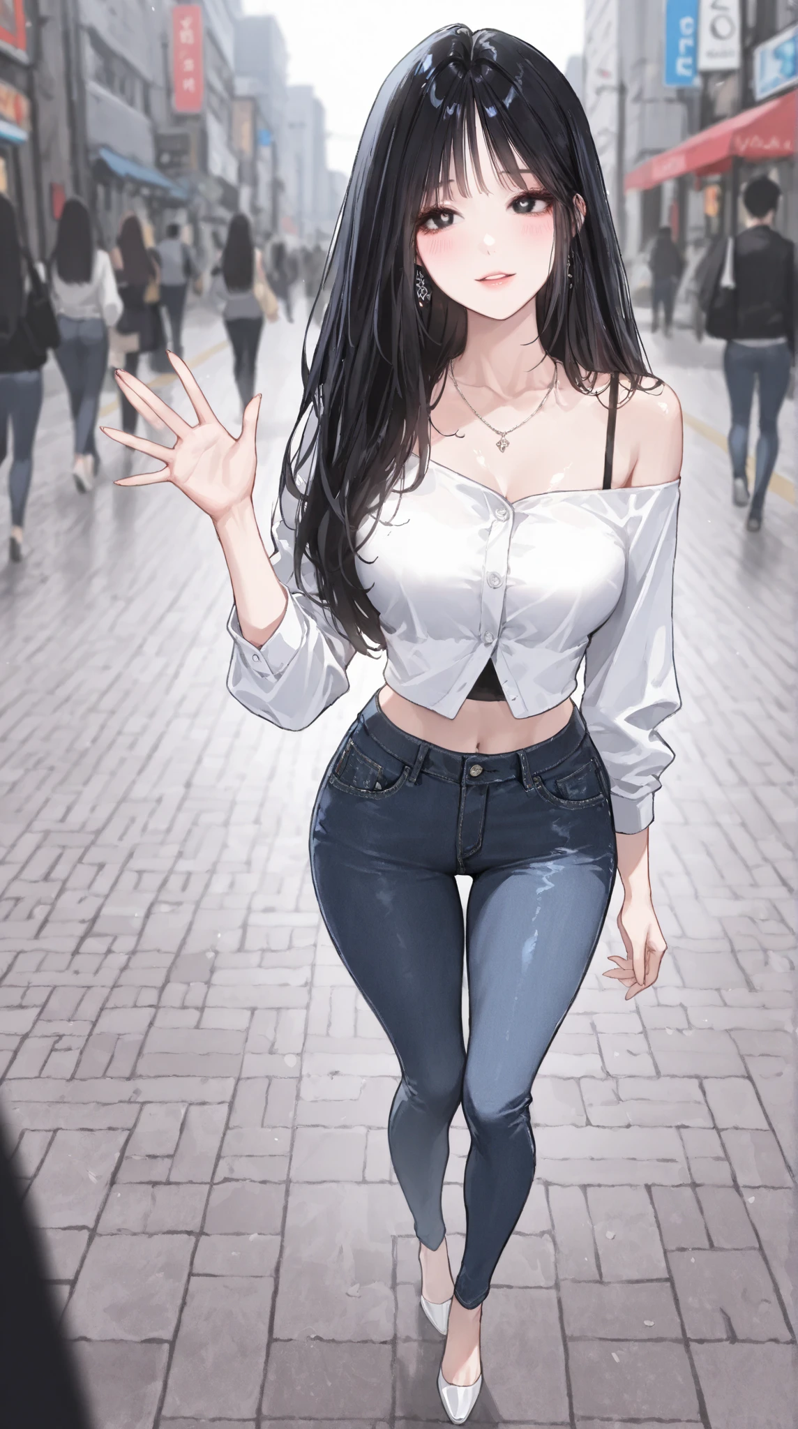 bare_shoulders, jewelry, necklace, white_buttoned_shirt, midriff, pants, off_shoulder, denim, jeans, off-shoulder_shirt, blue_pants, white_heels,