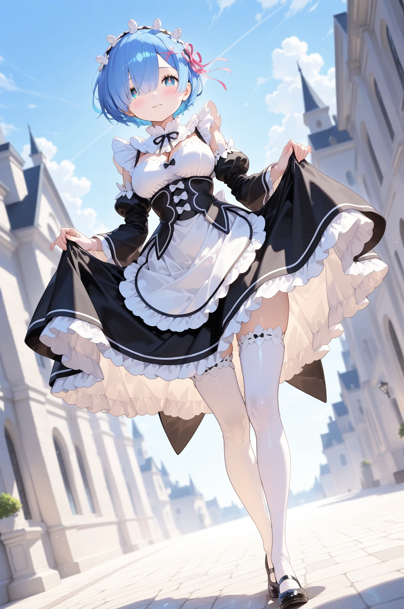 frills, roswaal_mansion_maid_uniform, detached_sleeves, white_thighhighs, maid_headdress, black_ribbon, neck_ribbon, detached_collar, frown, frilled_skirt,