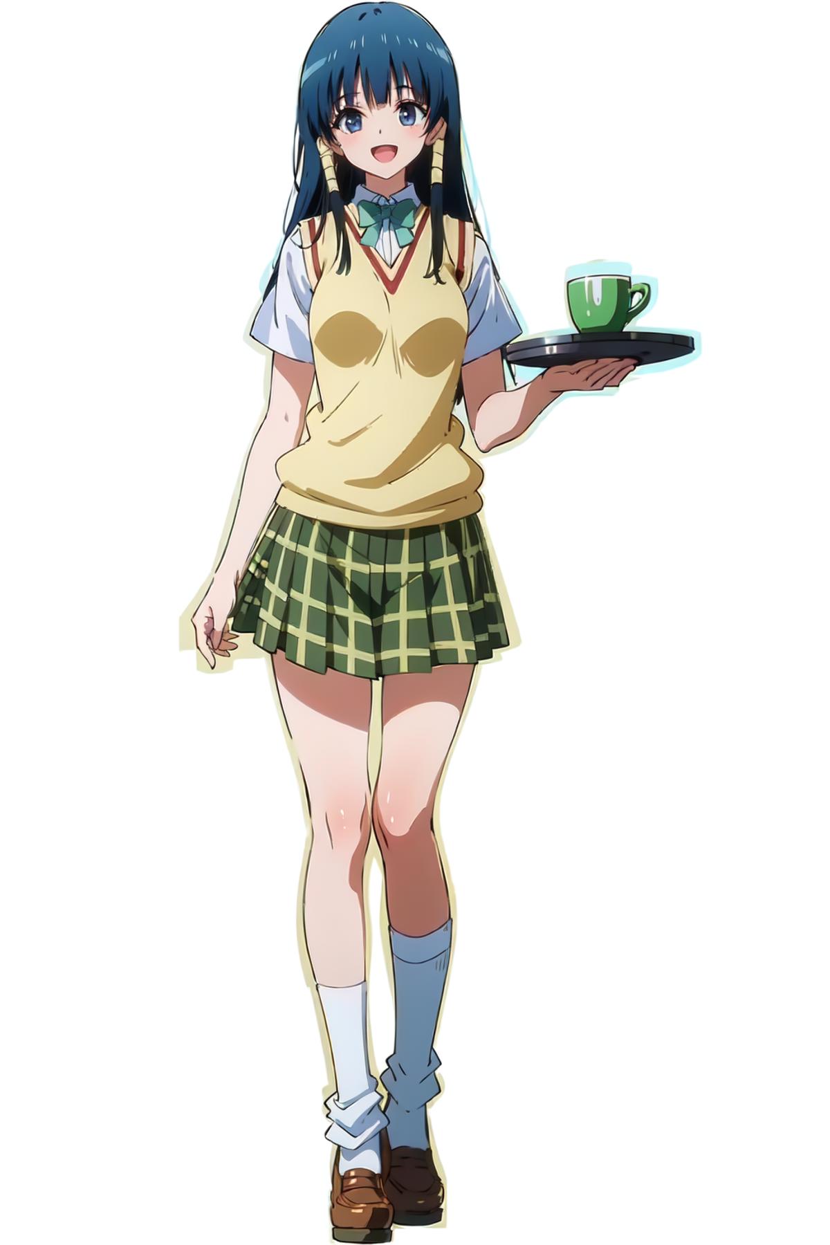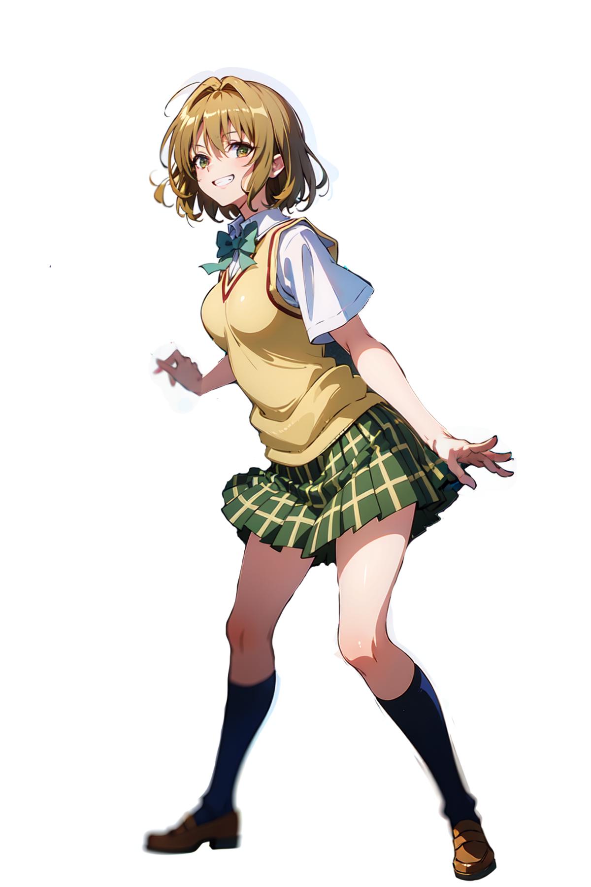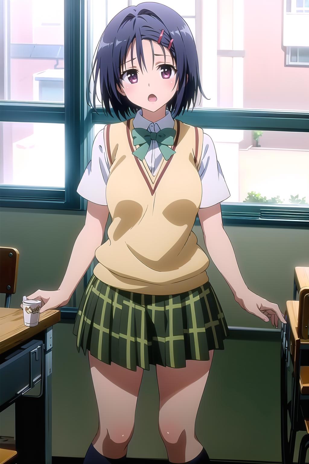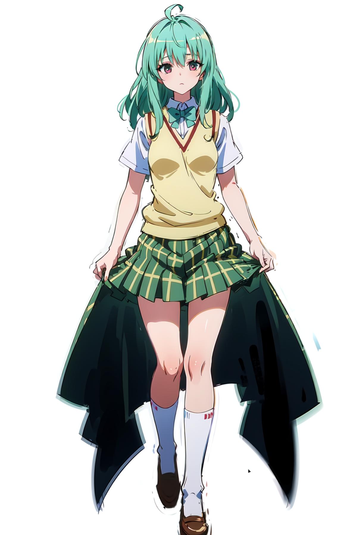 school uniform, sweater vest, plaid skirt.