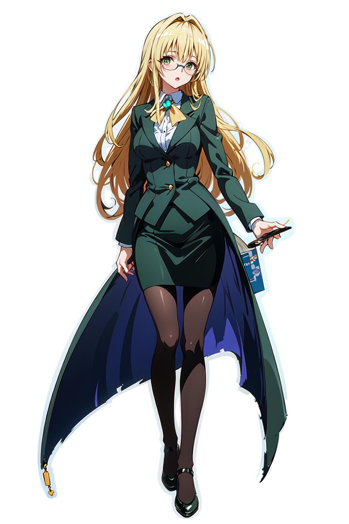 tearju:tearju, glasses, additional prompts: pantyhose, pencil skirt, book, formal, skirt suit, teacher, suit,