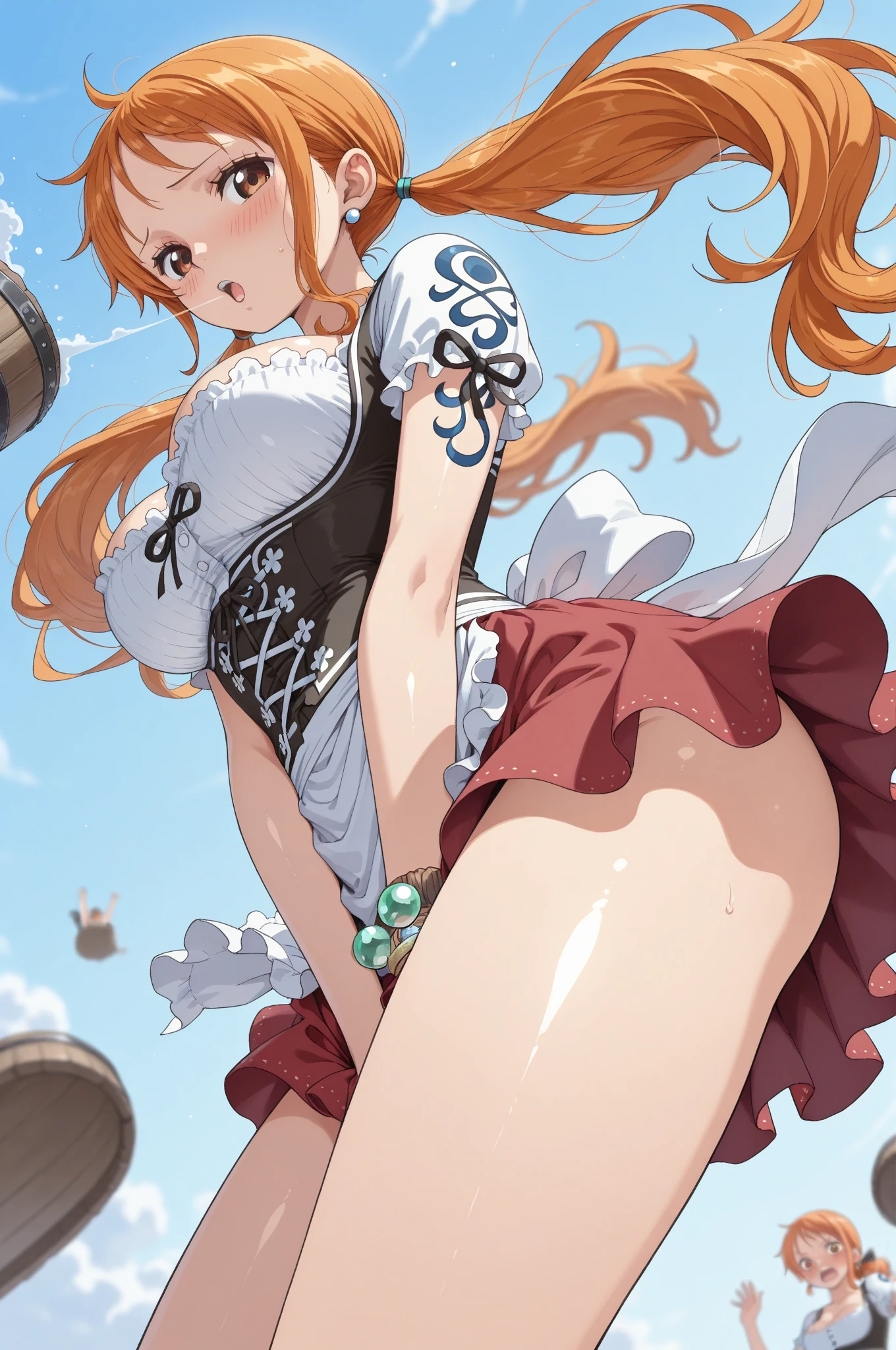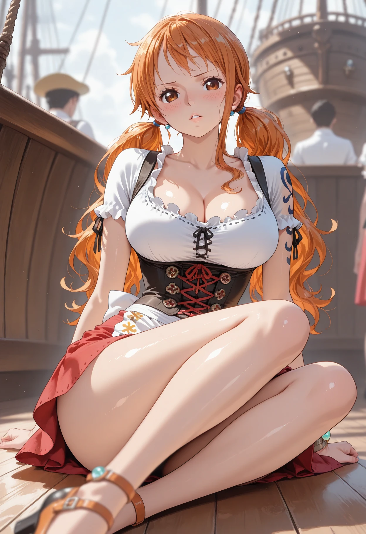 Prompts : nami_\(one_piece\), long_hair, orange_hair, brown_eyes, tattoo, arm_tattoo,