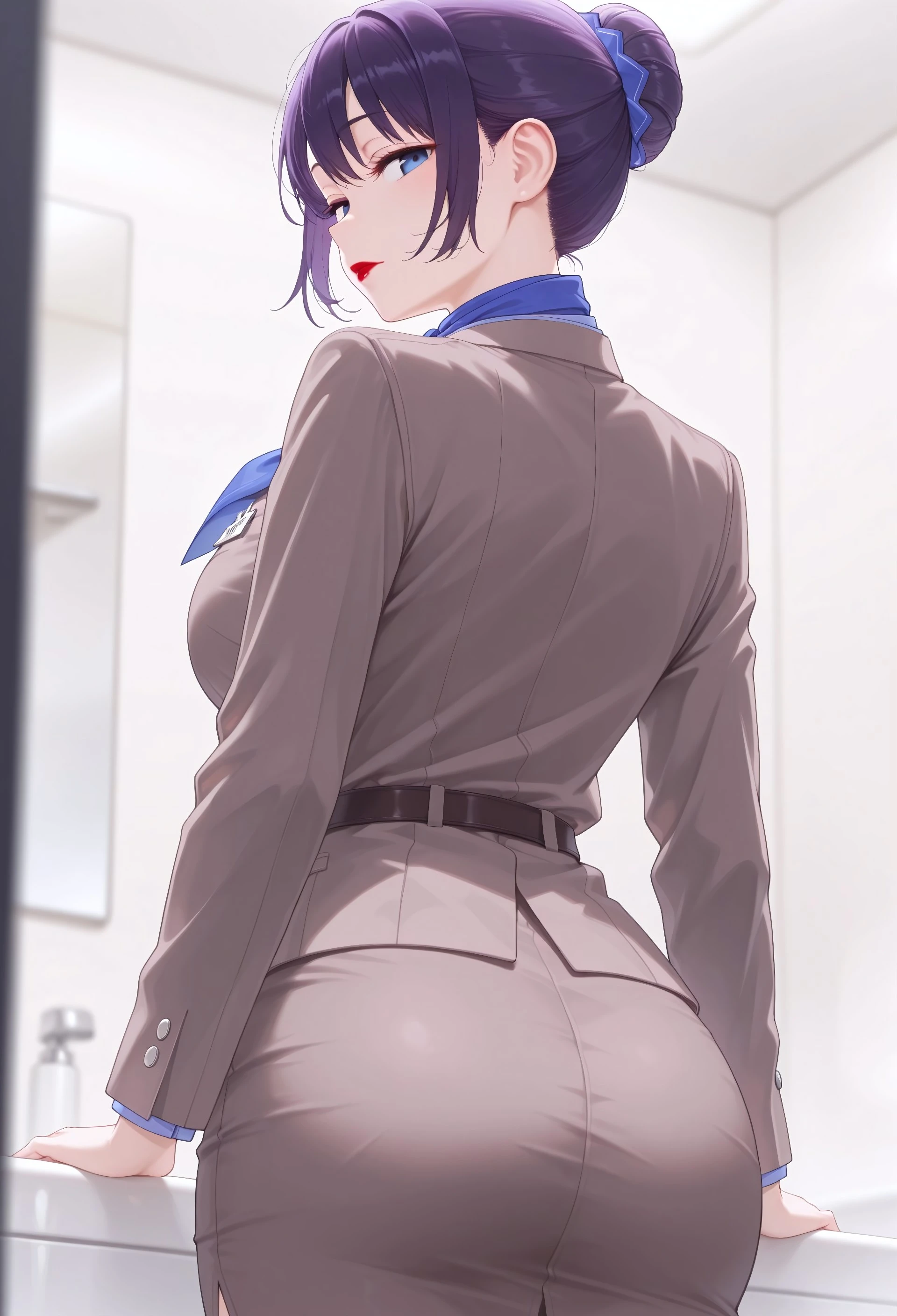 Appearance: 1girl, solo, dark purple hair, single hair bun, blue eyes, parted lips, lipstick, red lipstick, large breasts,