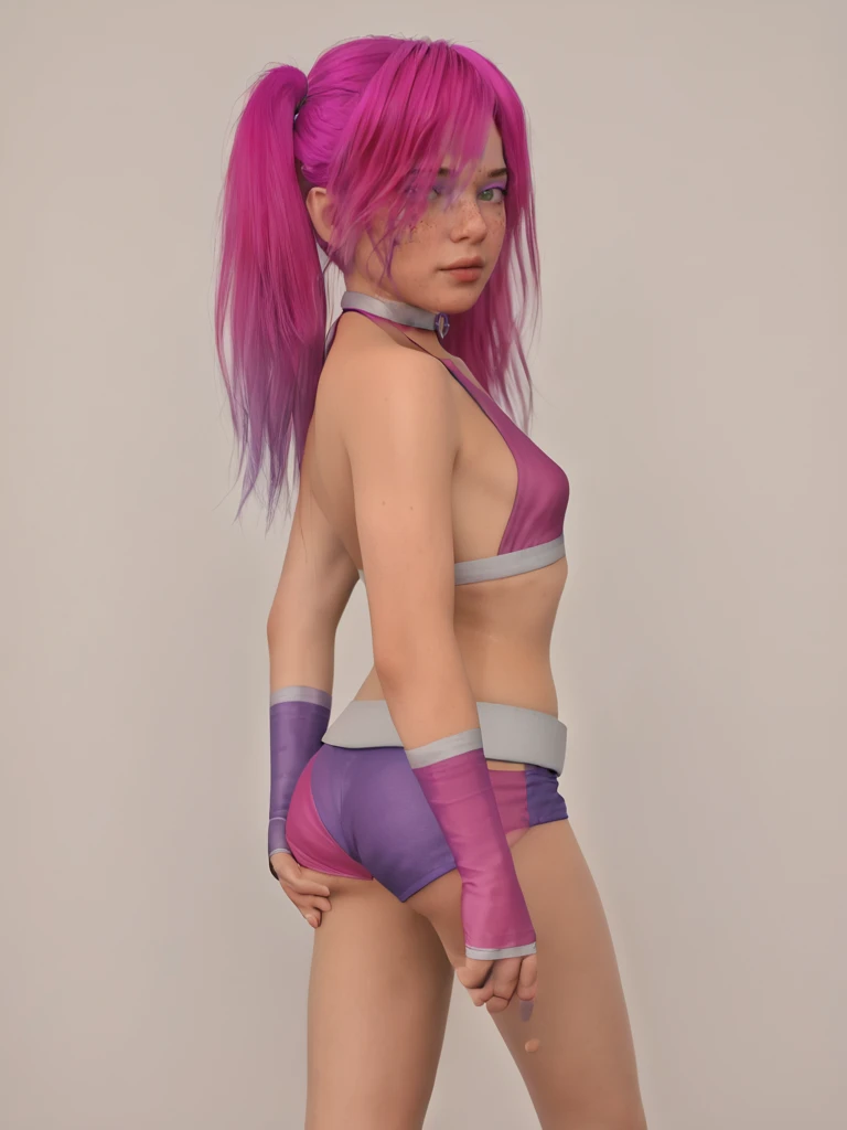 white collar choker, purple heart collar buckle, pink fingerless glove on right hand, purple fingerless glove on left hand, white trim gloves, two tone halter top, purple and pink halter top, low-cut halter top, sleeveless, bare shoulders, crop top, midriff, two tone hotpants, purple and pink hotpants, high cut hotpants, white belt, purple heart belt buckle,