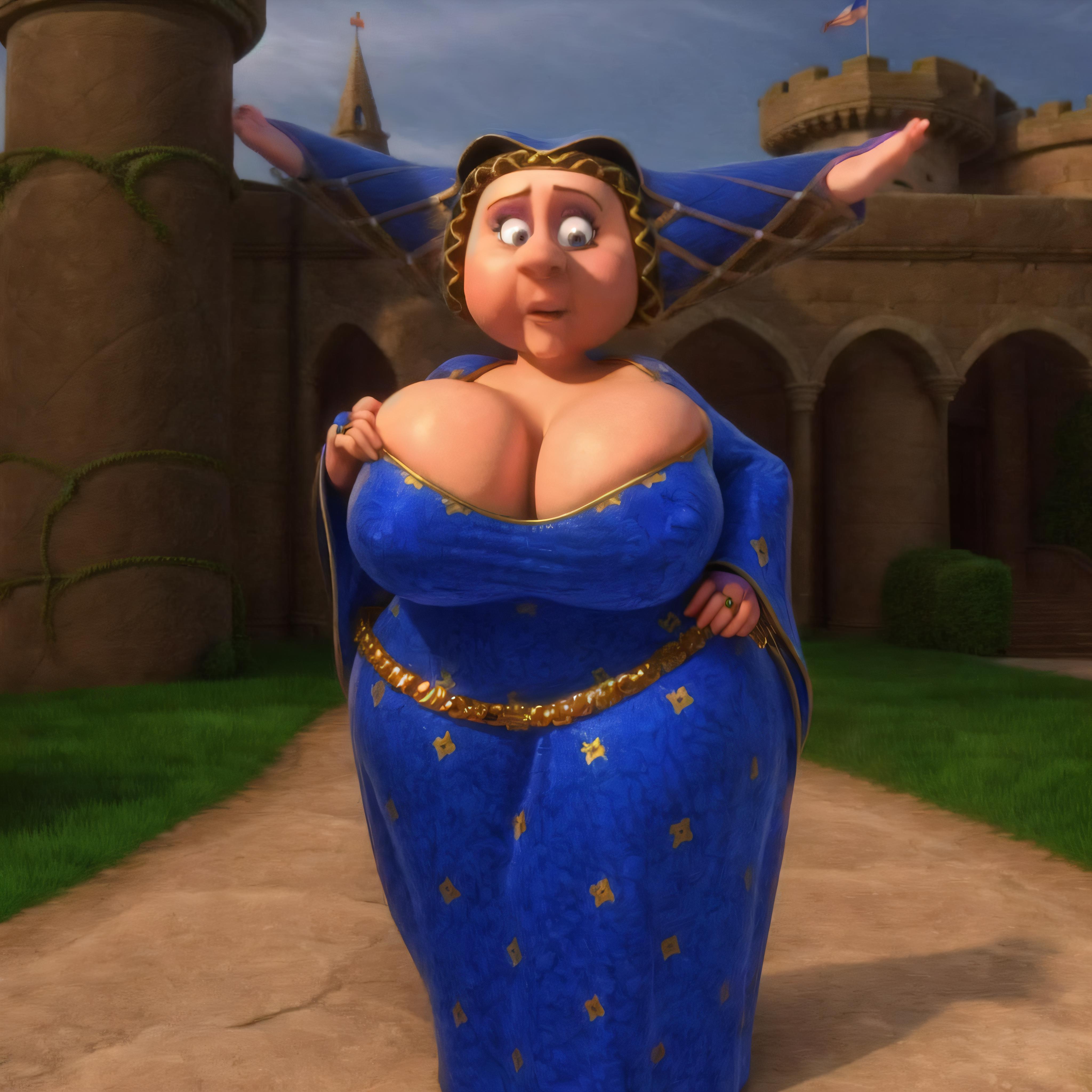 short, elderly, woman, blue dress, (headwear), handwear, big necklace, jewelry