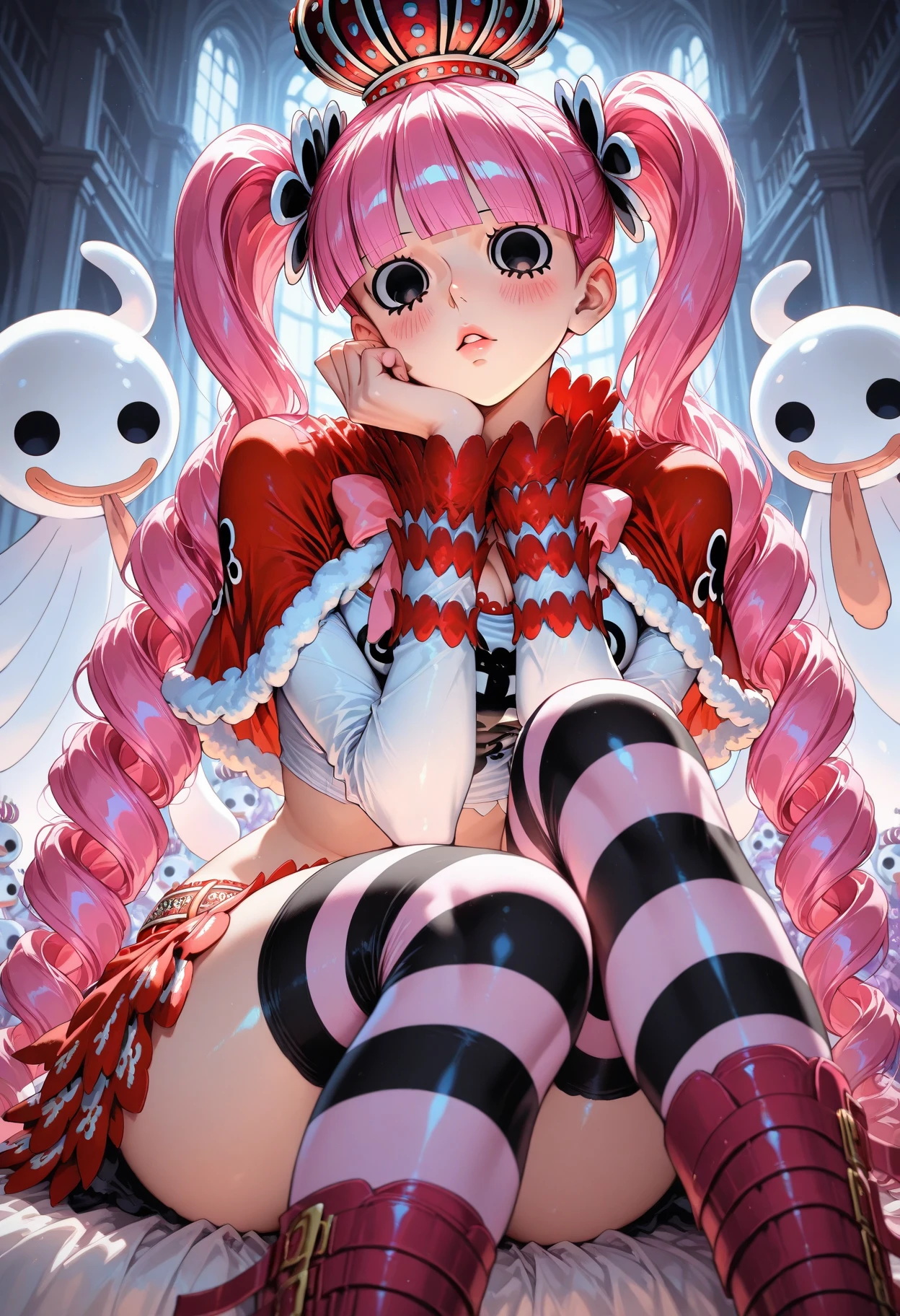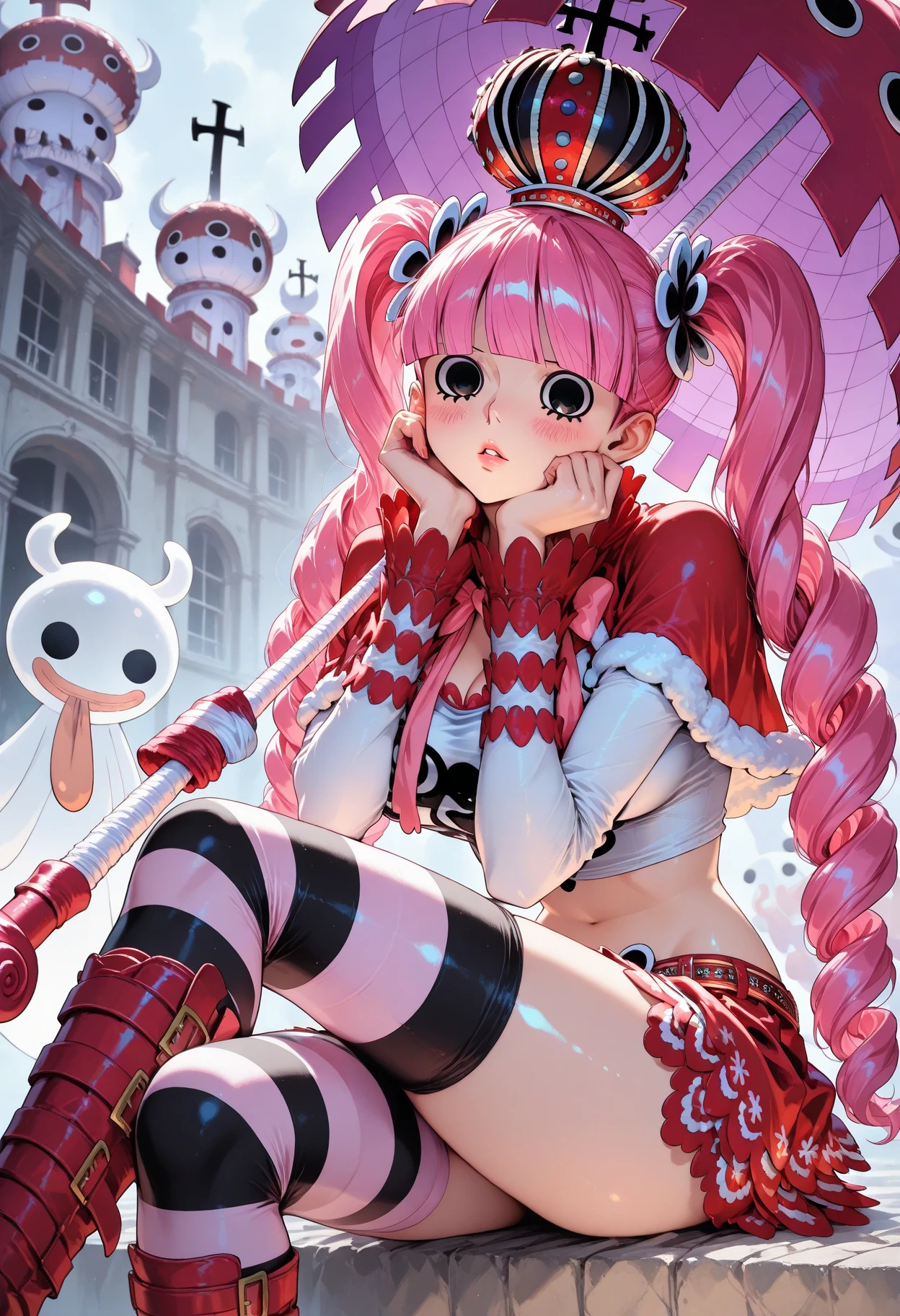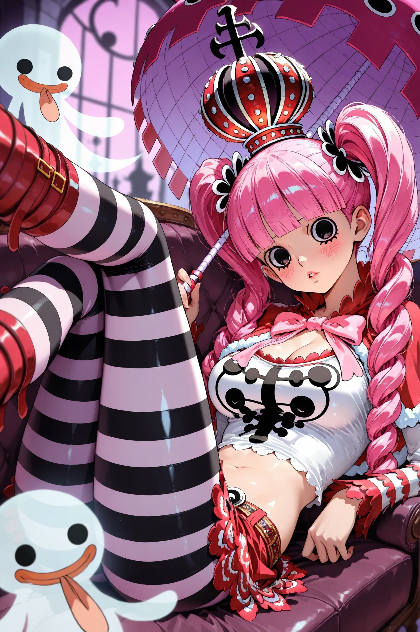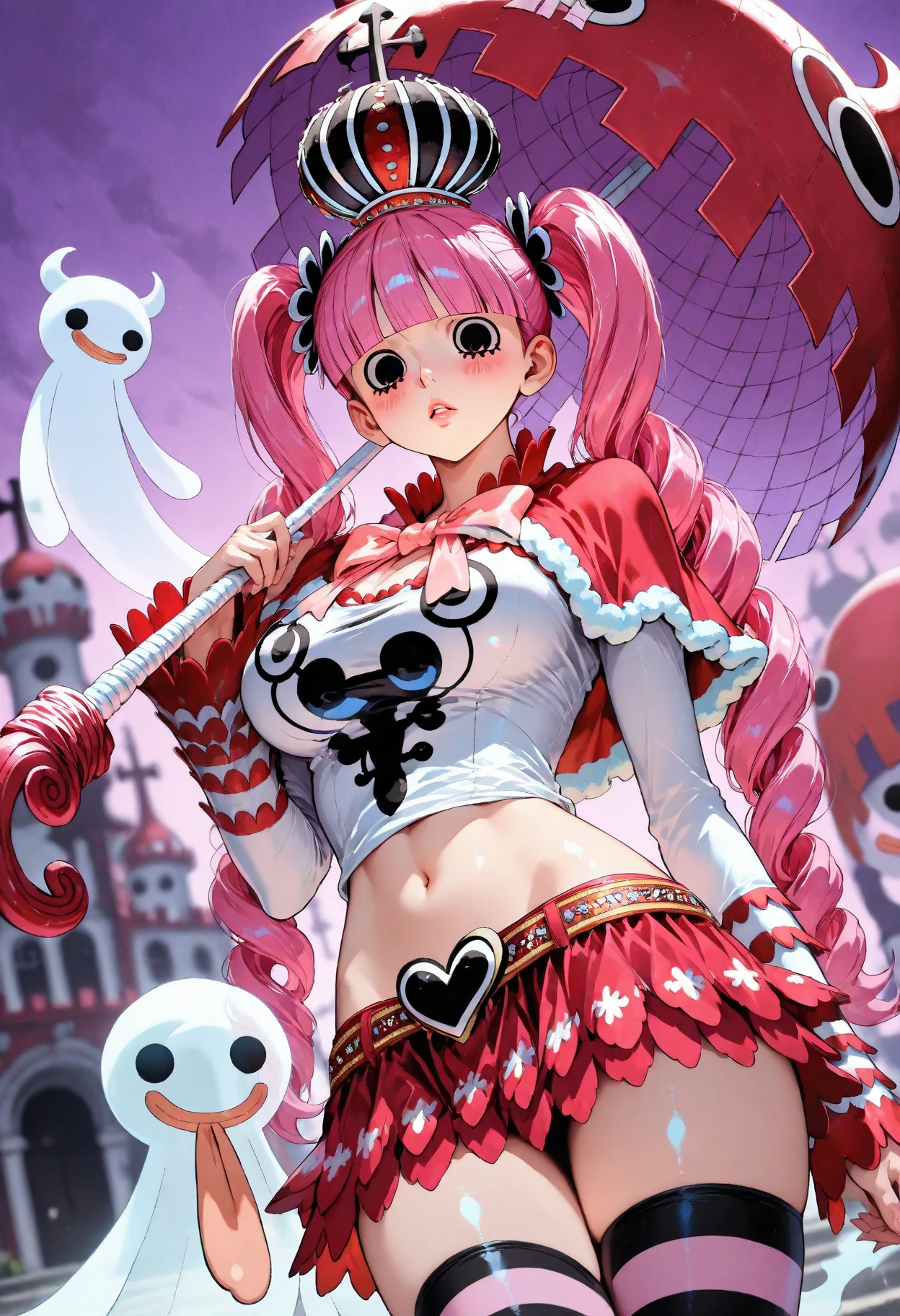 perona, long_hair, twintails, twin_drills, pink_hair, bangs, black_eyes