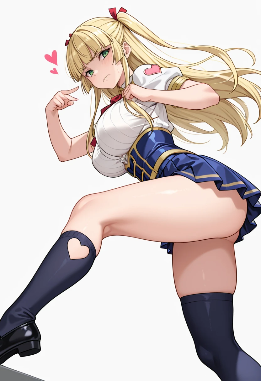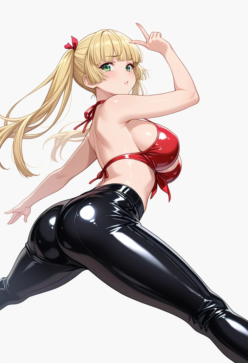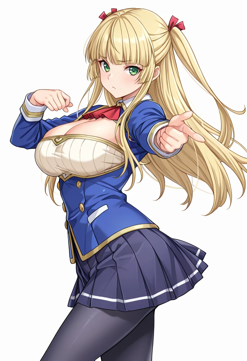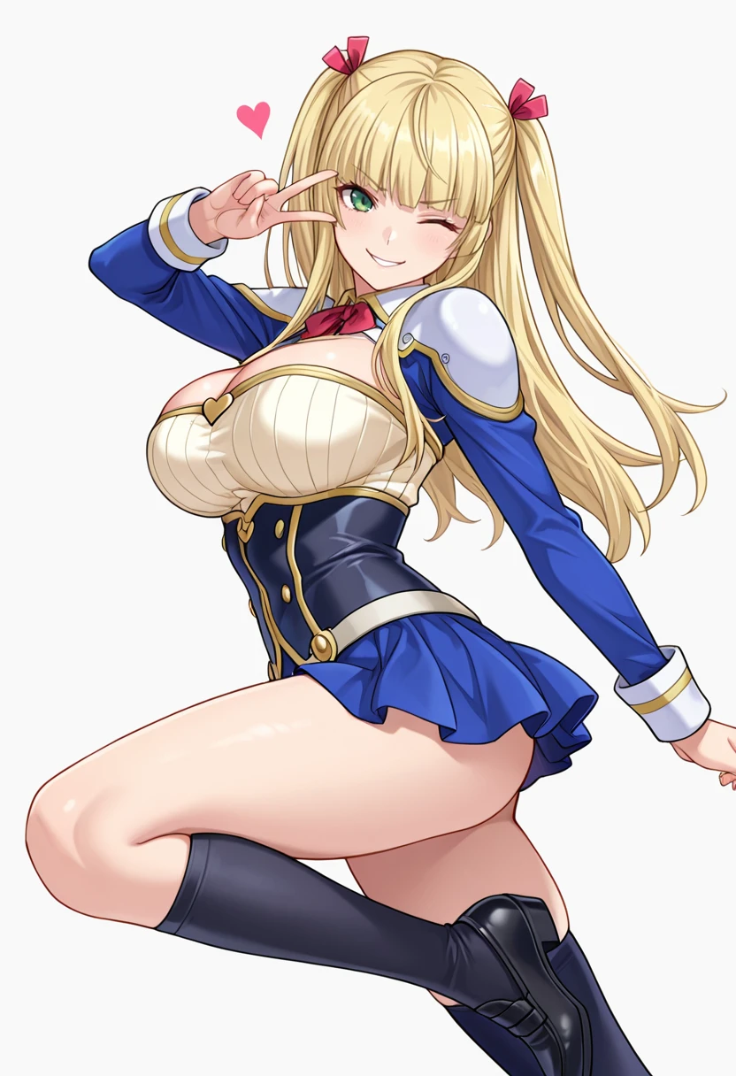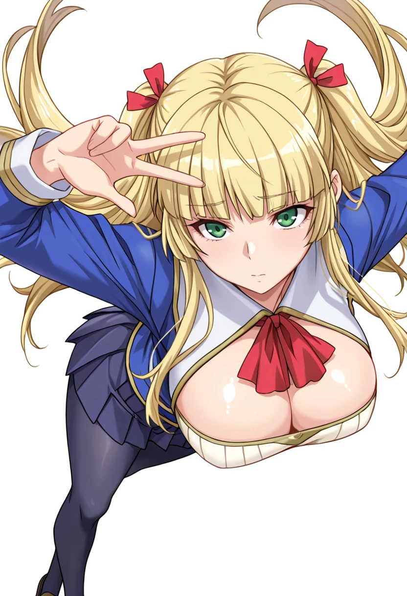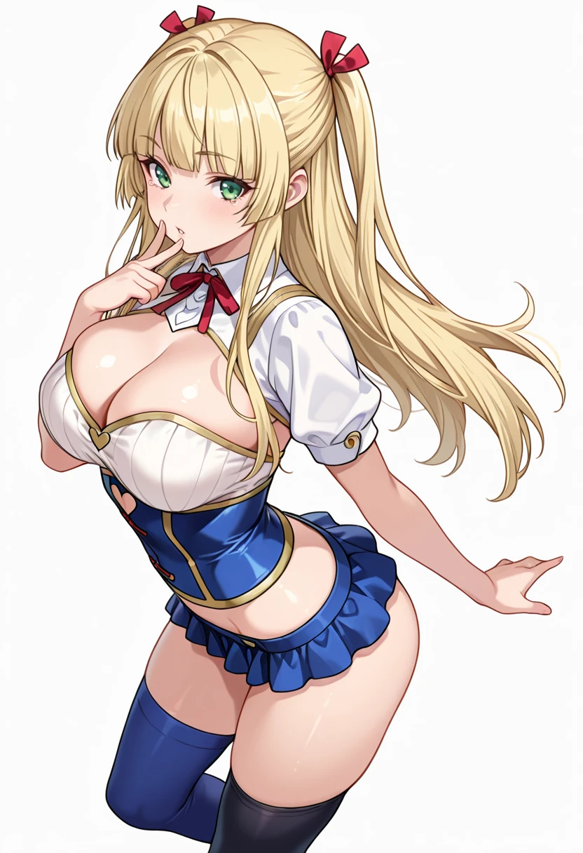 moonland_cnr, 1girl,blonde hair, long hair, large breasts, green eyes, blunt bangs, twintails,hair ribbon,