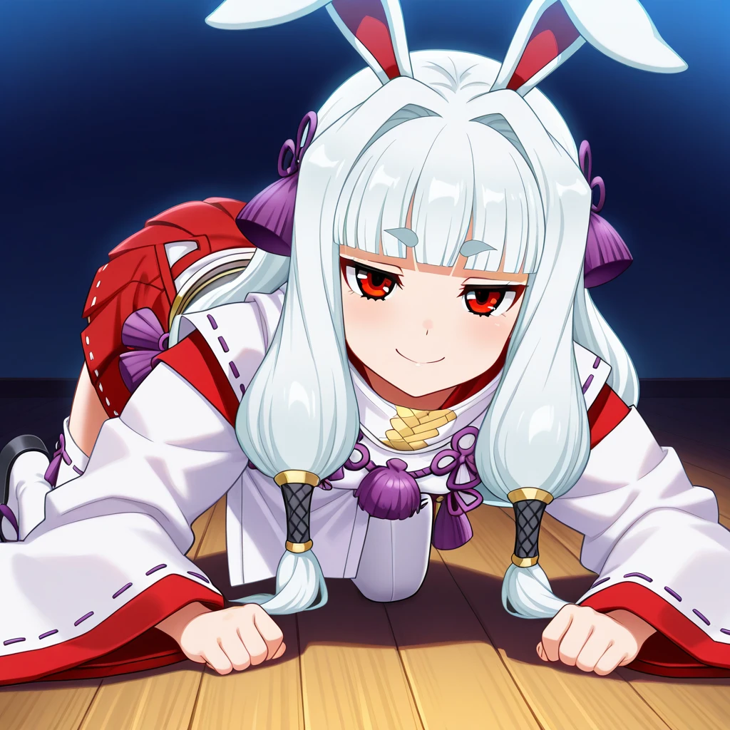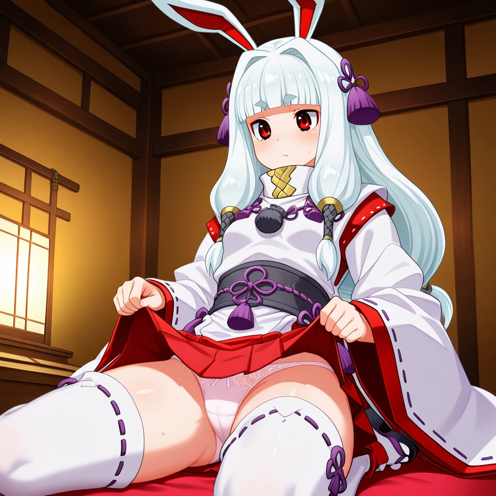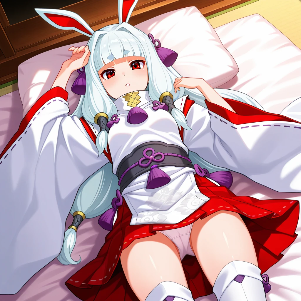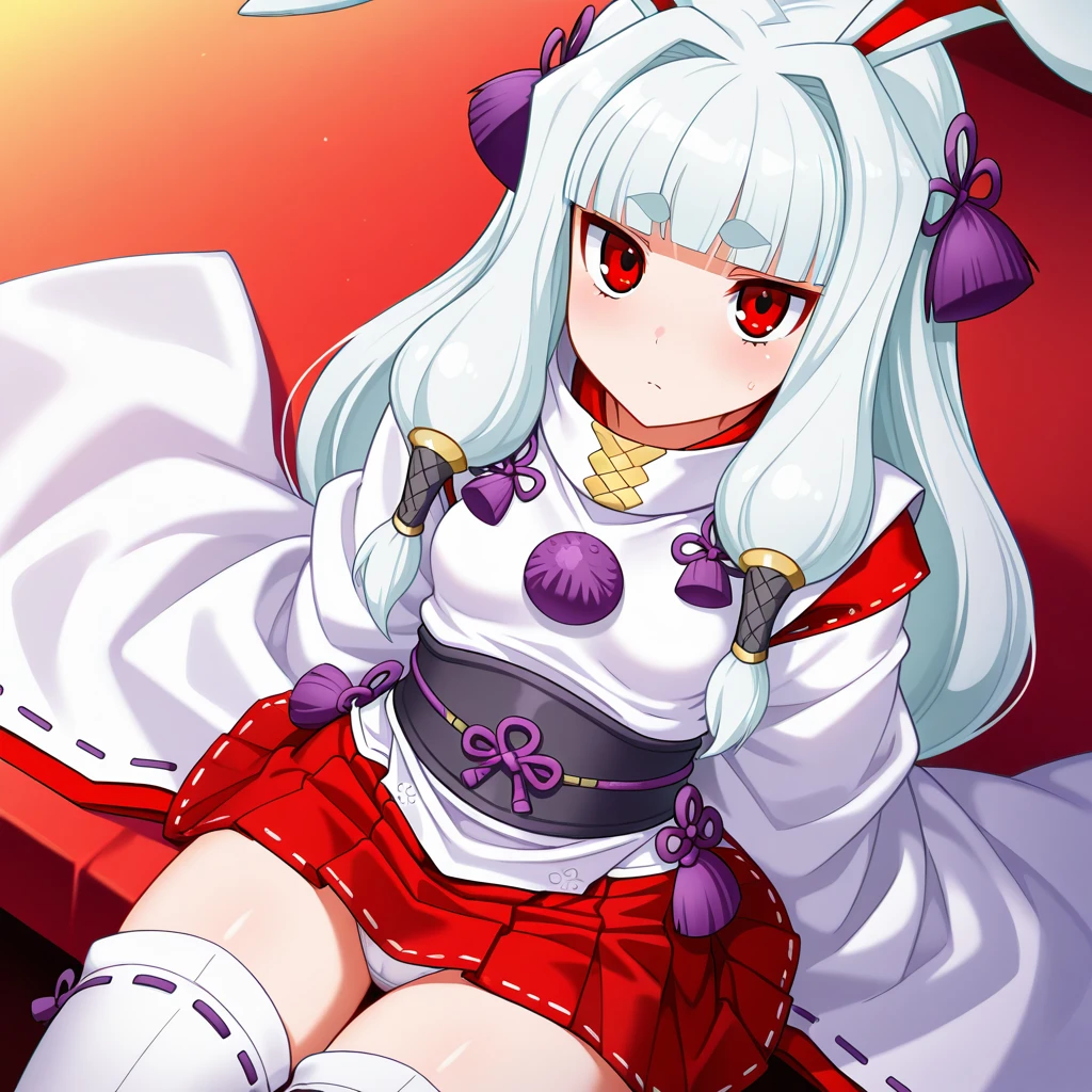 Ew_Oboro, 1girl, solo, small breasts, white hair, long hair, low twintails, low-tied long hair, hair intakes, blunt bangs, eyebrows visible through hair, red eyes, rabbit ears, animal ears, hair ornament, japanese clothes, shrine maiden, miko, obi, detached sleeves, long sleeves, wide sleeves, panties, red skirt, pleated skirt, thighhighs, white kneehighs, legwear, okobo