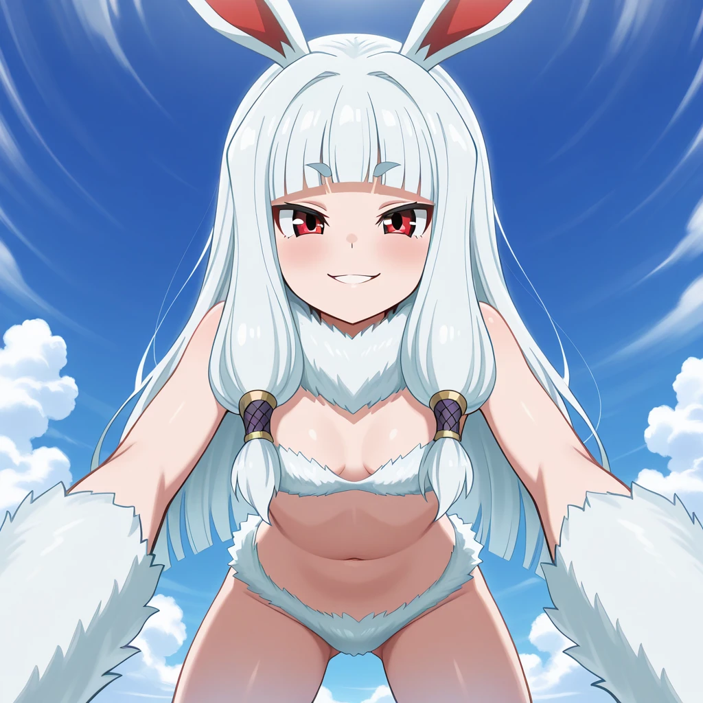 Ew_Oboro_fr, 1girl, solo, small breasts, white hair, long hair, blunt bangs, eyebrows visible through hair, red eyes, rabbit ears, animal ears, nude, bare shoulders, body fur, fur bra, fluffy crotch, covered crotch, claws, furred limbs, tail