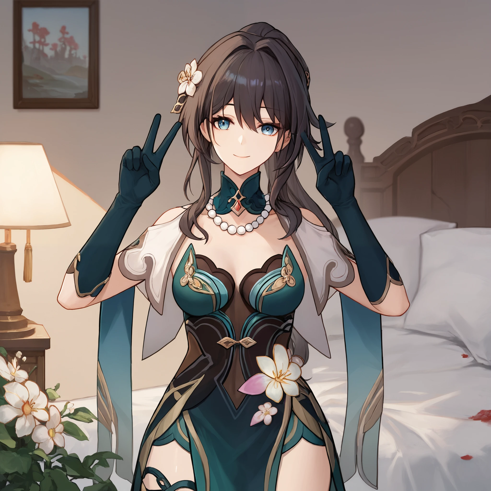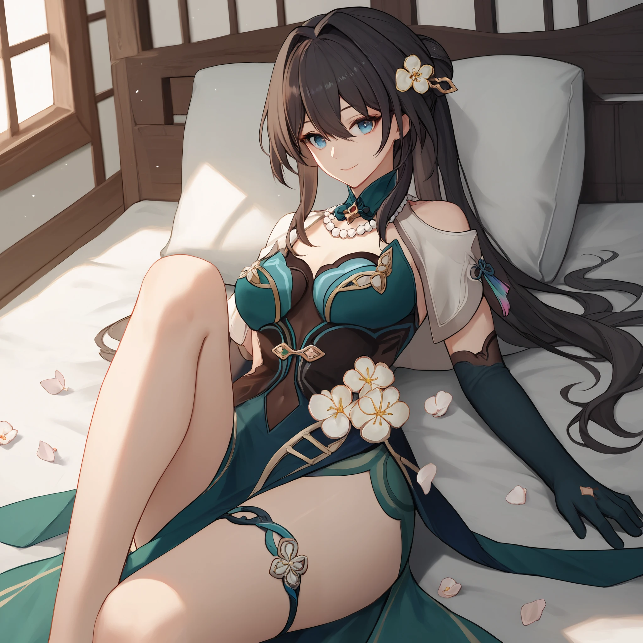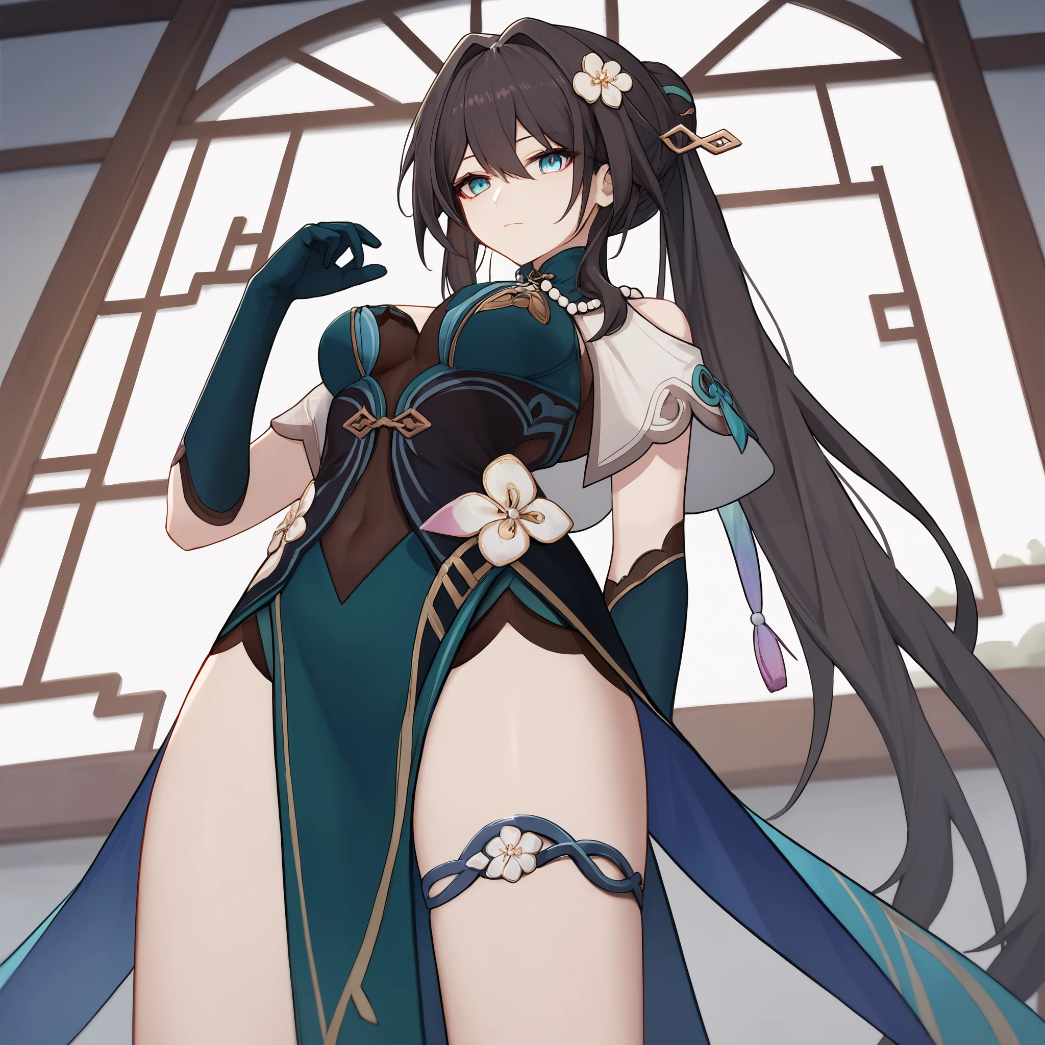 Default : ruan mei \(honkai: star rail\), blue eyes, black hair, long hair, ponytail, hair bun, hair ornament, pearl necklace, pelvic curtain, elbow gloves, green gloves, short sleeves, detached collar, china dress, white capelet, thigh strap,Description