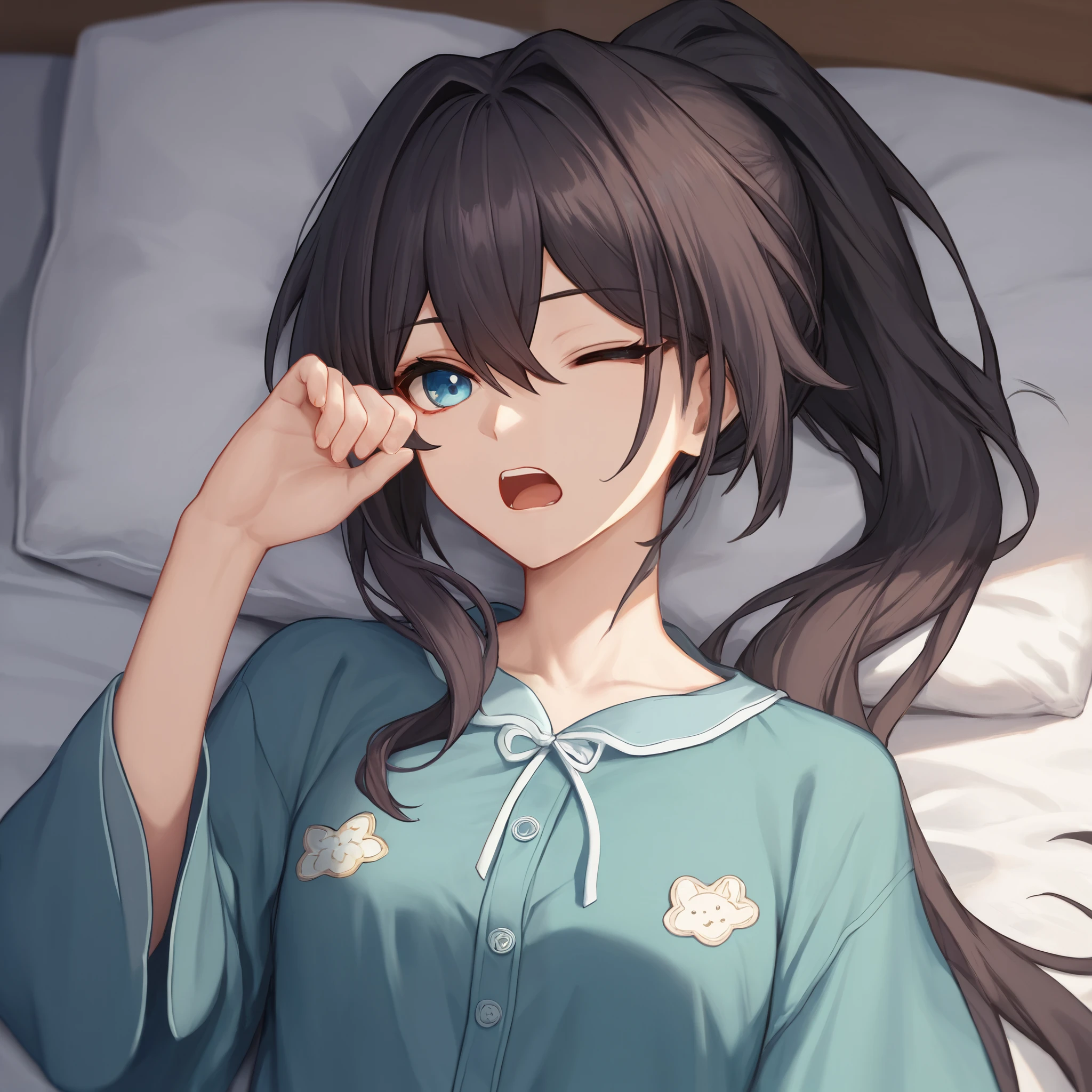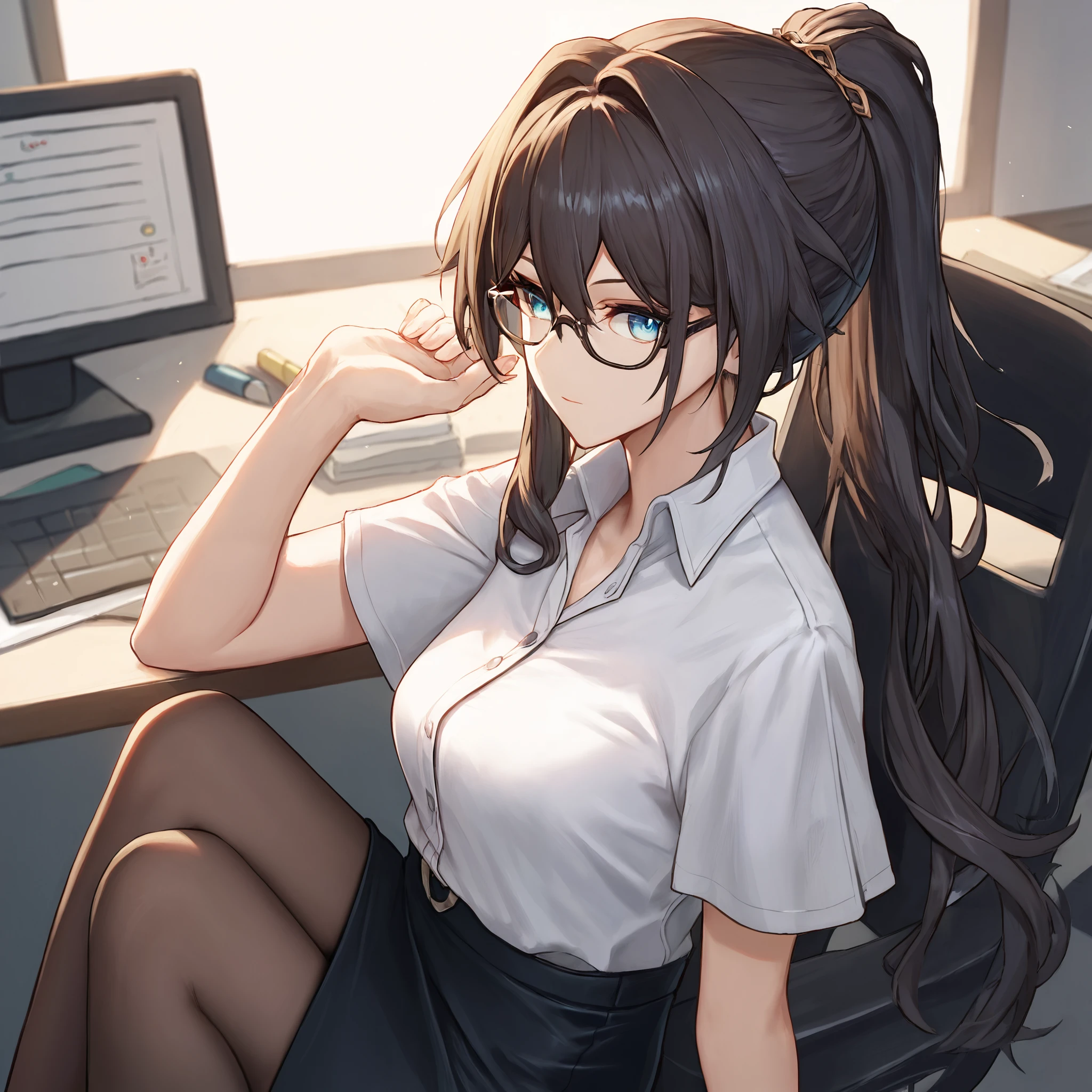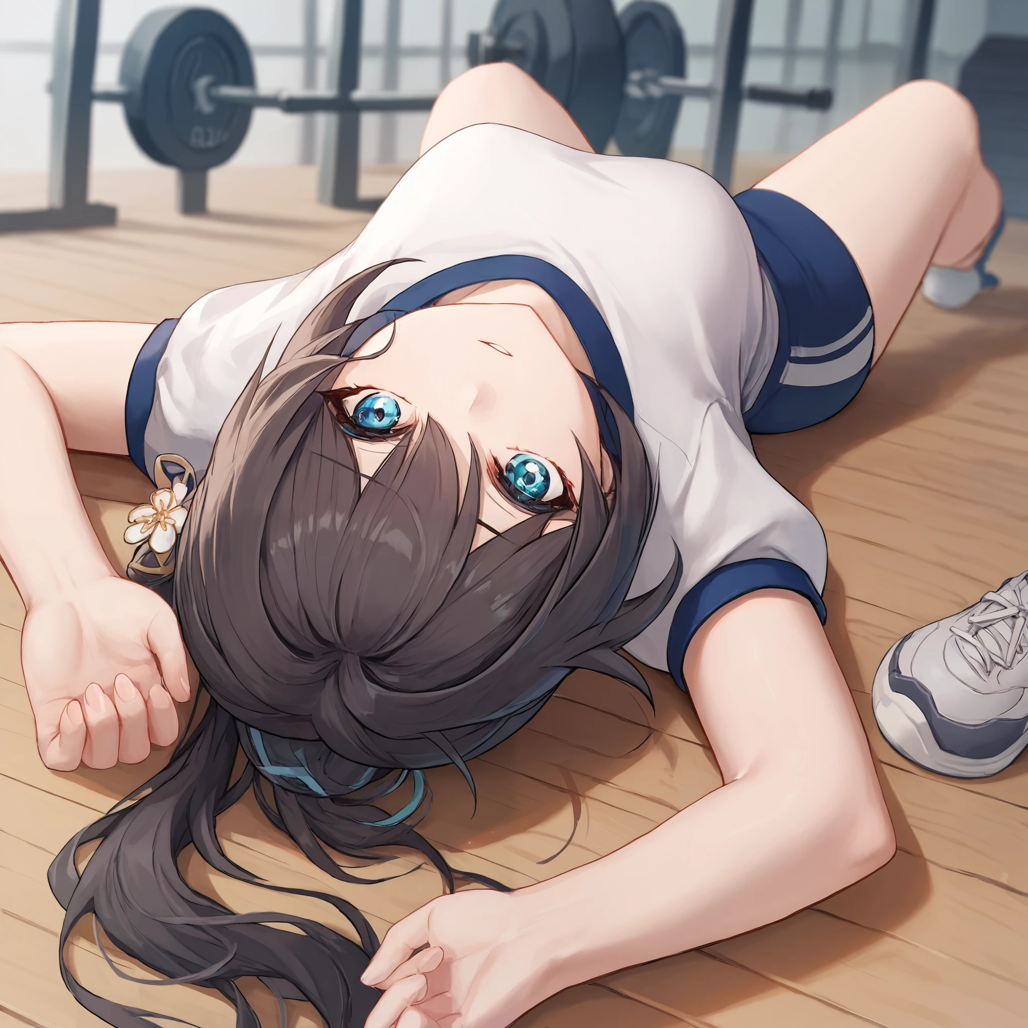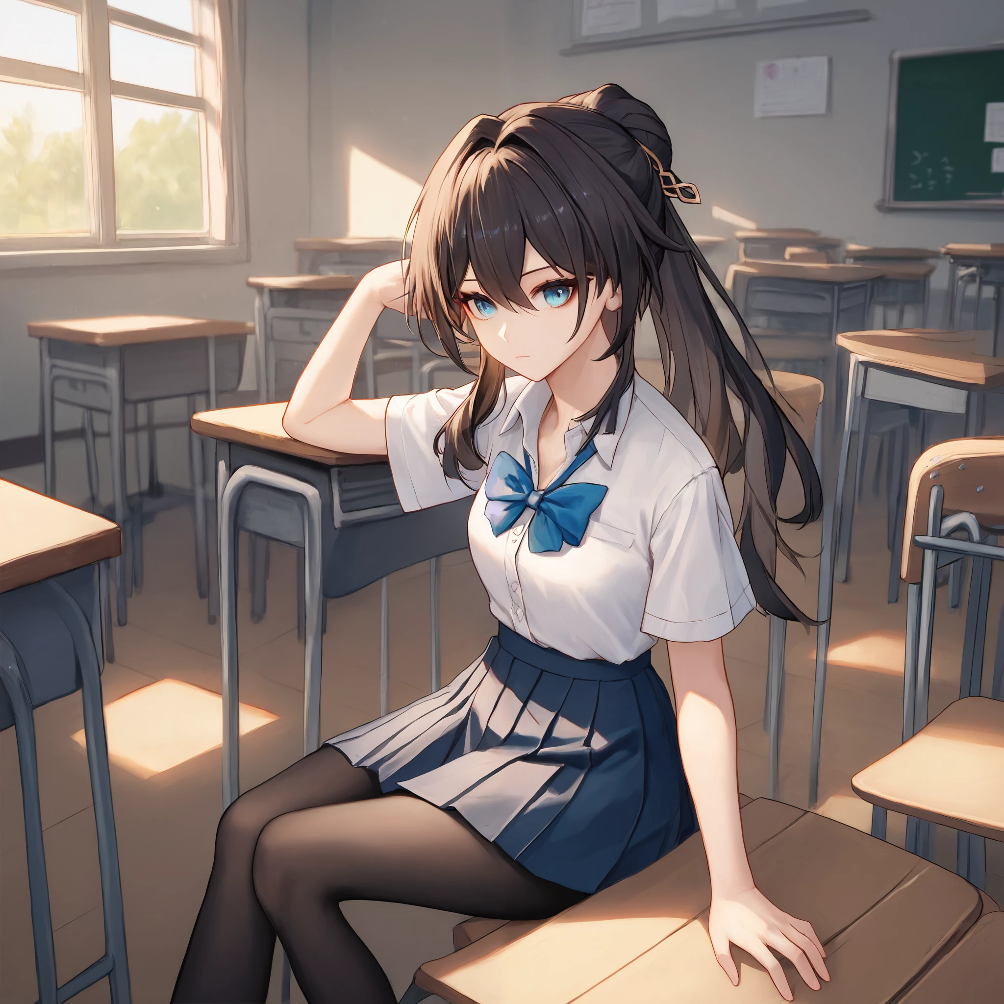 Default : ruan mei \(honkai: star rail\), blue eyes, black hair, long hair, ponytail, hair bun, hair ornament, pearl necklace, pelvic curtain, elbow gloves, green gloves, short sleeves, detached collar, china dress, white capelet, thigh strap,Description