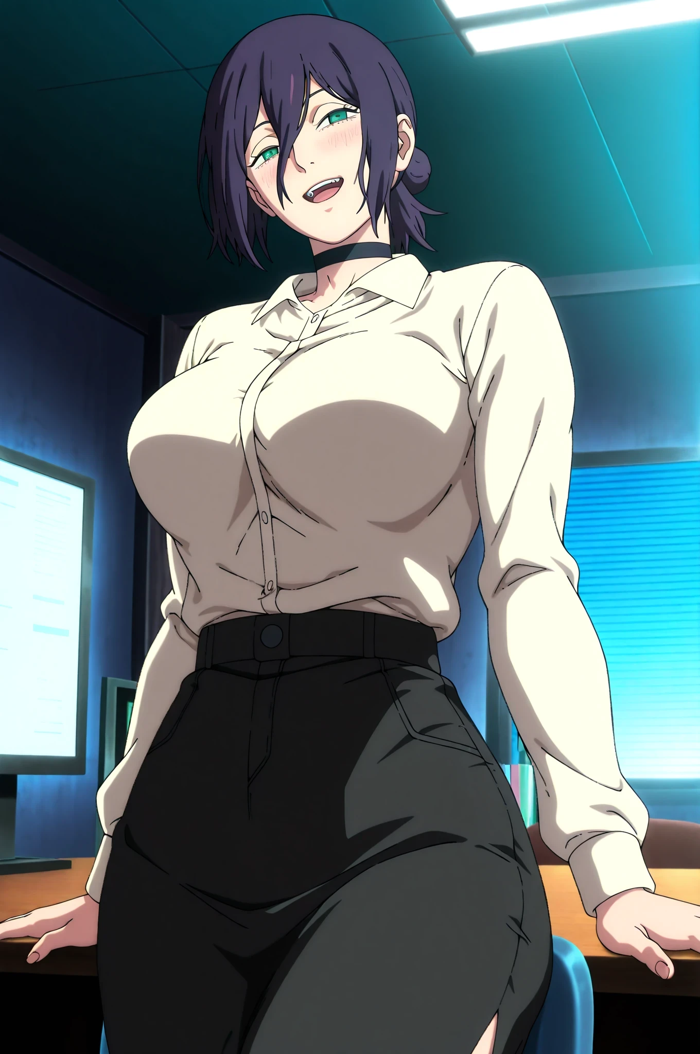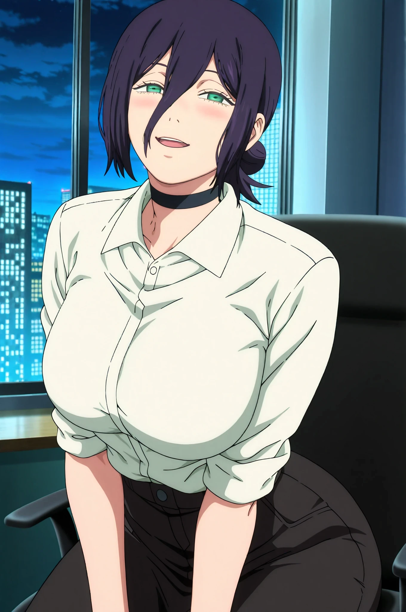 RezeV2, 1girl, solo, short hair, purple hair, medium hair, single hair bun, medium breasts, green eyes,,