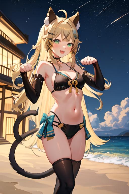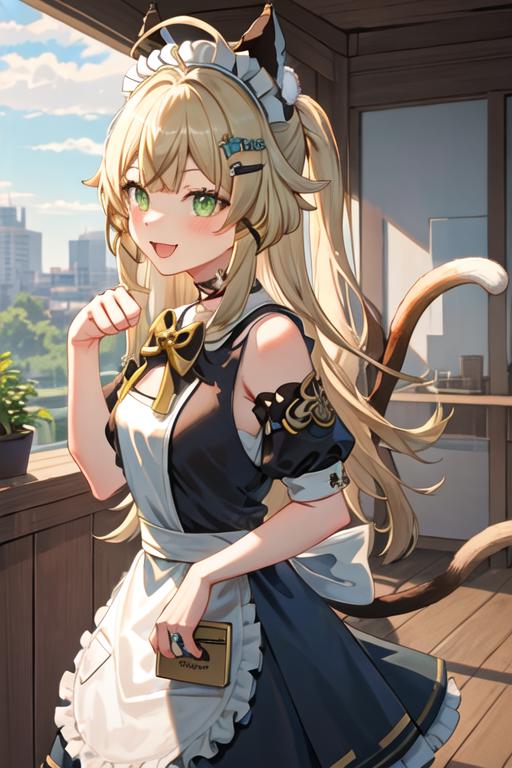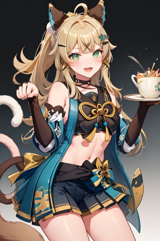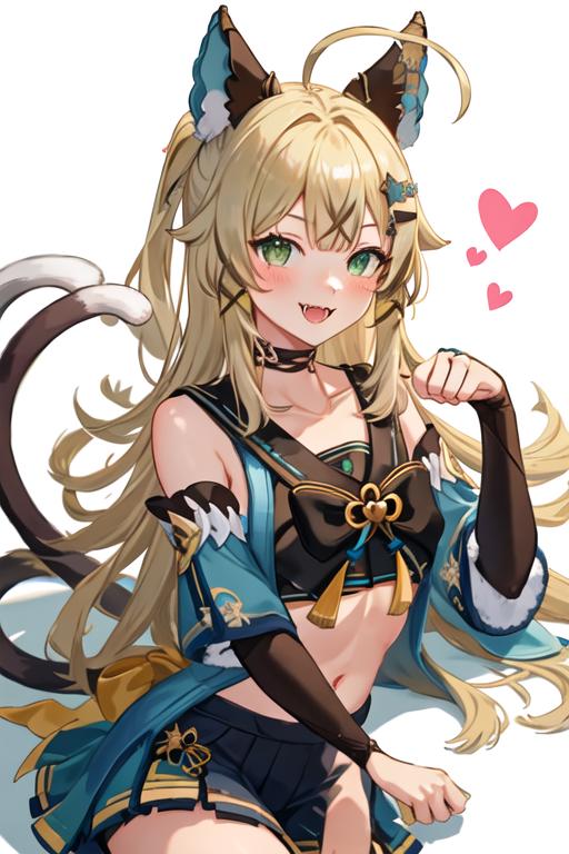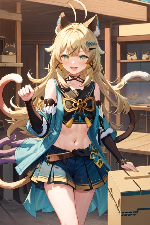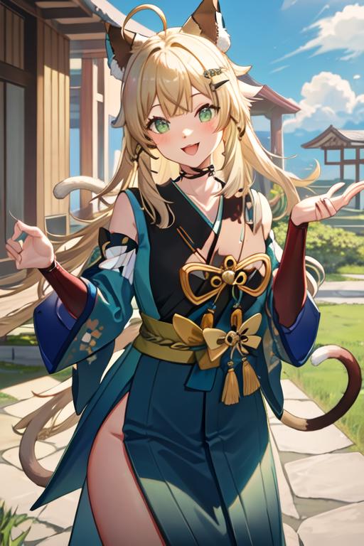 The trigger word is kirara_genshin, and the recommended tags are best quality, masterpiece, highres, solo, {kirara_genshin:1.15}, long_hair, hair_ornament, green_eyes, bangs, smile, animal_ears, open_mouth, hairclip, blonde_hair, ahoge, virtual_youtuber, tail, blush, cat_tail, bow, cat_ears, hair_bow.