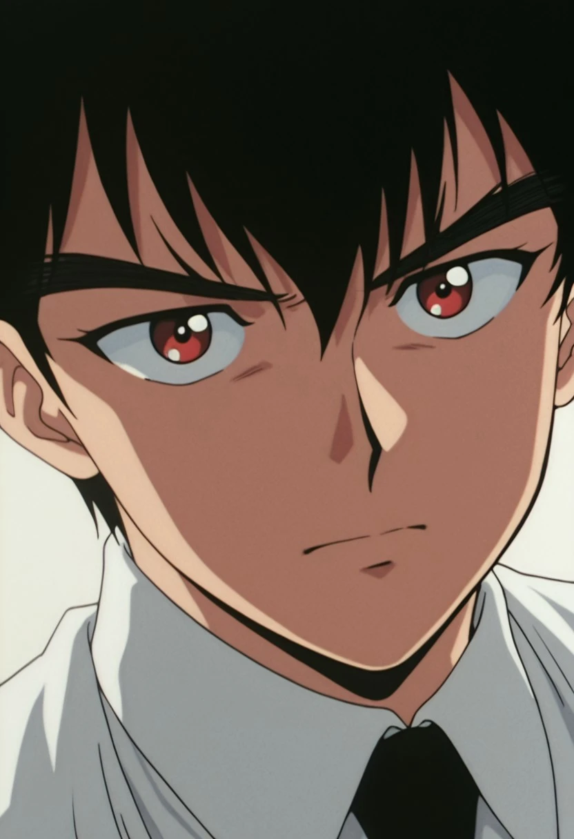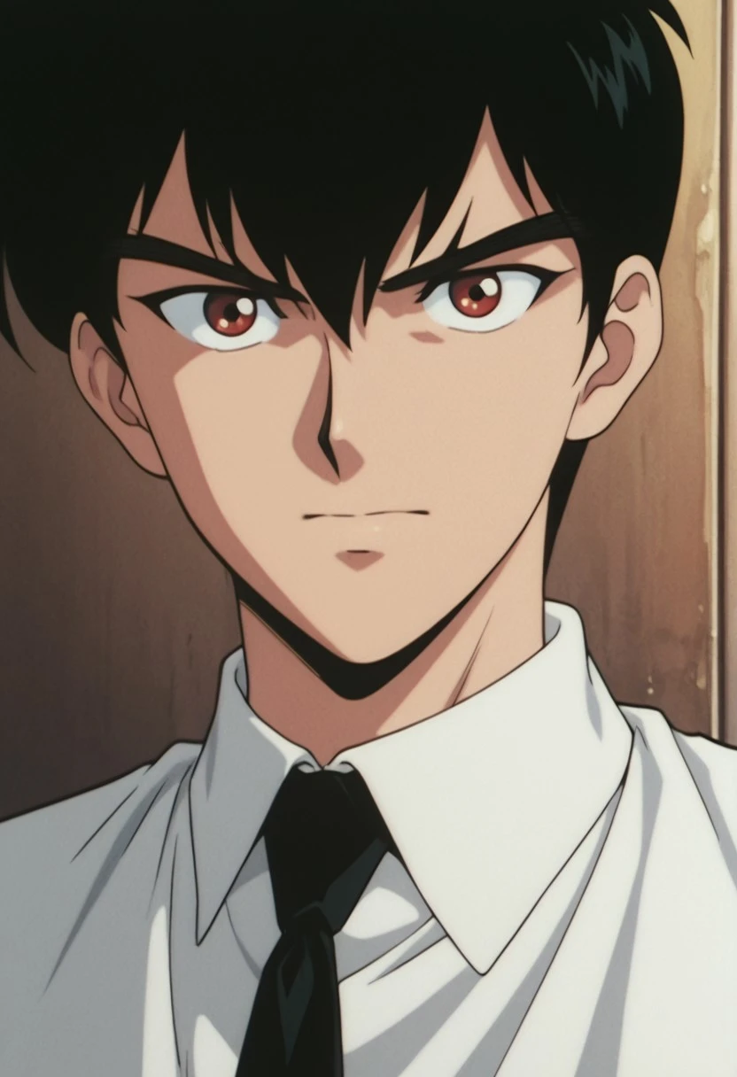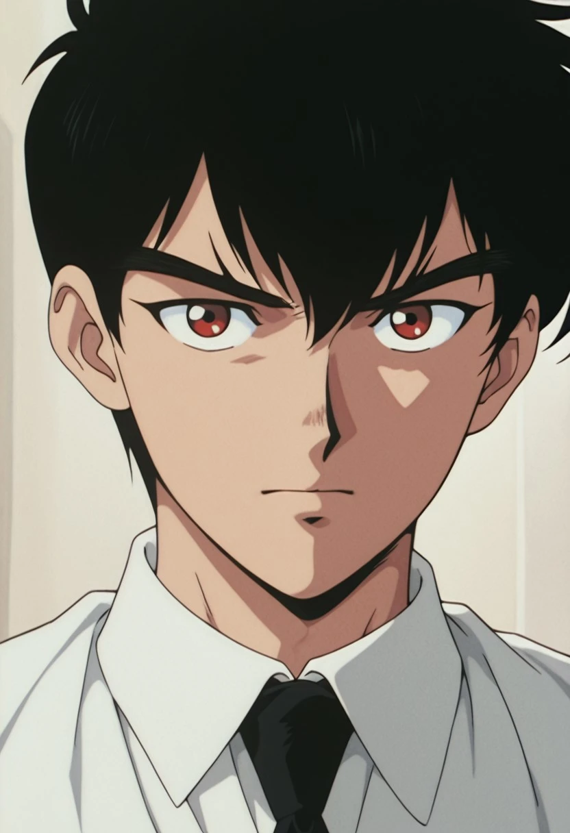 1boy, male focus, solo, red eyes, black hair, white shirt, collared shirt, black necktie, sleeves rolled up, single glove, black gloves, shirt tucked in, black pants,