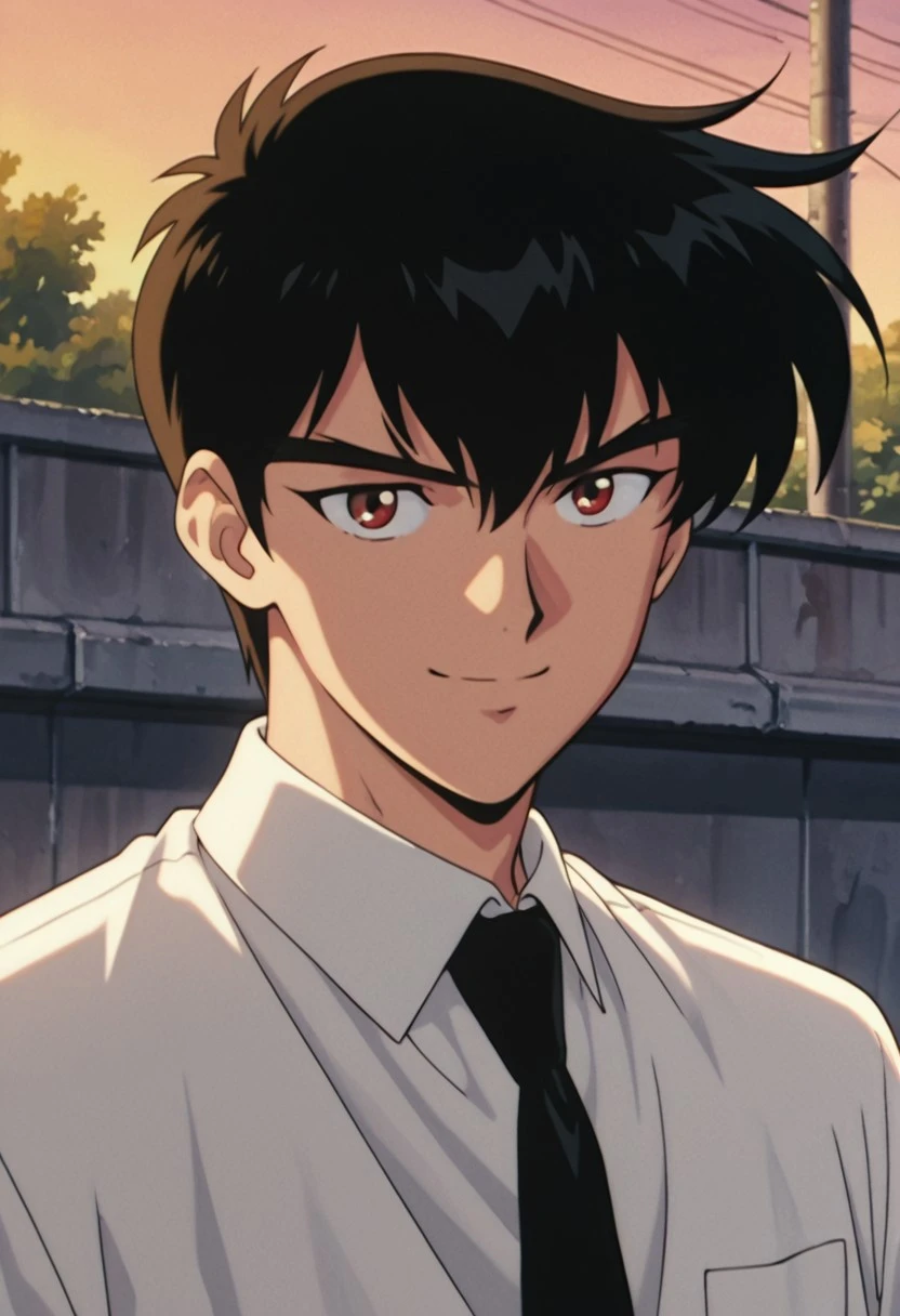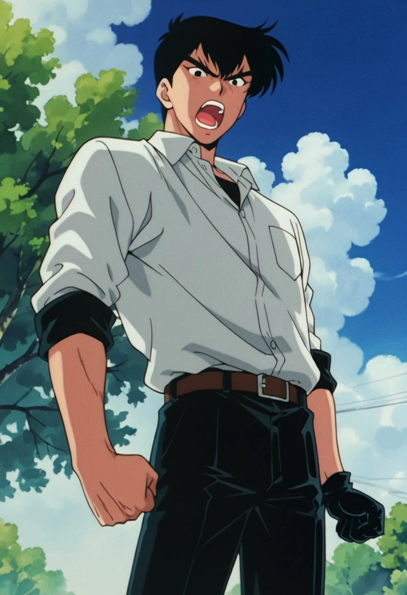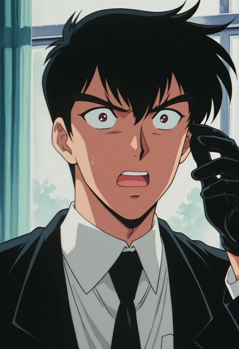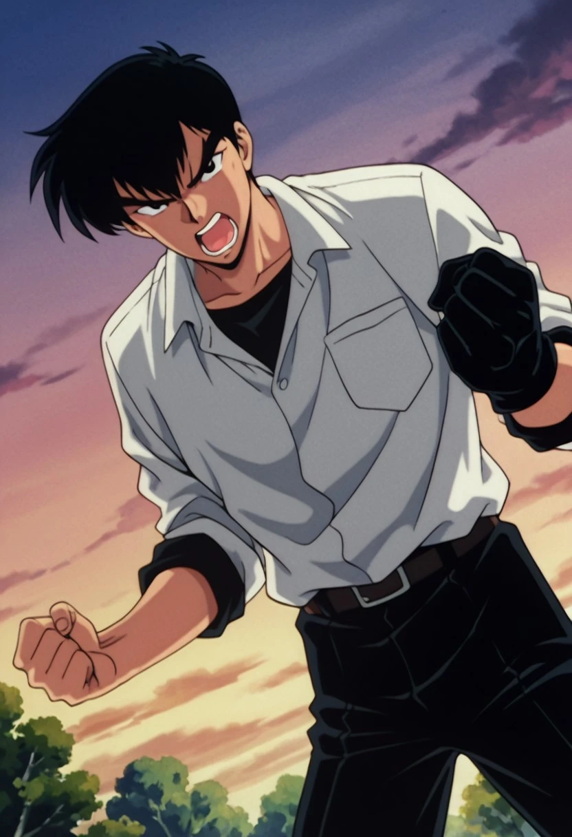 1boy, male focus, solo, red eyes, black hair, white shirt, collared shirt, black necktie, sleeves rolled up, single glove, black gloves, shirt tucked in, black pants,