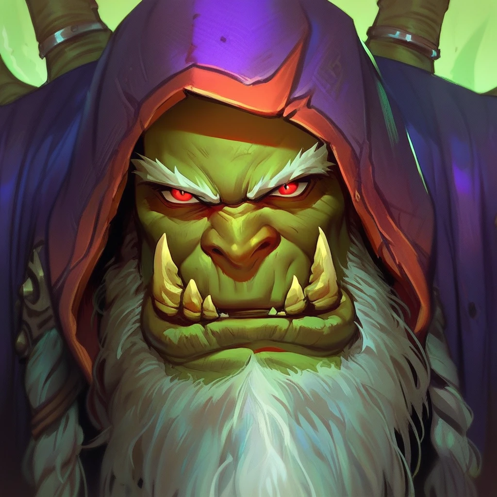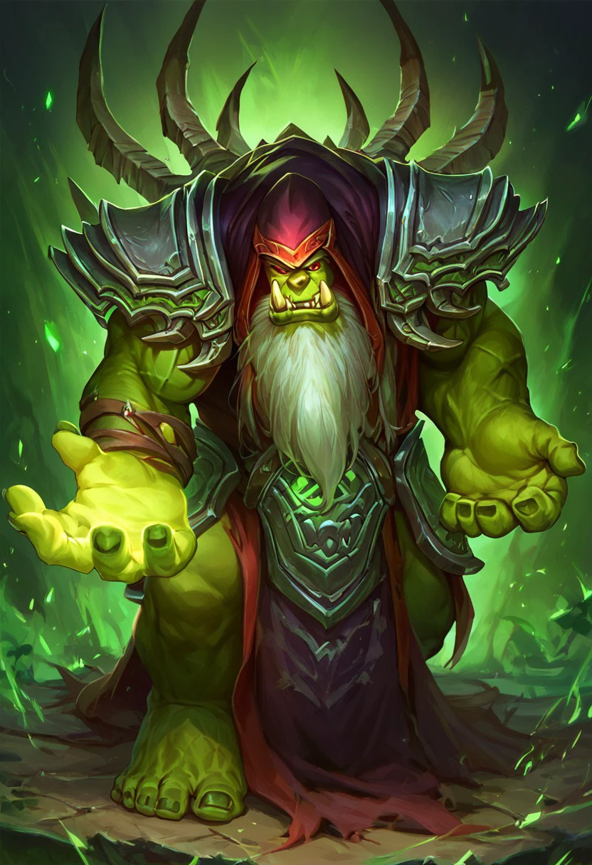 guldan, orc, green skin, beard, hood, red eyes, armor,