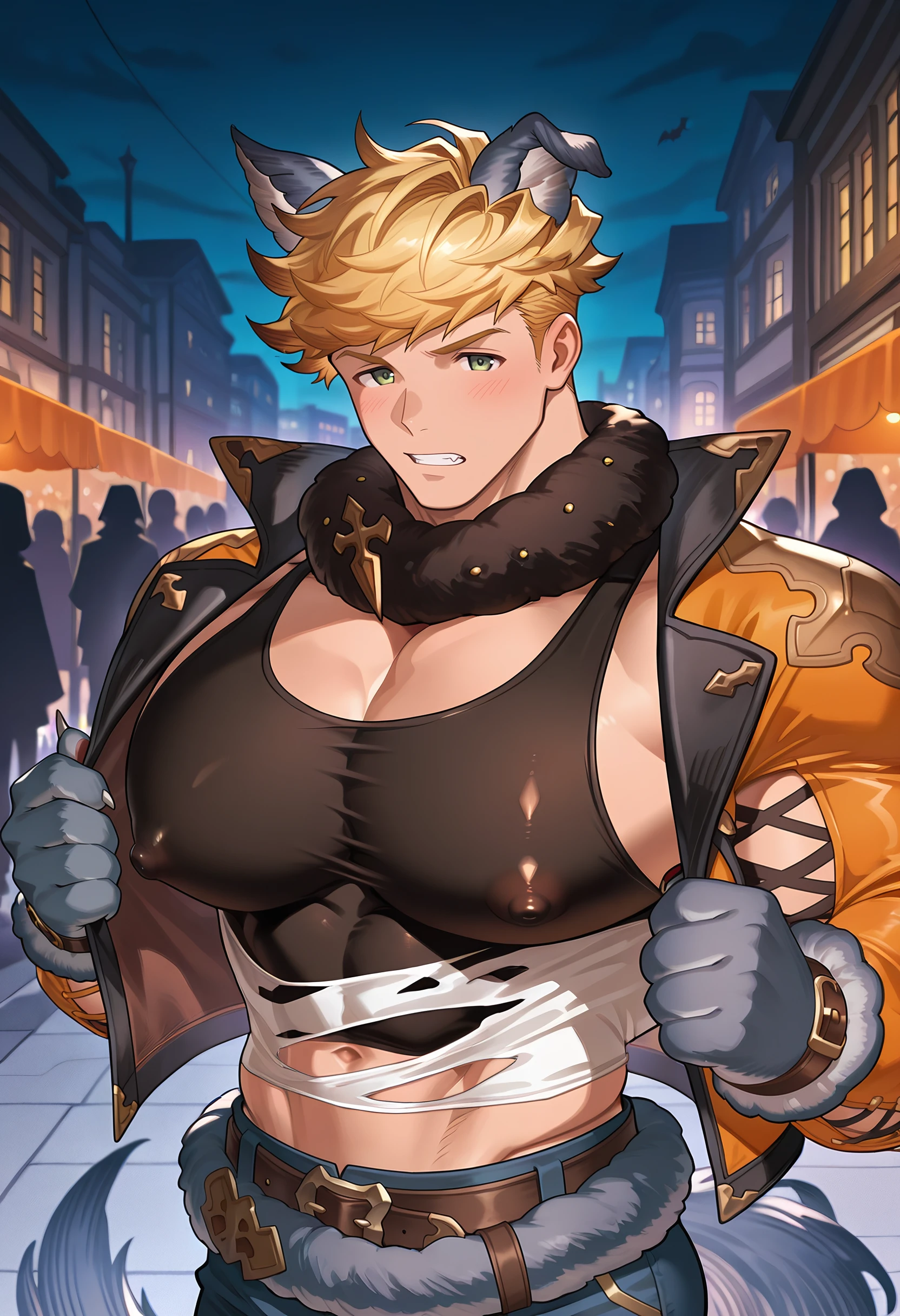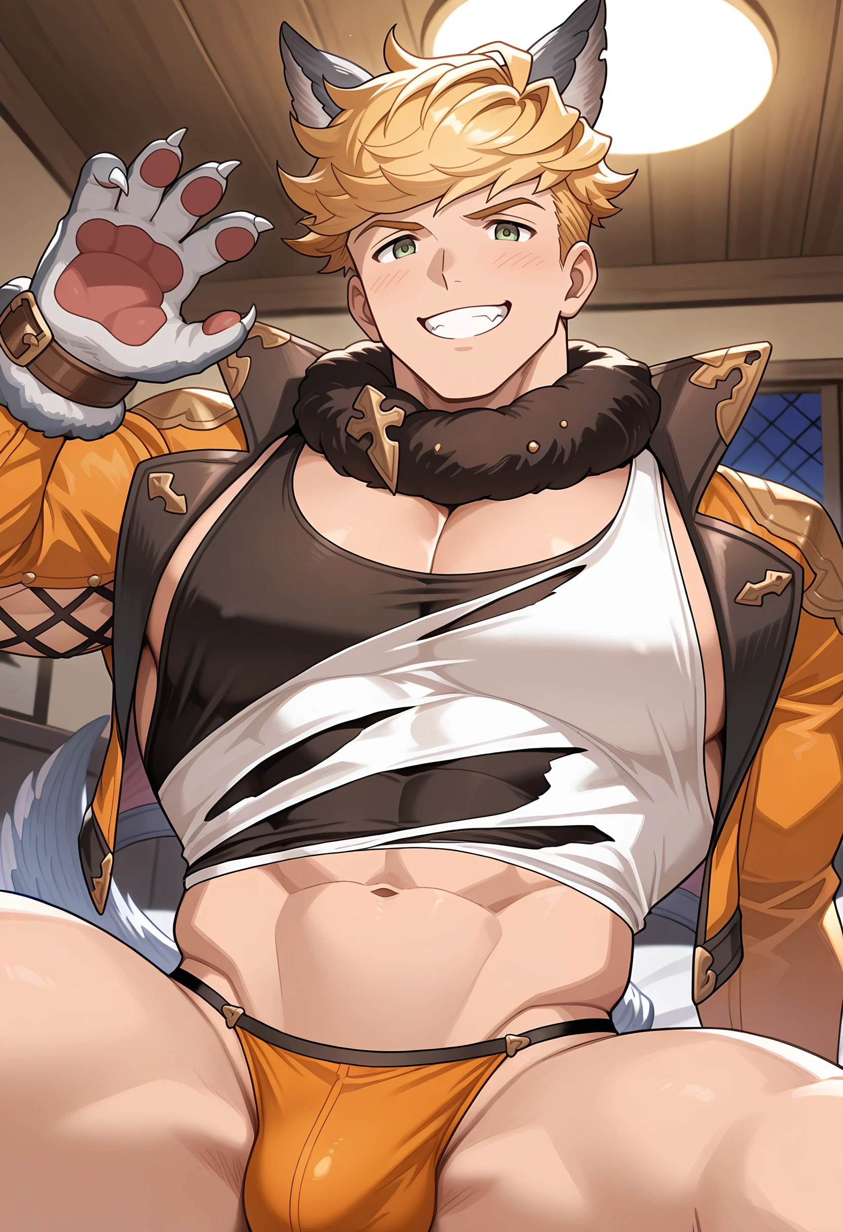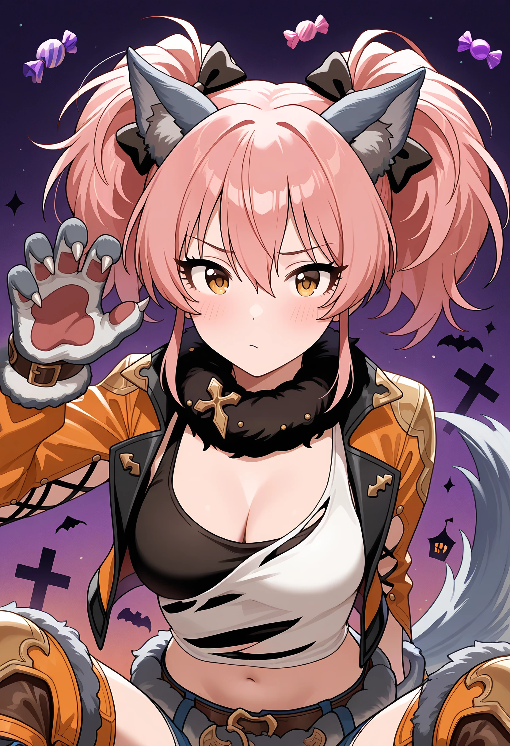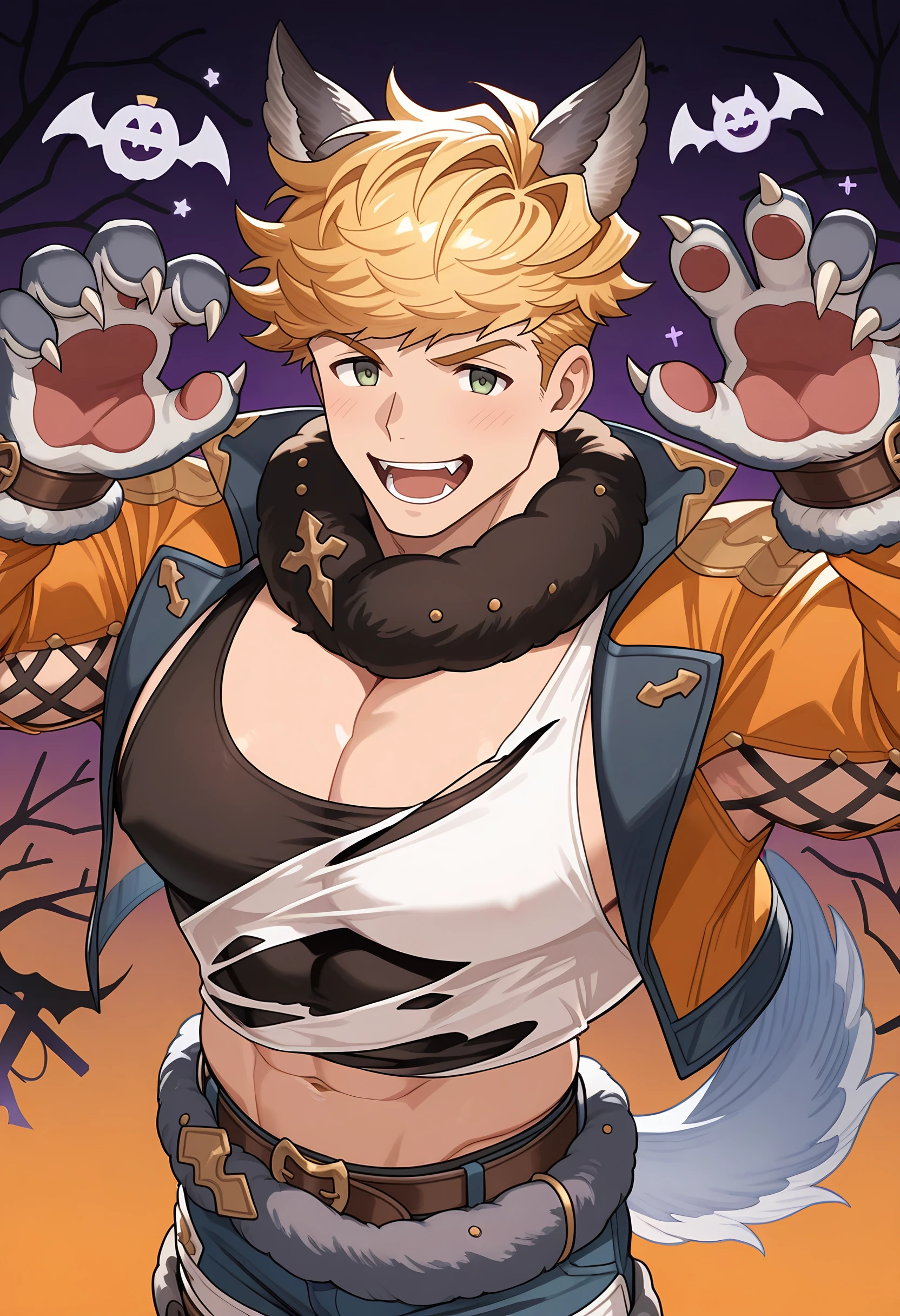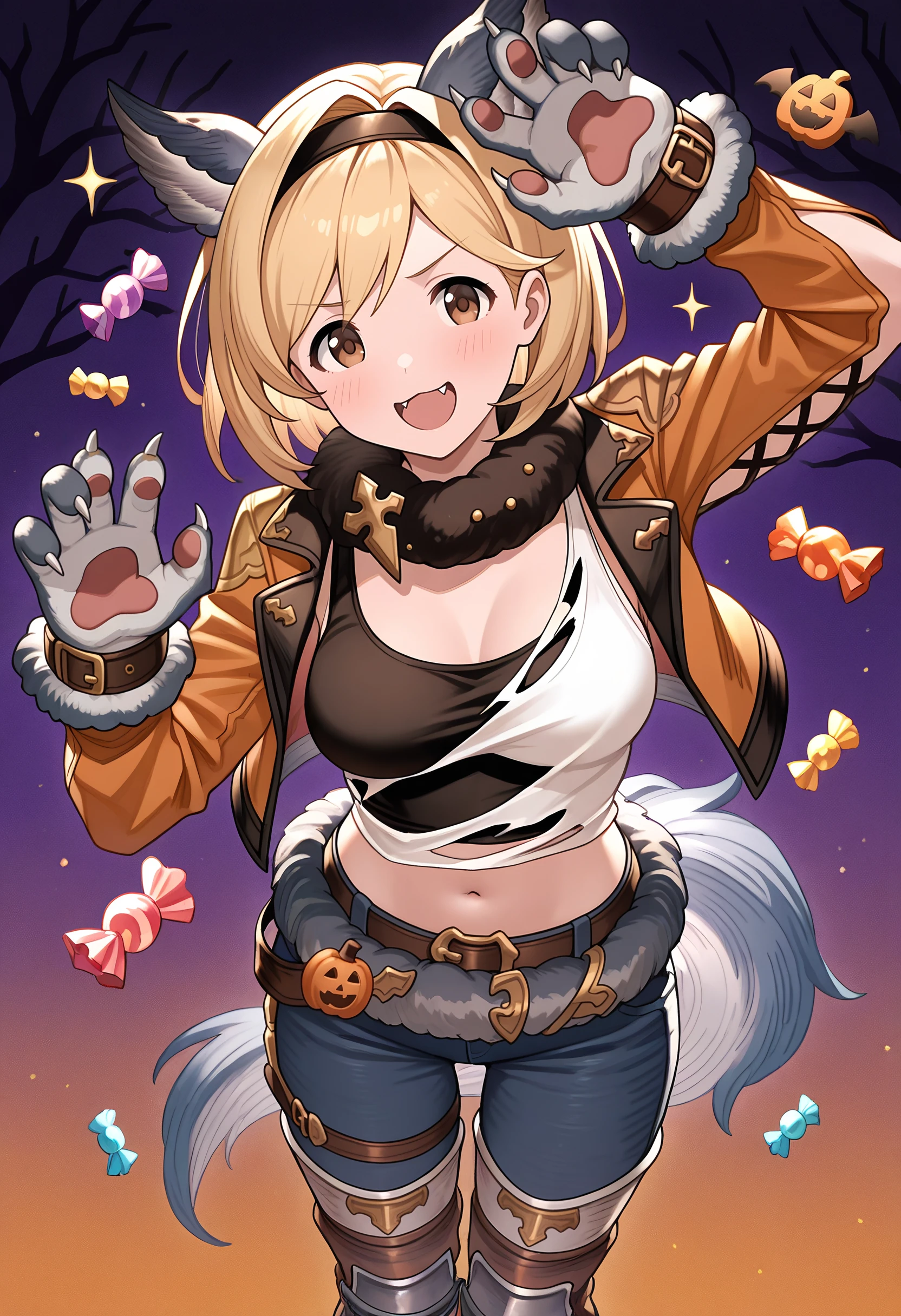 w4nd3rful_w0lf, official alternate costume, halloween costume, animal ears, wolf ears, fur collar, cross-laced clothes, cross-laced slit, cropped jacket, black tank top, torn clothes, torn shirt, white shirt, orange jacket, open jacket, open clothes, fur-trimmed belt, pants, knee pads, wolf paws, tail, wolf tailRecommended Checkpoints: