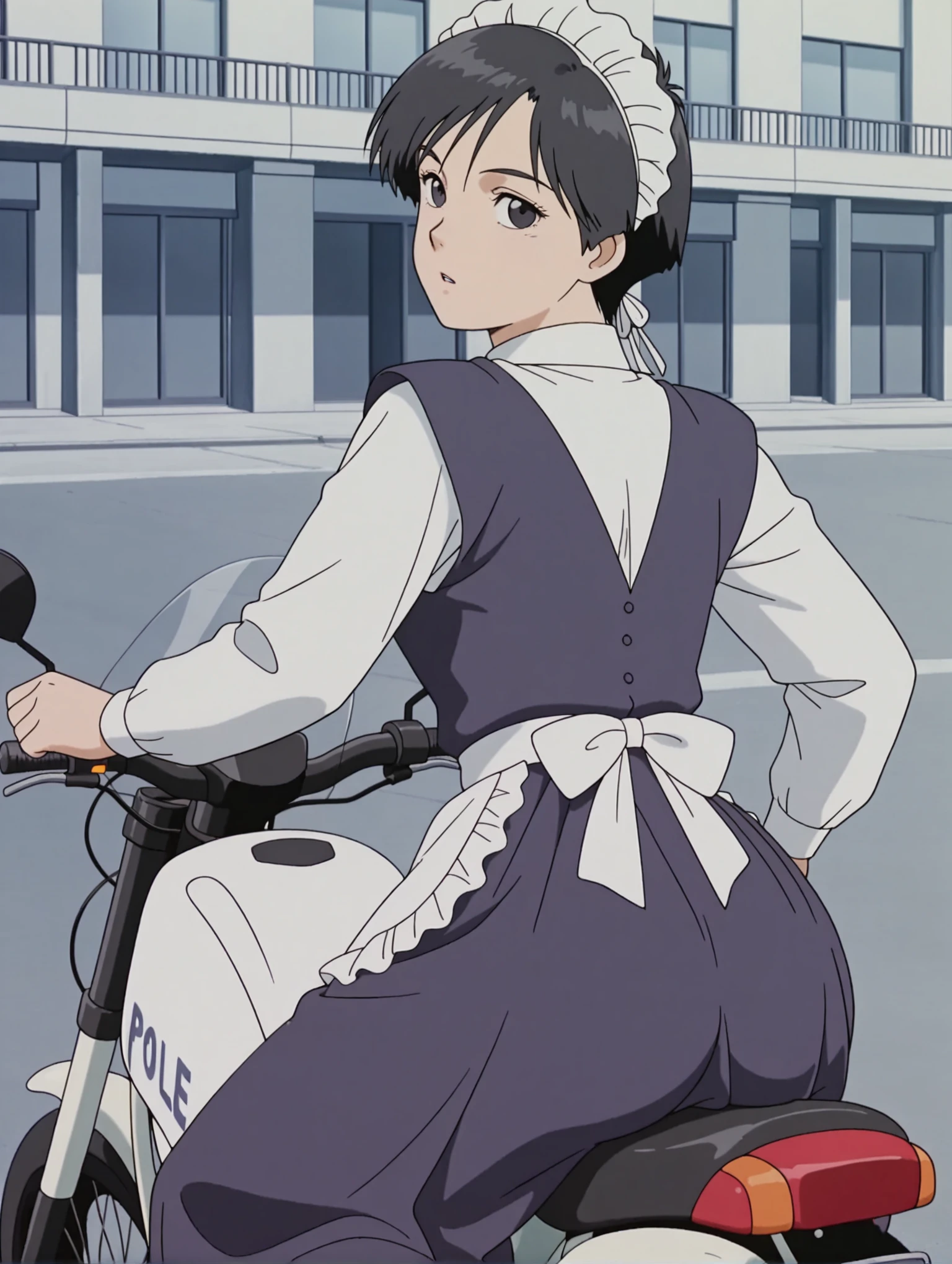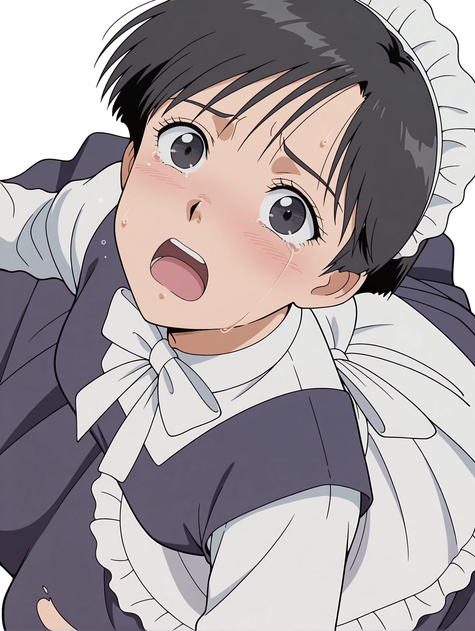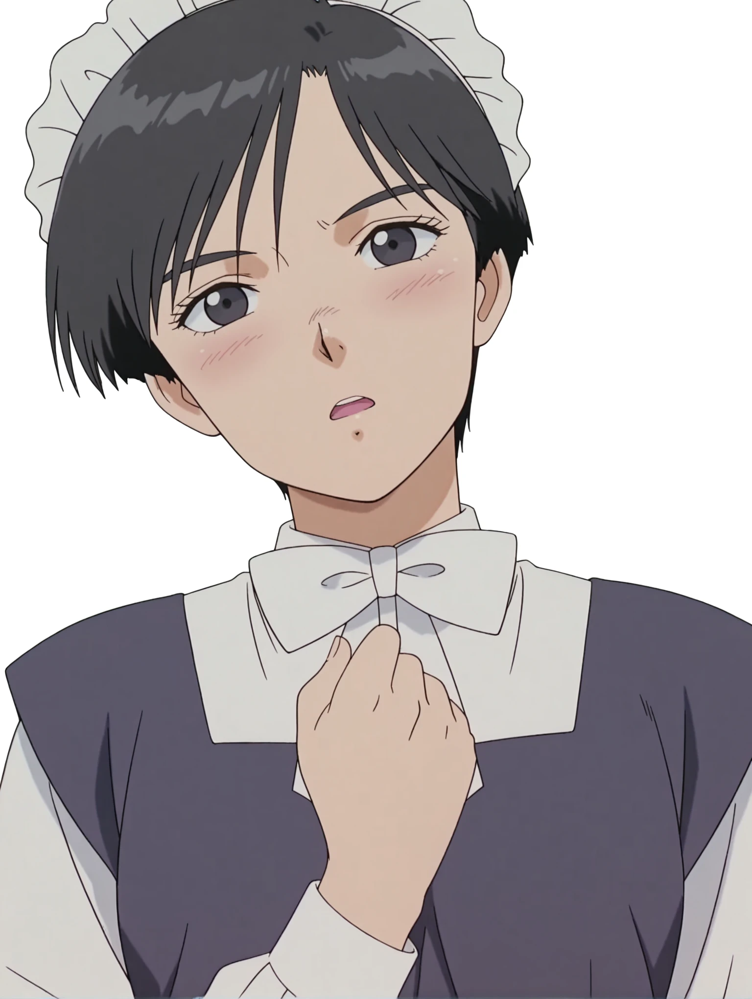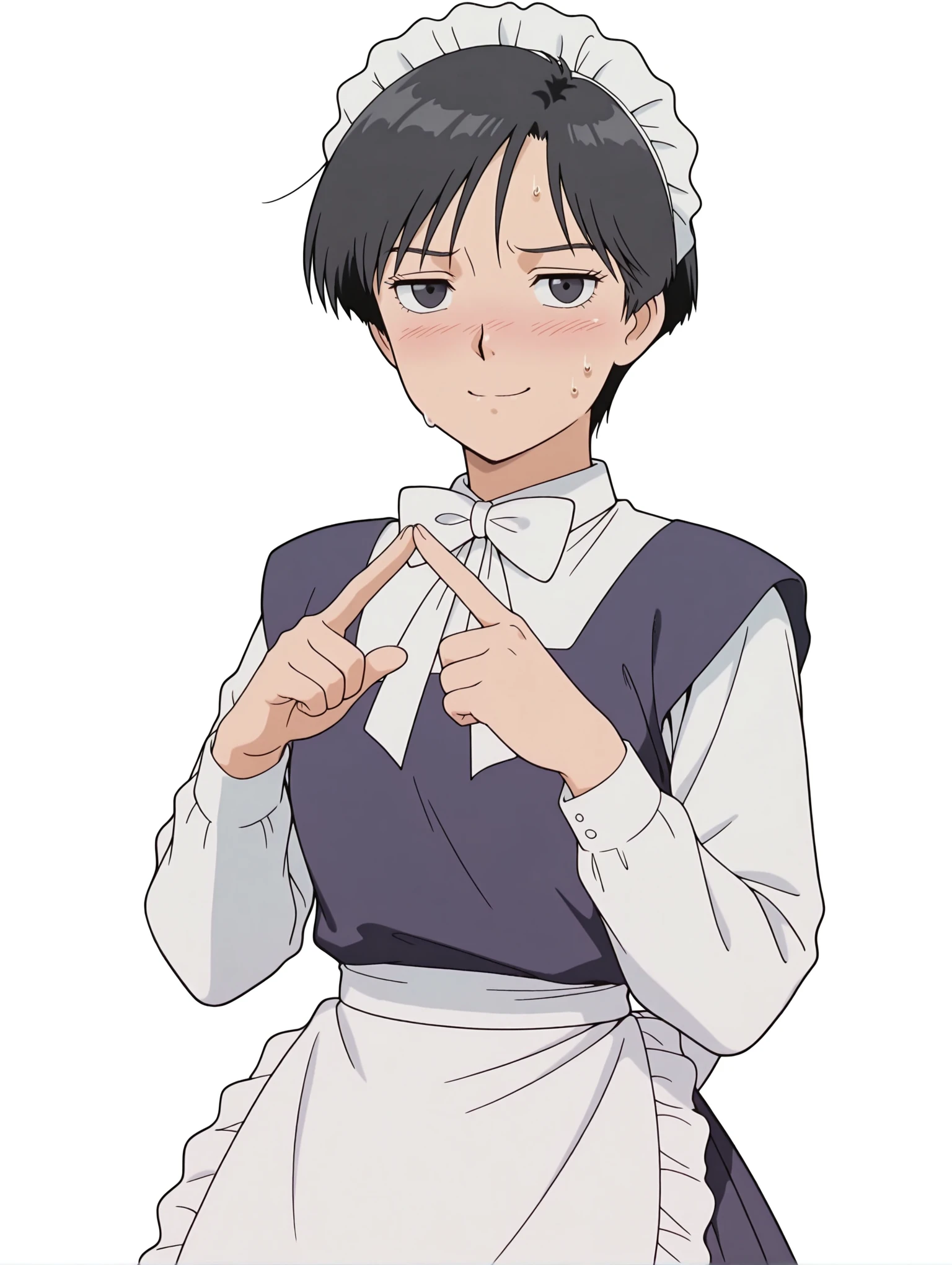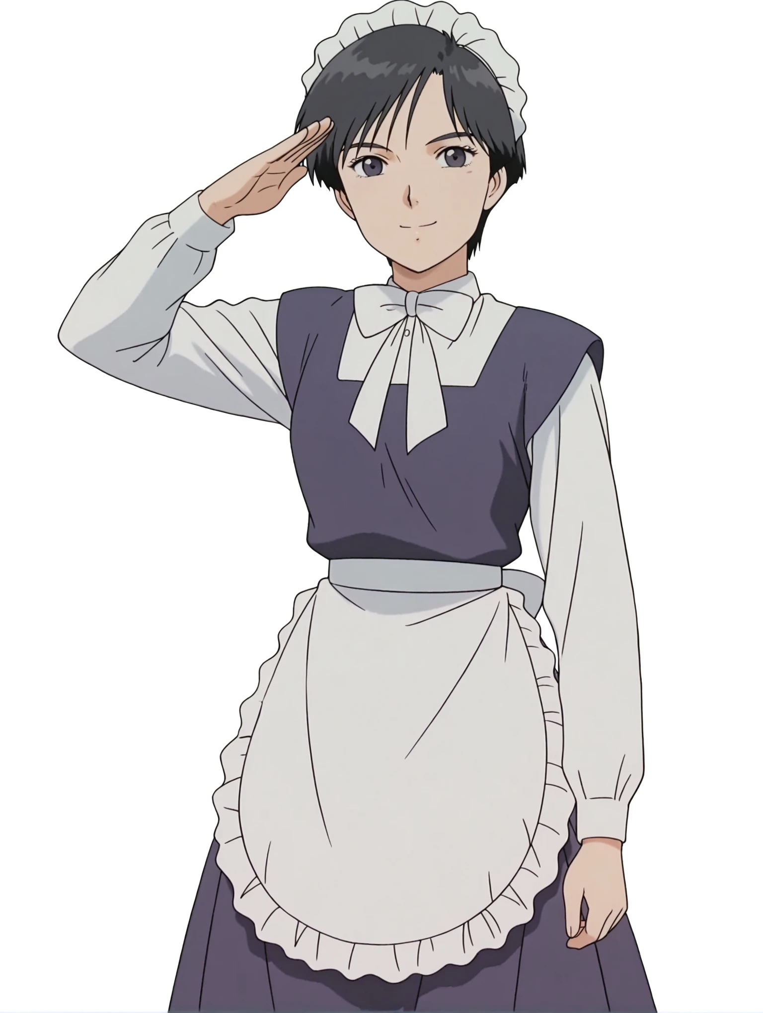 衣装(未学習)・maid headdress,white bowtie,white dress shirt,maid dress,long sleeves,frilled apron,long_skirt,purple shoes,