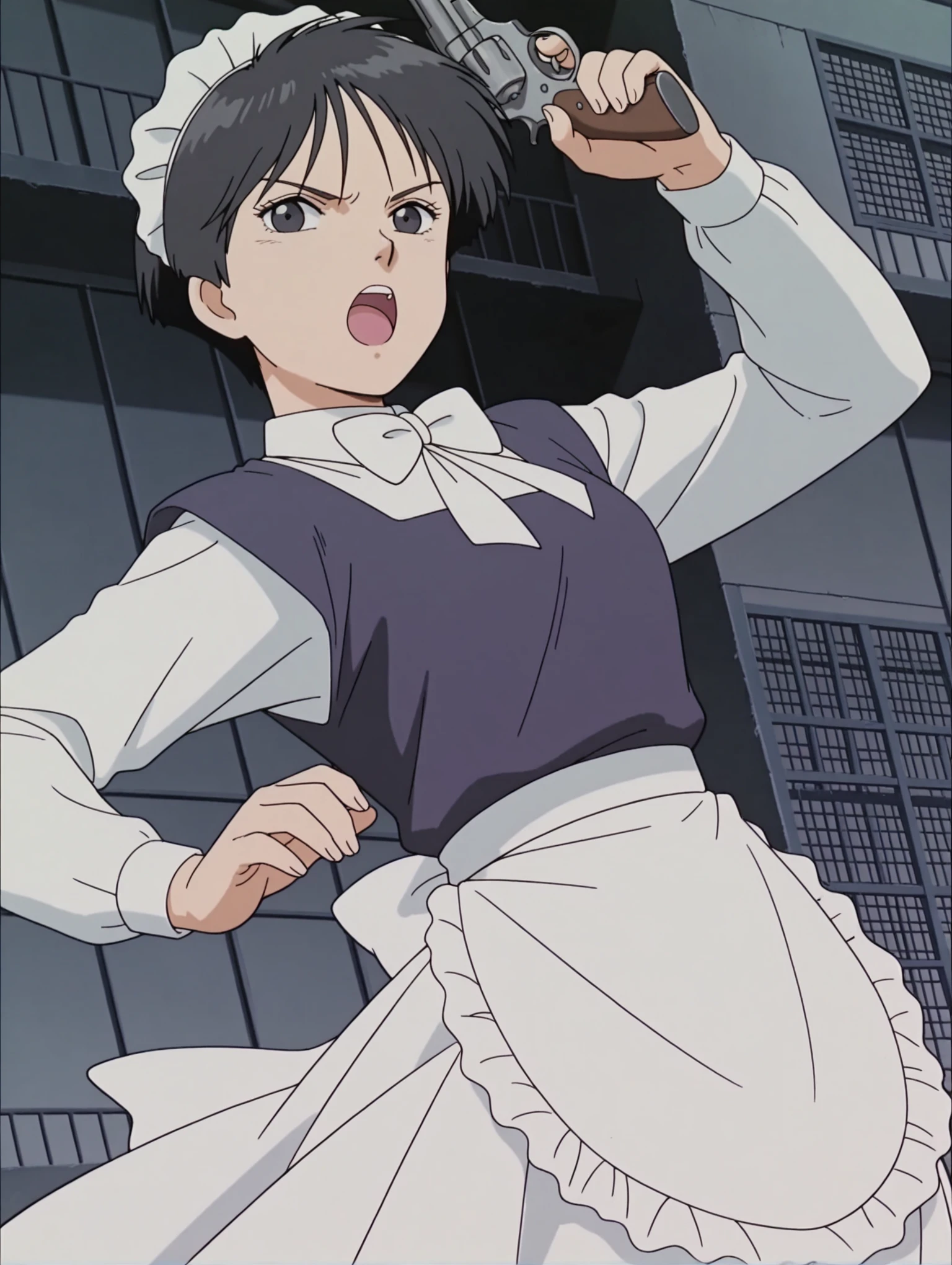 maid headdress,white bowtie,white dress shirt,maid dress,long sleeves,frilled apron,long_skirt,purple shoes,