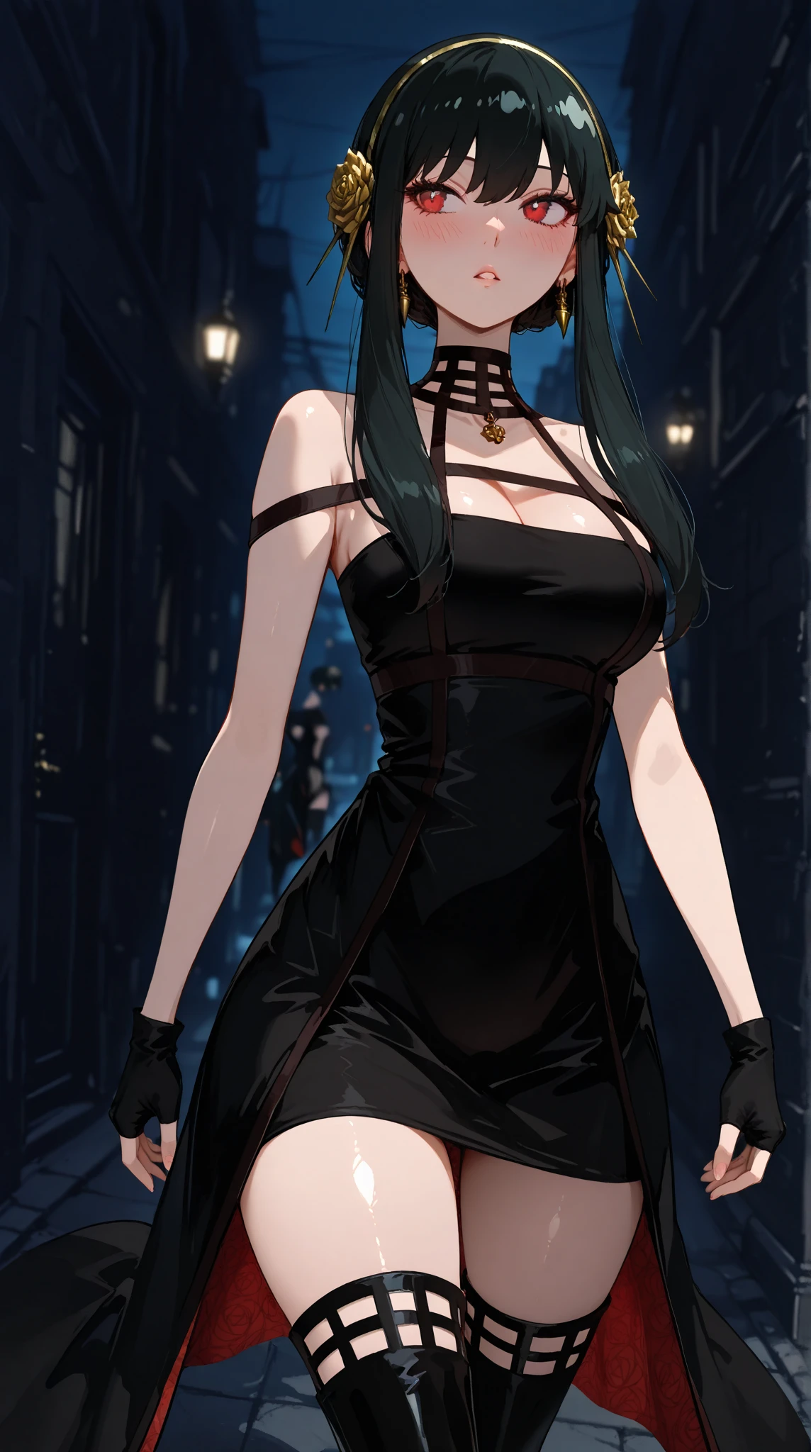 short_hair_with_long_locks, hair_ornament, dress, bare_shoulders, jewelry, hair_flower, black_dress, sleeveless_dress, fingerless_gloves, ,two-sided_fabric, gold_hairband, two-sided_dress, ,black_thighhighs, boots