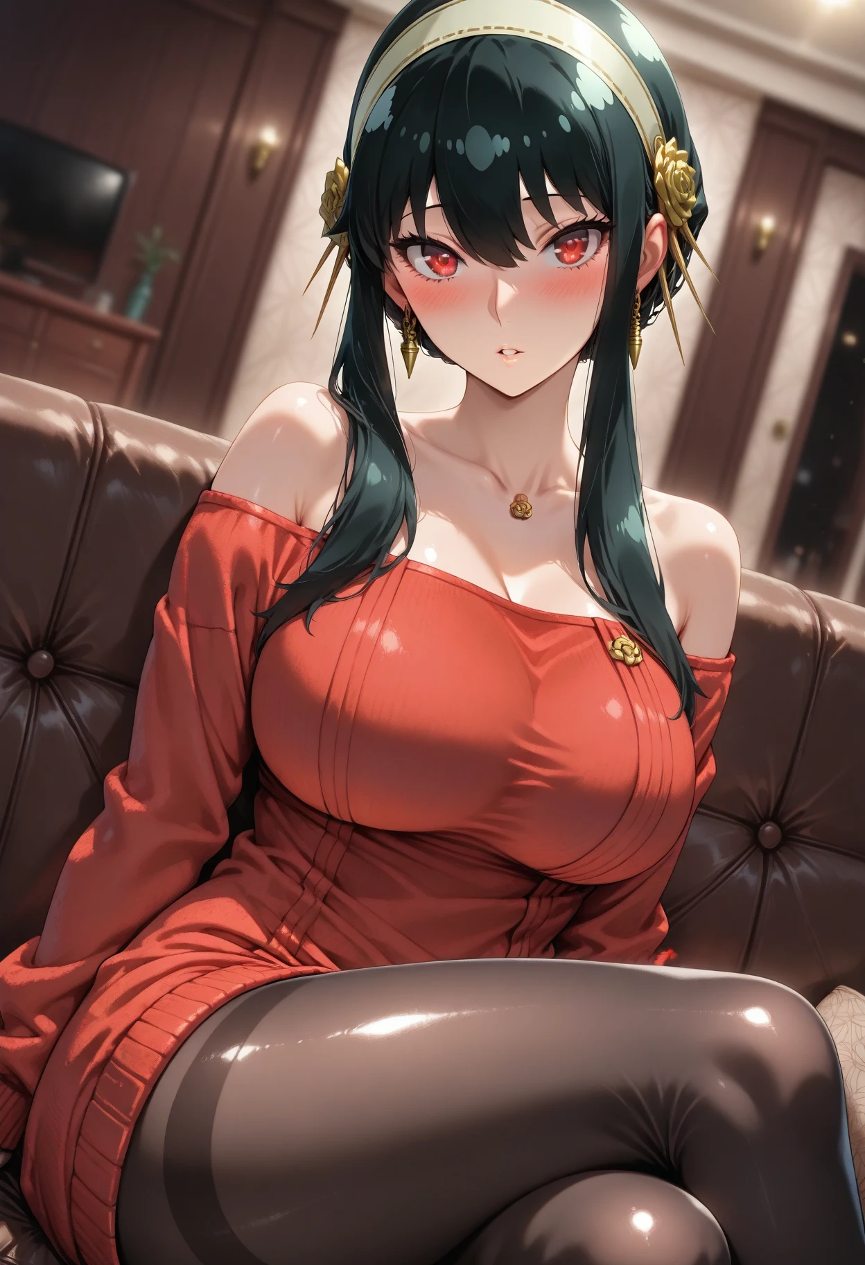 earrings, gold_earrings, hairband, long_sleeves, dress, bare_shoulders, jewelry, pantyhose, thighs, off_shoulder, sweater, black_pantyhose, thighband_pantyhose, sweater_dress, off-shoulder_sweater, red_sweater, bare_neck,