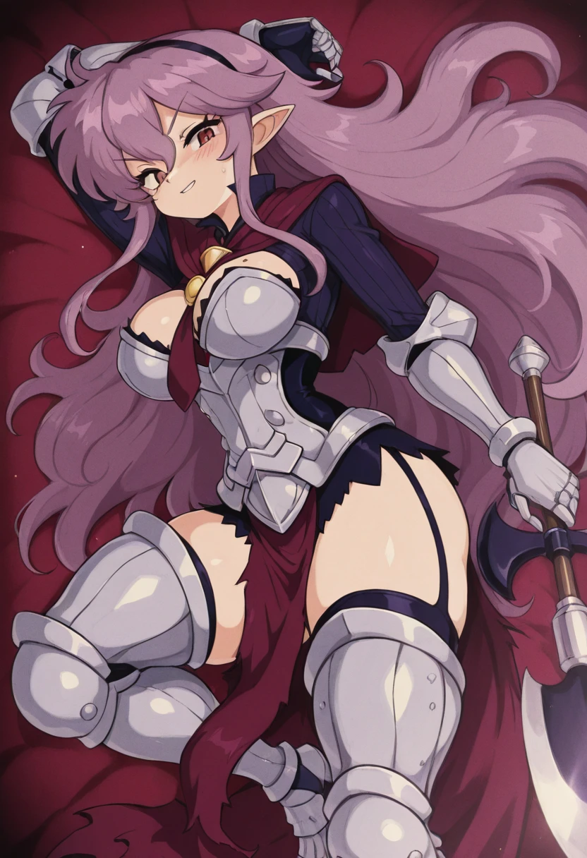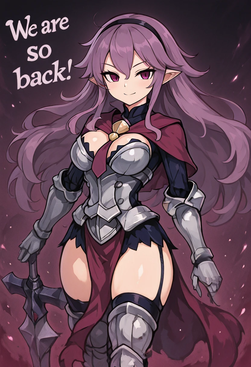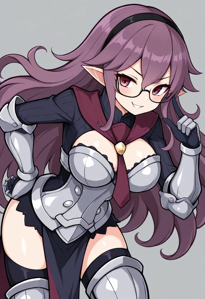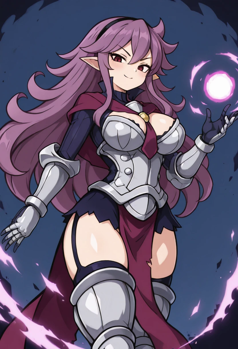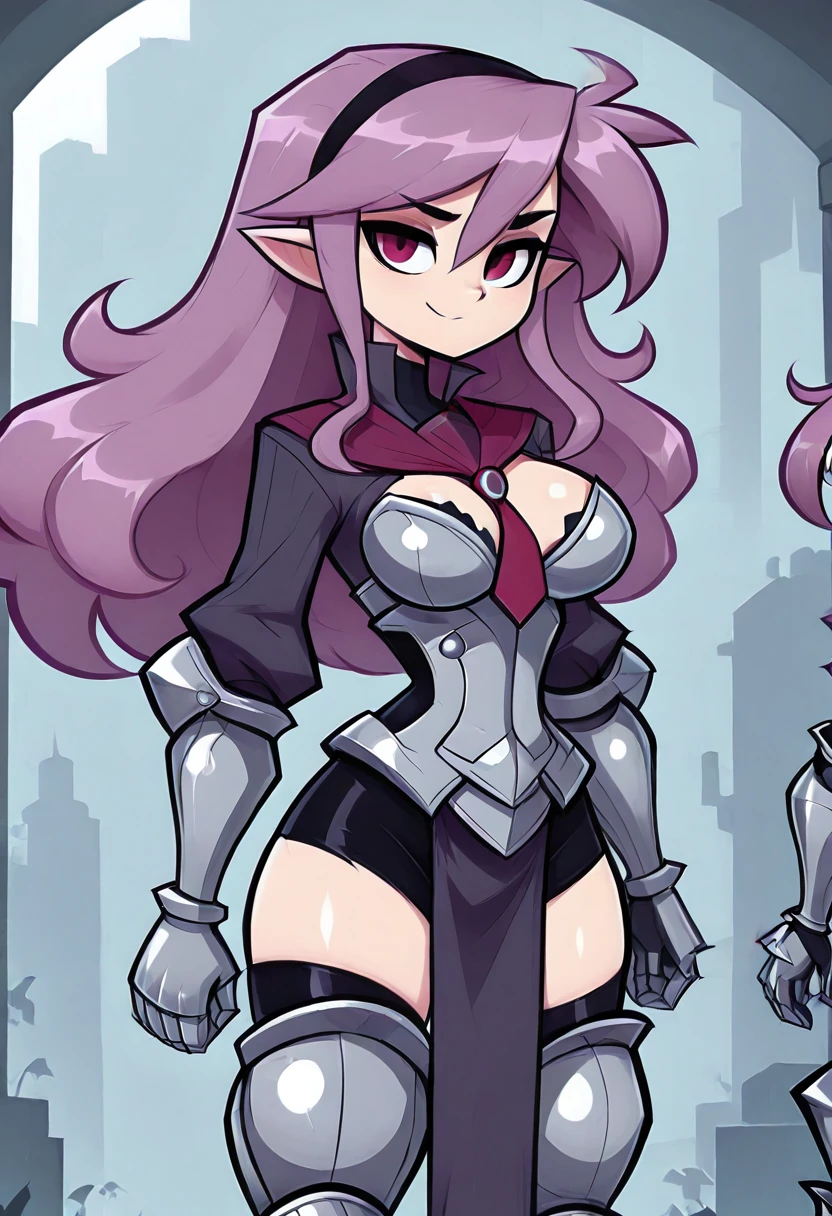 zzHeavyKnight, red eyes, purple hair, long hair, pointy ears, wavy hair, hairband, armor, gauntlets, red necktie, boobplate, breastplate, greaves, silver boots, thigh boots, pelvic curtain,