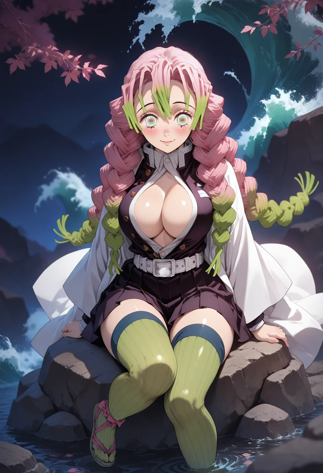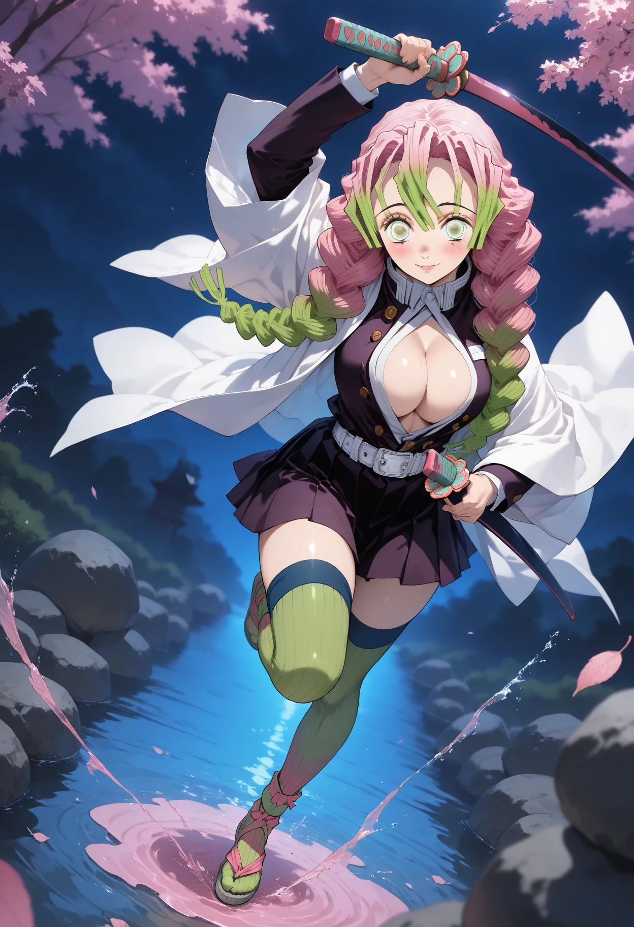 haori, partially_unbuttoned, demon_slayer_uniform, white_belt, miniskirt, black_skirt, green_thighhighs, ribbed_legwear, sandals, zettai_ryouiki