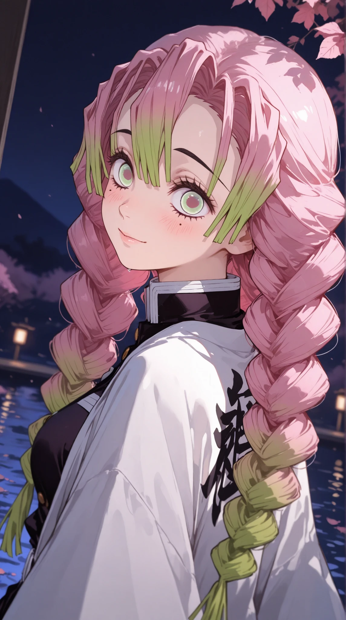kanroji_mitsuri, long_hair, pink_hair, twin_braids, multicolored_hair, two-tone_hair, green_eyes, mole_under_eyes