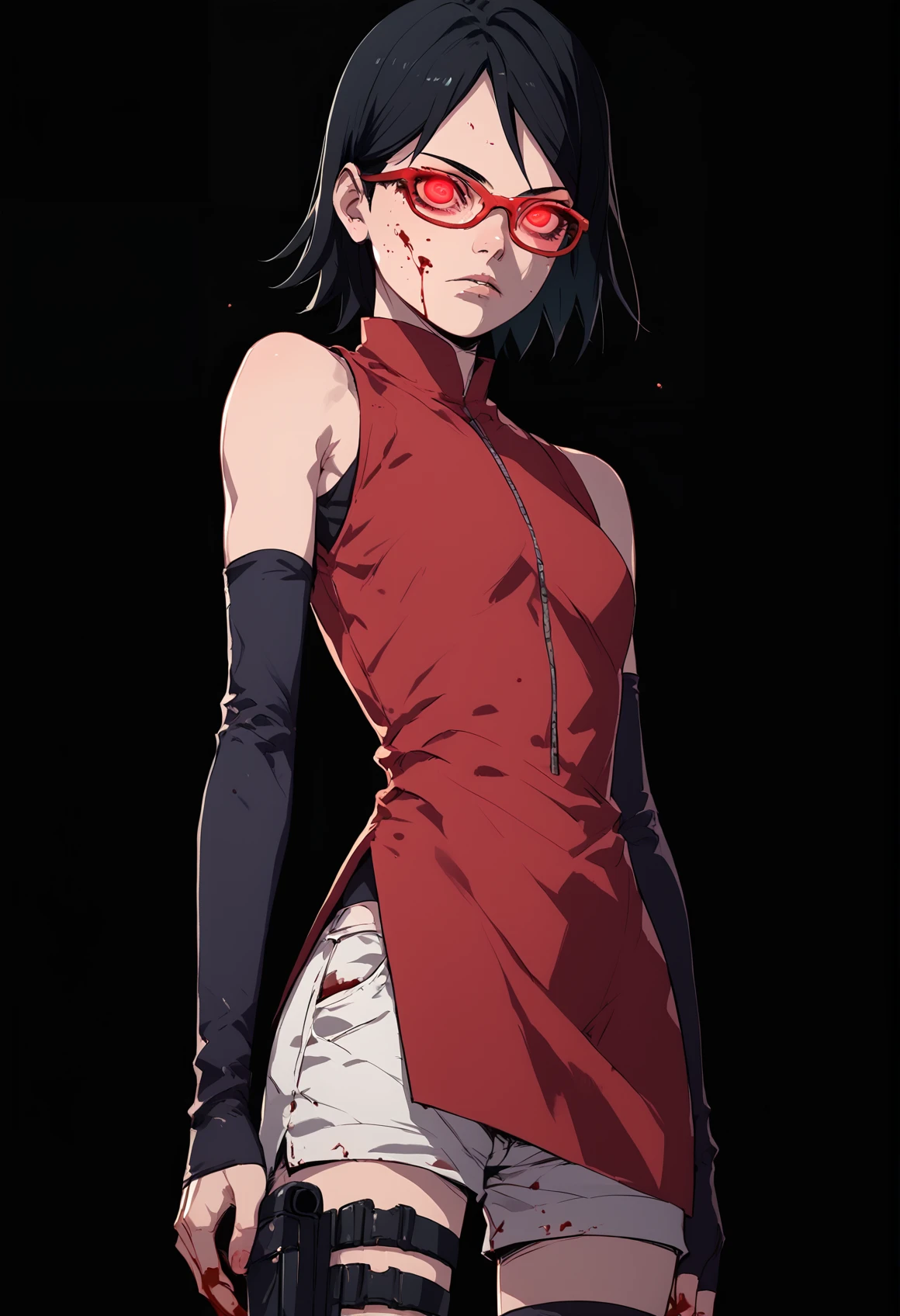 Prompts are : Sarada Uchiha, solo, 1girl, black hair, short hair, red-framed eyewear, glasses, black eyes