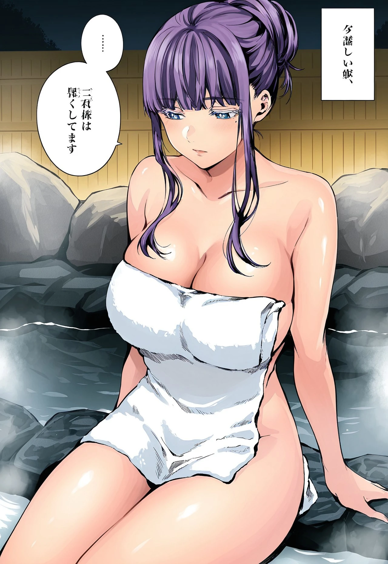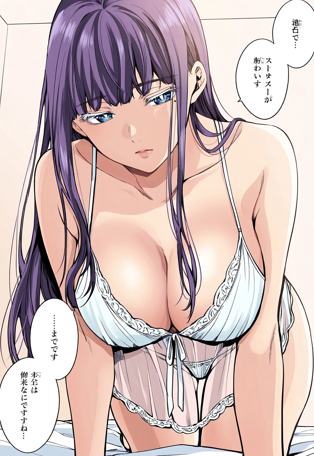 mira suou, long straight purple hair, white eyelashes, bangs, blue eyes, white pupils, large breasts, wide hips, mole under left eye, manga, world’s end harem