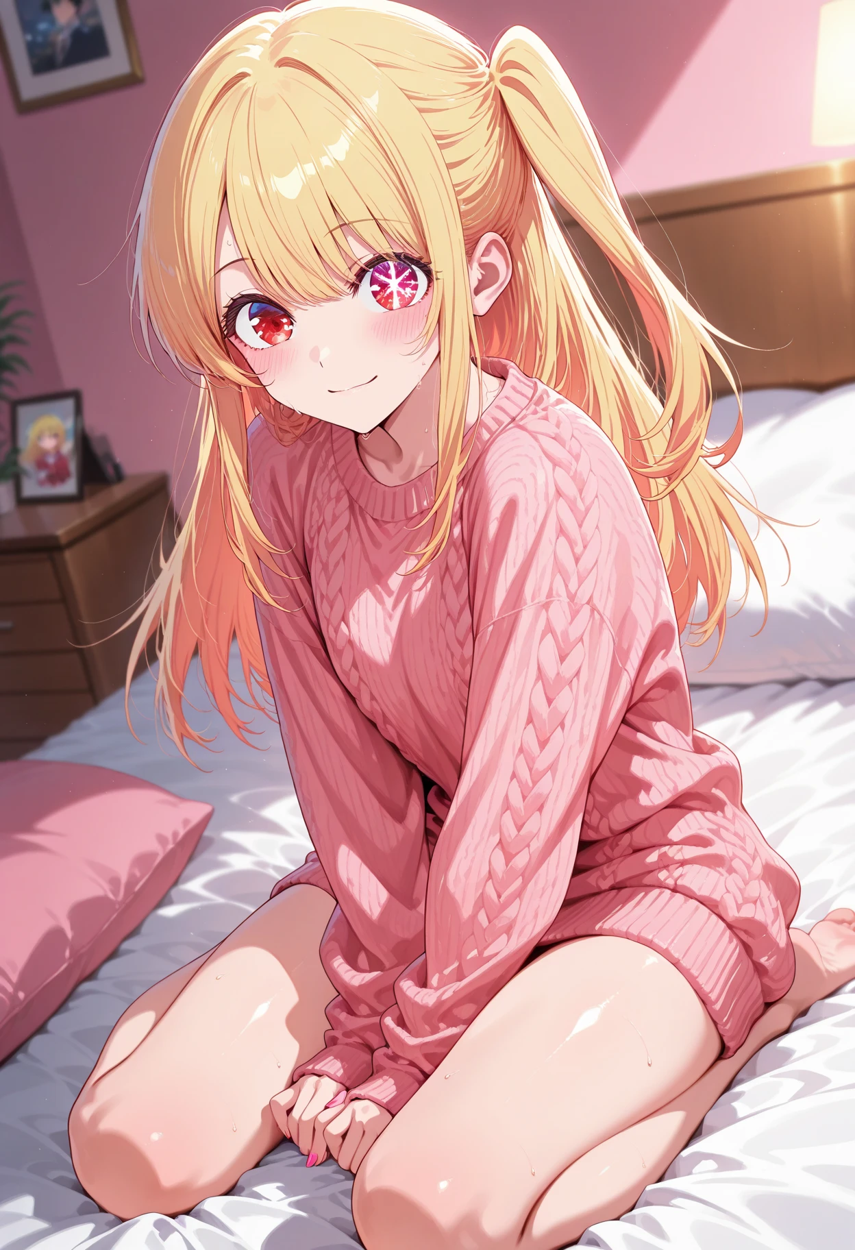 sweater, sleeves_past_wrists, pink_sweater, cable_knit, aran_sweater, pink_nails, thighs