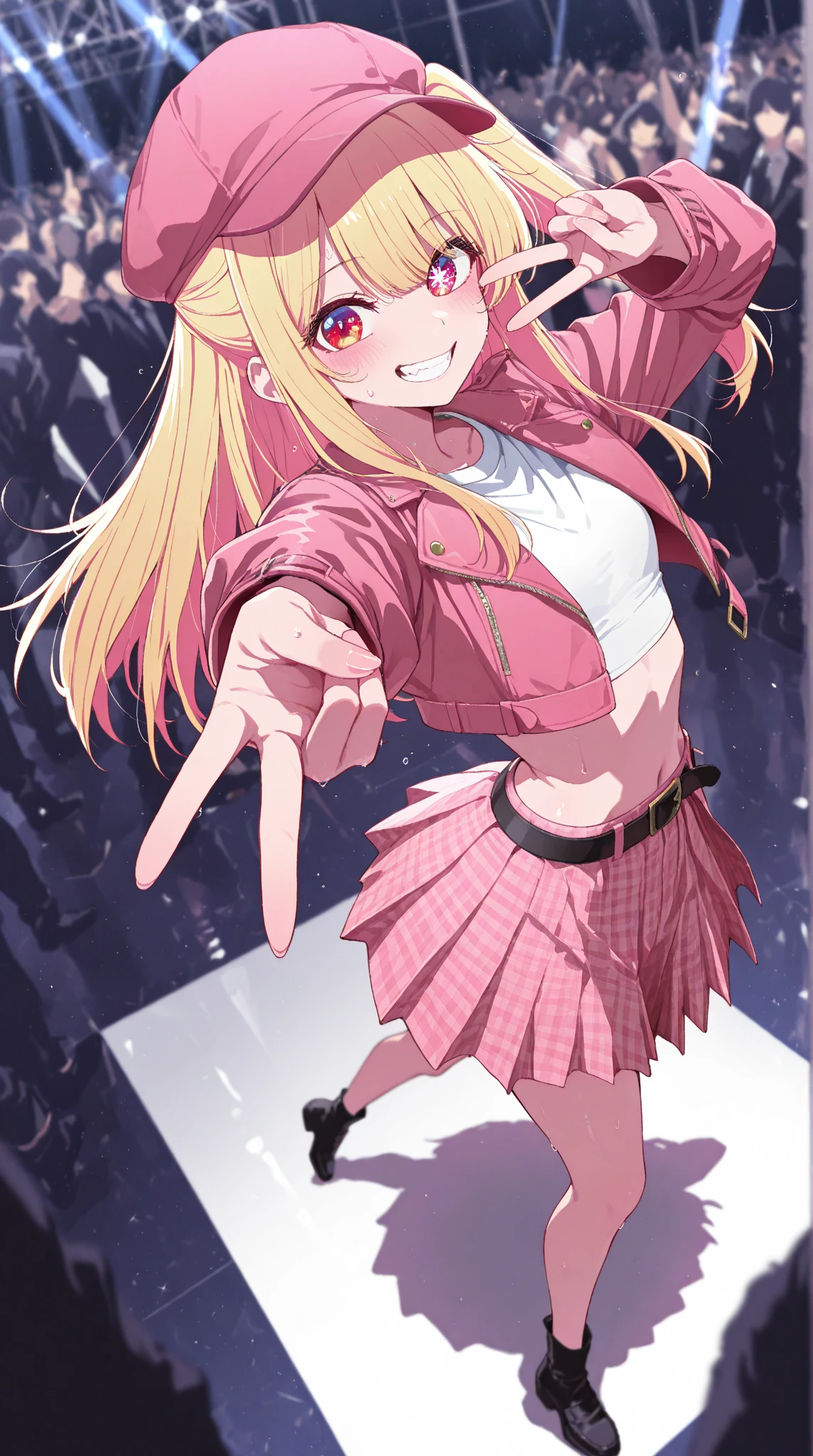 shirt, long_sleeves, hat, pink_jacket, white_shirt, open_jacket, cropped_jacket, pink_skirt, checkered_skirt, midriff, belt, pink_headwear, pleated_skirt