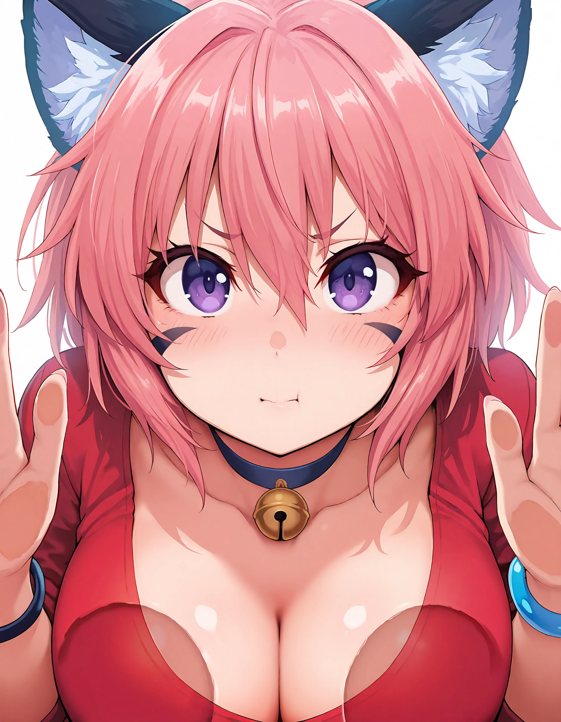 neck bell, chocker, red shirt, cleavage, black thighhighs, toeless legwear, bottomless, bracelet,