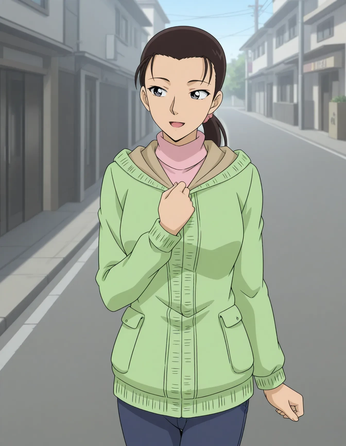 pink scrunchie,light green jacket,hooded jacket,sweater jacket,long sleeves,light pink turtleneck,blue pants,red sneakers,